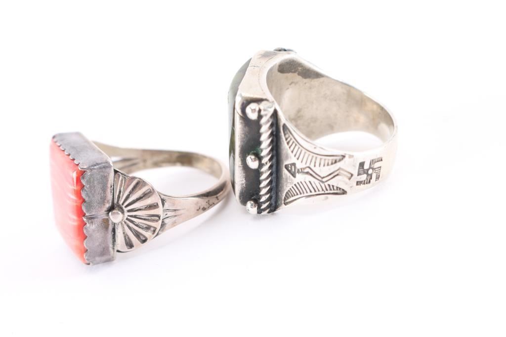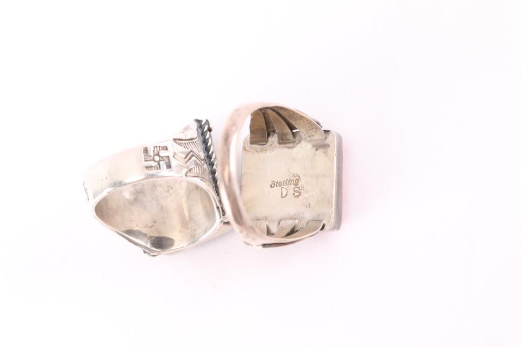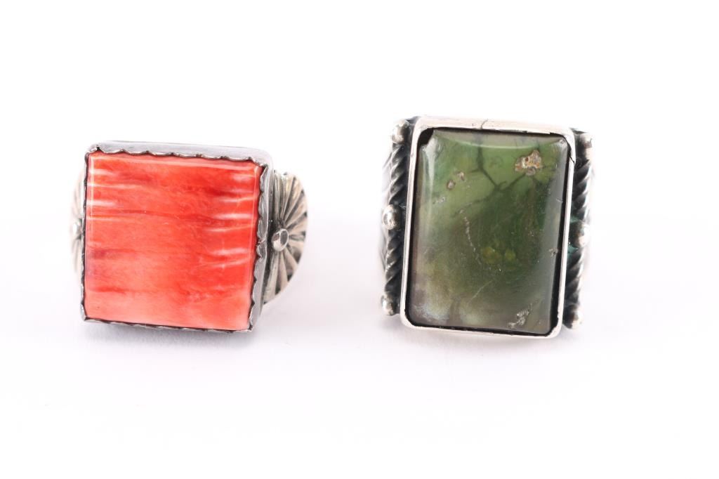 One ring has a large rectangle of green turquoise in sterling silver stamped design with arrows and twirling good luck symbols. Size 9 1/2. The other has a square of spiny oyster set in sterling silver design, maker marked D S. Size 12.