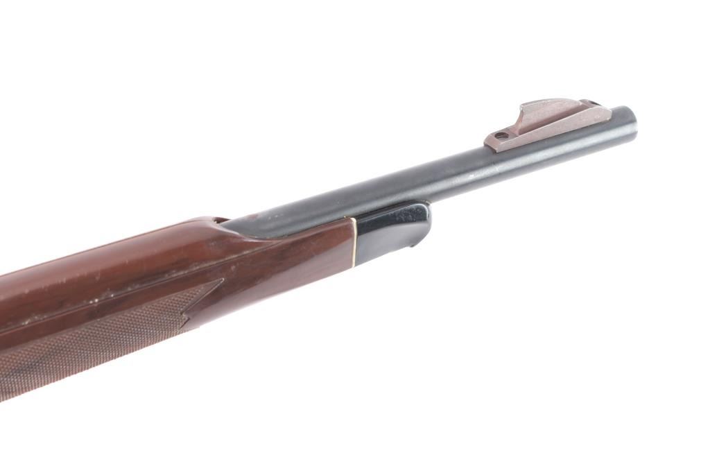 The Remington Mohawk 10C is part of the Nylon series. Produced from 1971 to 1978, with roughly 129,000 manufactured. Remington Mohawk 10 C in .22 Long Rifle with one, ten round removable magazine and a 19" barrel. Serrated composite butt plate. Checkered composite stock and front forend. Composite trigger guard, serrated charging handle and serrated trigger. Blued metal receiver and barrel. Mag well located serrated magazine release. Rear adjustable and front fixed blade sight. Bore is excellent/bright, finish and stock are overall very good with scratches/handling marks. Manufactured 1978.