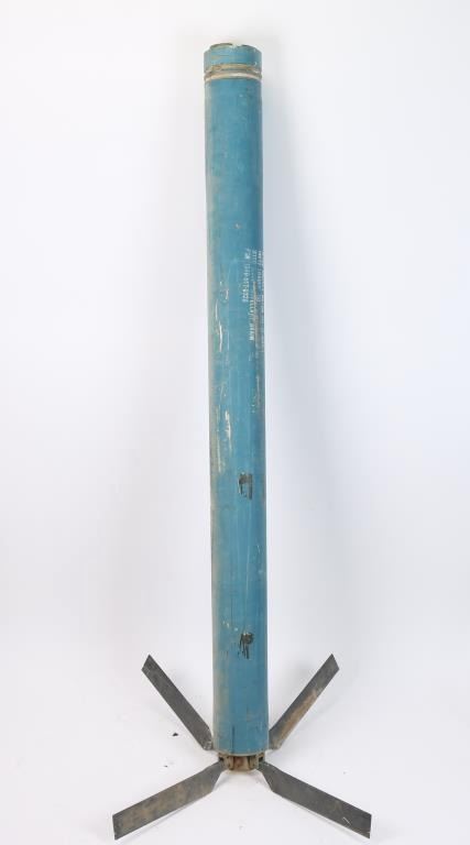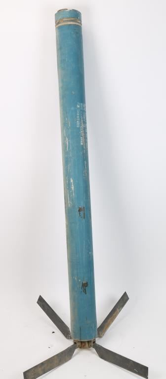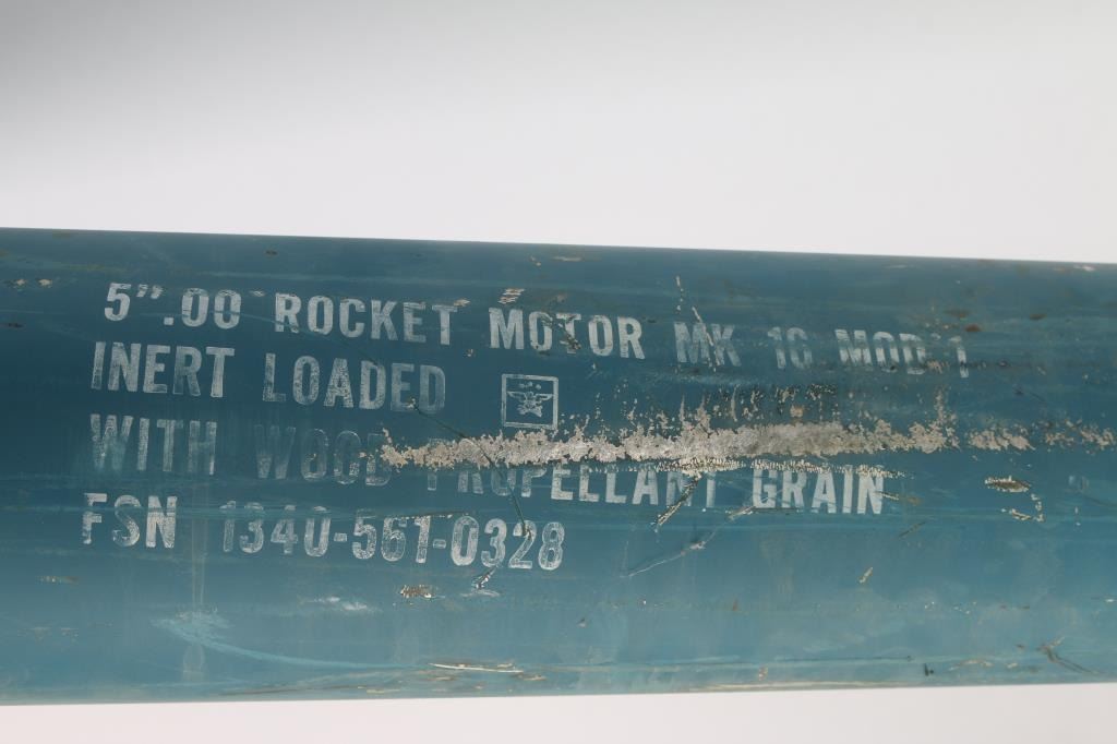 ***INERT*** Blue colored practice rocket body w/intact folding fins. Marked, "5".00 ROCKET MOTOR MK 16 MOD 1 INERT LOADED WITH WOOD PROPELLANT GRAIN FSN 1340-561-0328" and stamped, "10001657383T MK 16-1 LOT 16 - NTV - 0667 H. Measures 77.5" w/fins in launch mode (folded to the rear) and 65" w/fins deployed. The Zuni is a 5.0 inch unguided rocket deployed by the United States armed forces. Later became laser-guided. The rocket was developed for both air-to-air and air-to-ground operations. It can be used to carry various types of warheads, including chaff for countermeasures. It is usually fired from the LAU-10 rocket pod holding four rockets.