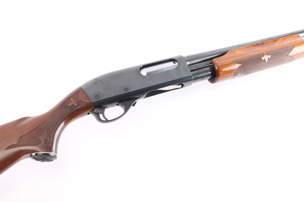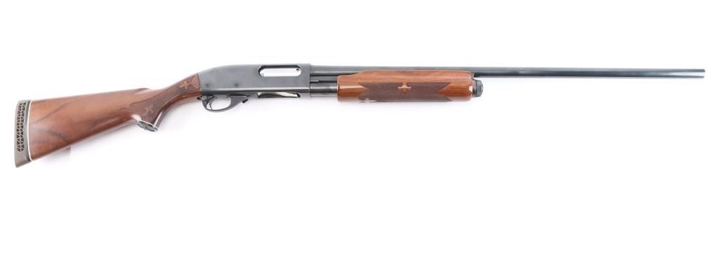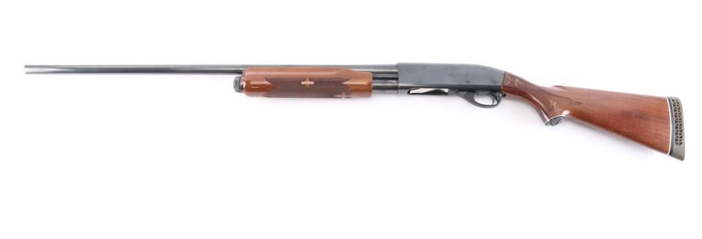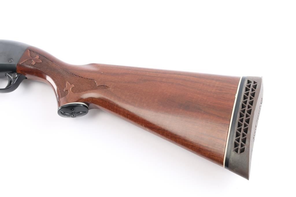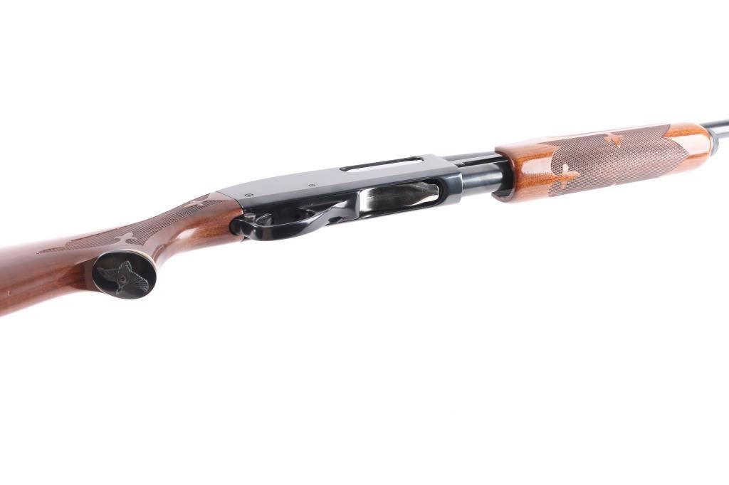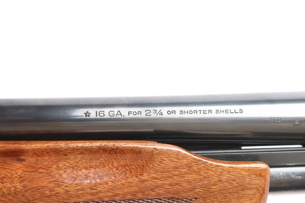 The 'Wingmaster' This is all American made pump action shotgun chambered for 2.75" 16 gauge shells. It features a 28" blued round barrel with a steel front sight, Fixed Modified choke. It sports a 4 shot magazine tube, alloy trigger guard and smooth, trigger. The walnut stock has checkered grip, checkered, contoured forearm, Remington brown vented recoil pad, grip cap with white spacer, duel action bars. Bore looks is excellent/bright, action is smooth, wood is excellent. Blue is about 98% with some very minor scratches on the receiver, and minor friction wear on the tube. LOP is 14".