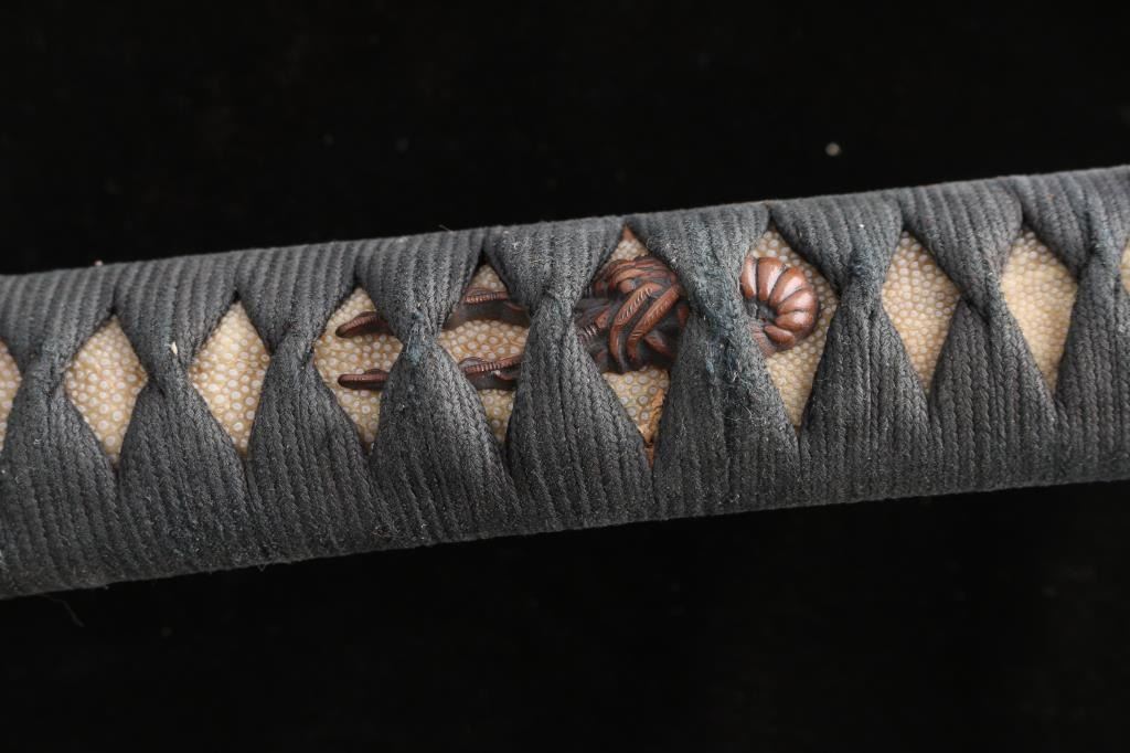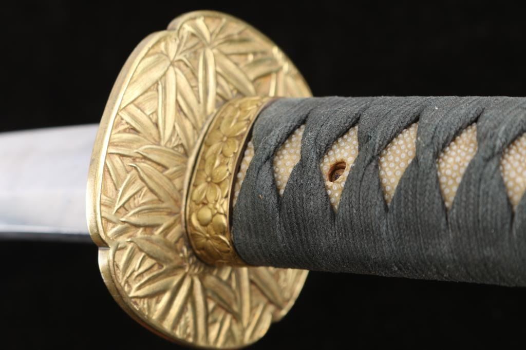 Believe mid Edo period. 26" long point blade, the temper line (Hamon) is clearly visible, and is of the wavy O-Notare (large, sweeping waves) type. Ray skin wrapped grip, black cloth wrapped with spiny lobster menuki, often called ebi in Japanese, represent longevity and prosperity. Furthermore, the lobster's hard shell and spiny appearance also suggest a resemblance to samurai armor, making it a fitting and auspicious design for sword fittings. The top of the brass colored alloy Kashira (pommel), Fuchi (collar) and the scabbard feature cherry blossom motifs. The brass colored alloy solid Tsuba, Mokko Gata shape, is decorated with with plants. The one hole tang is signed on both sides The wood orange lacquered scabbard is missing the fitting and there is some separation near the top of the two sides.