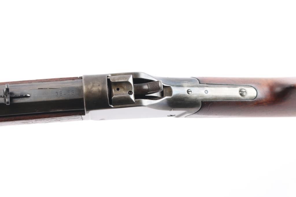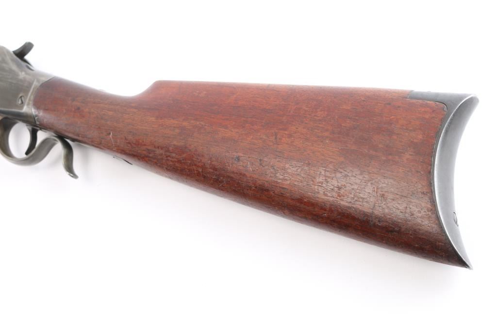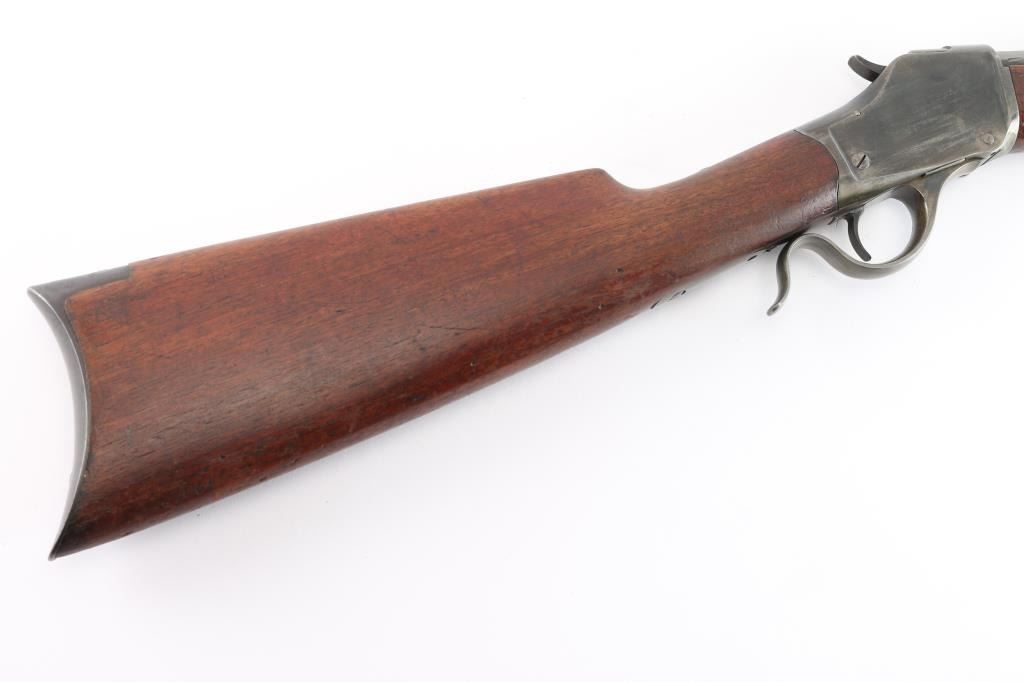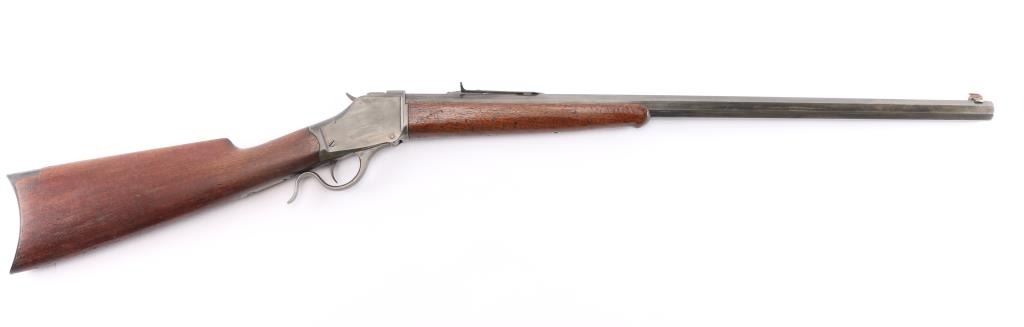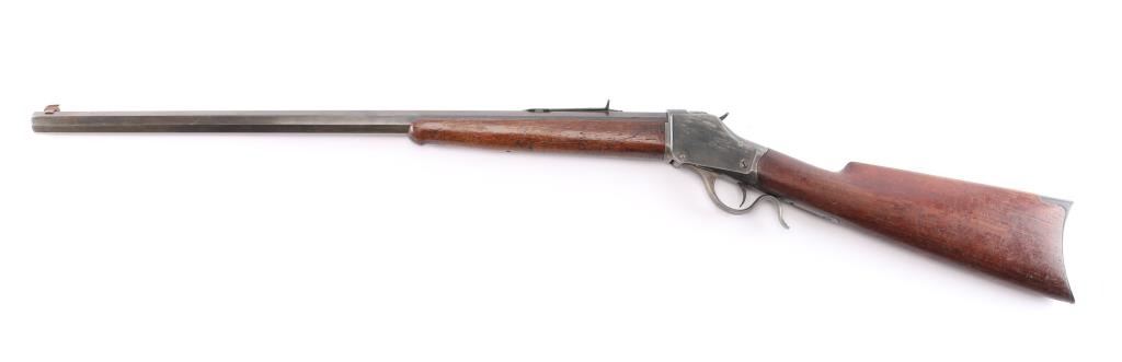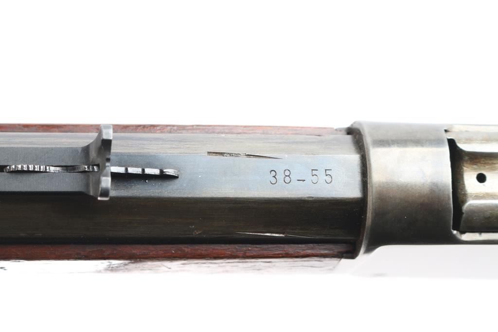 Winchester Model 1885 Hi Wall rifle in 38-55 caliber. 25 7/8" barrel shortened #3 octagon barrel. Rifle butt. refinished with restored markings, and replaced sights. Bore slightly rough. Stocks show many minor scratches and mars. But fit up to metal well. A good caliber for this nice-handling rife. Manufactured 1890.