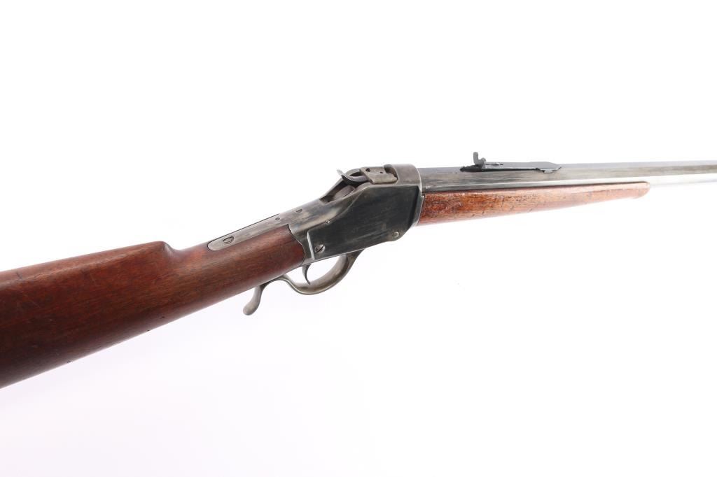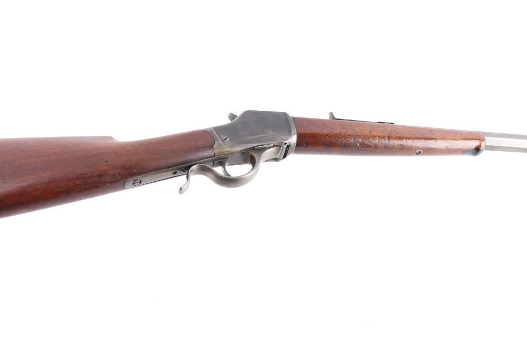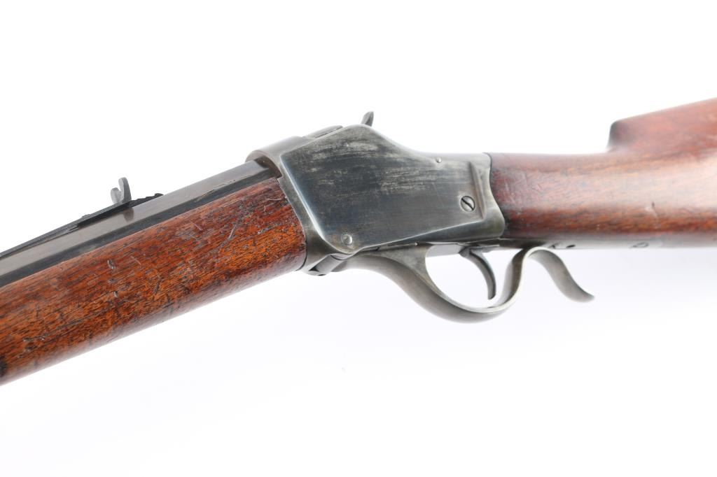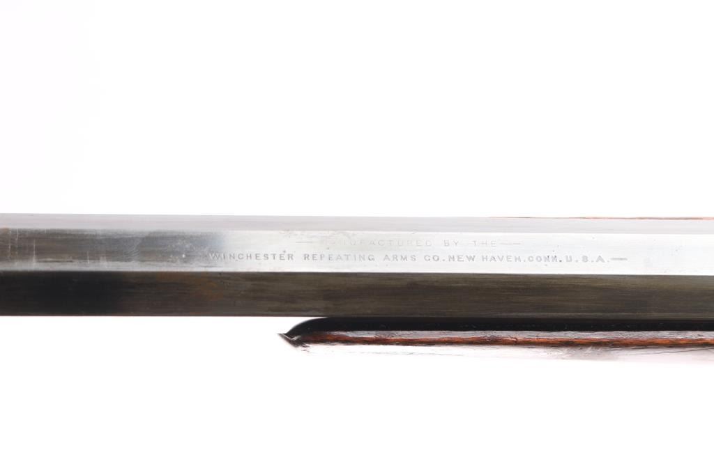 Winchester Model 1885 Hi Wall rifle in 38-55 caliber. 25 7/8" barrel shortened #3 octagon barrel. Rifle butt. refinished with restored markings, and replaced sights. Bore slightly rough. Stocks show many minor scratches and mars. But fit up to metal well. A good caliber for this nice-handling rife. Manufactured 1890.