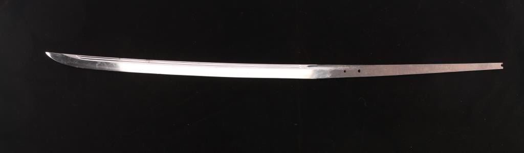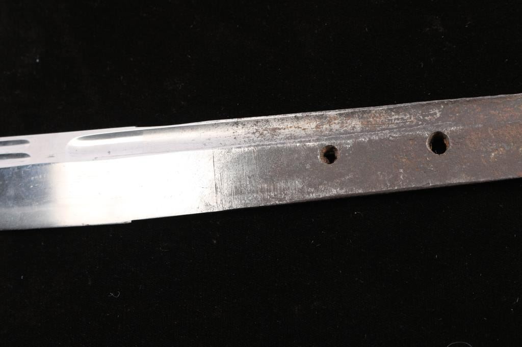 Original 23 2/4" Futasuji-hi (Double Bo-hi) blade with two identical and parallel grooves. Long tang with 40" overall length. No signature is visible on the tang, has surface rust. Two holes above the blade and one at the top, the top has a small section broken off. Blade is bright with some scratches, some dark patina, pitting on the top edge near the point and a very small nick on the sharpe edge near the point. Has the dimensions for a Nagamaki sword.