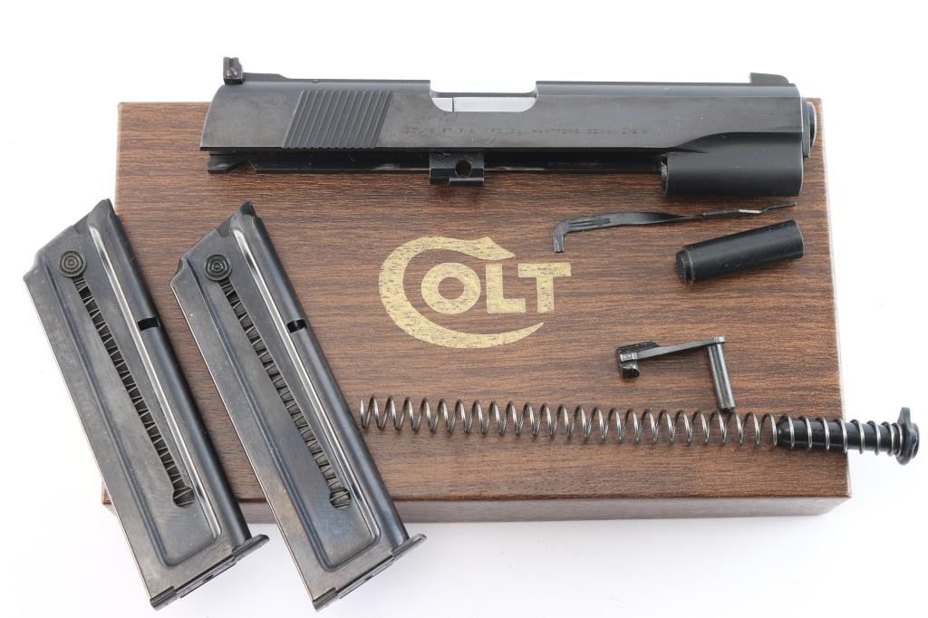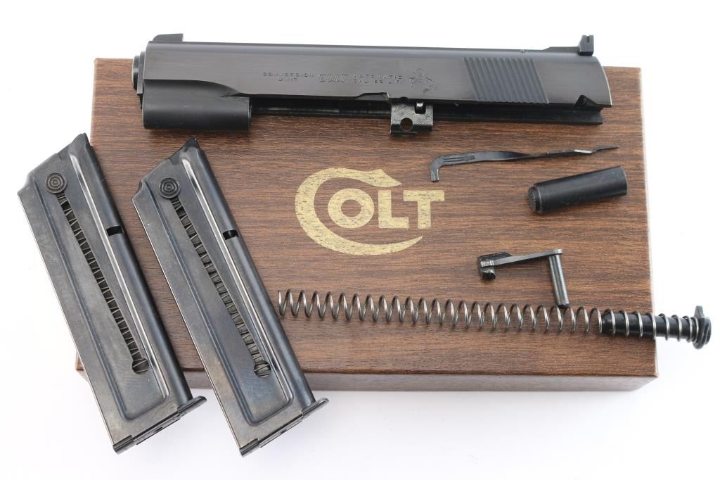 Colt Conversion Unit allows you to replace the upper end of your 1911/Government Model .45 and shoot inexpensive .22 Long Rifle ammo. It features the "floating chamber" which purposely enhances recoil in order to better simulate the feel of shooting full power ammo. The enhanced recoil increases reliability and allows use of a standard weight steel slide The kit comes complete with all parts needed including: slide (complete with Accro sight, firing pin, extractor, etc), barrel, recoil spring, ejector, magazine, and #2 slide stop. The unit are in excellent. like new condition. Two Colt magazines Excellent mechanical condition and excellent bore. Comes in the original Colt box with instruction sheet. Please note that this kit is intended for use with the Series 70 and earlier pistols and will not function with Series 80 frames with the firing pin block safety installed.
