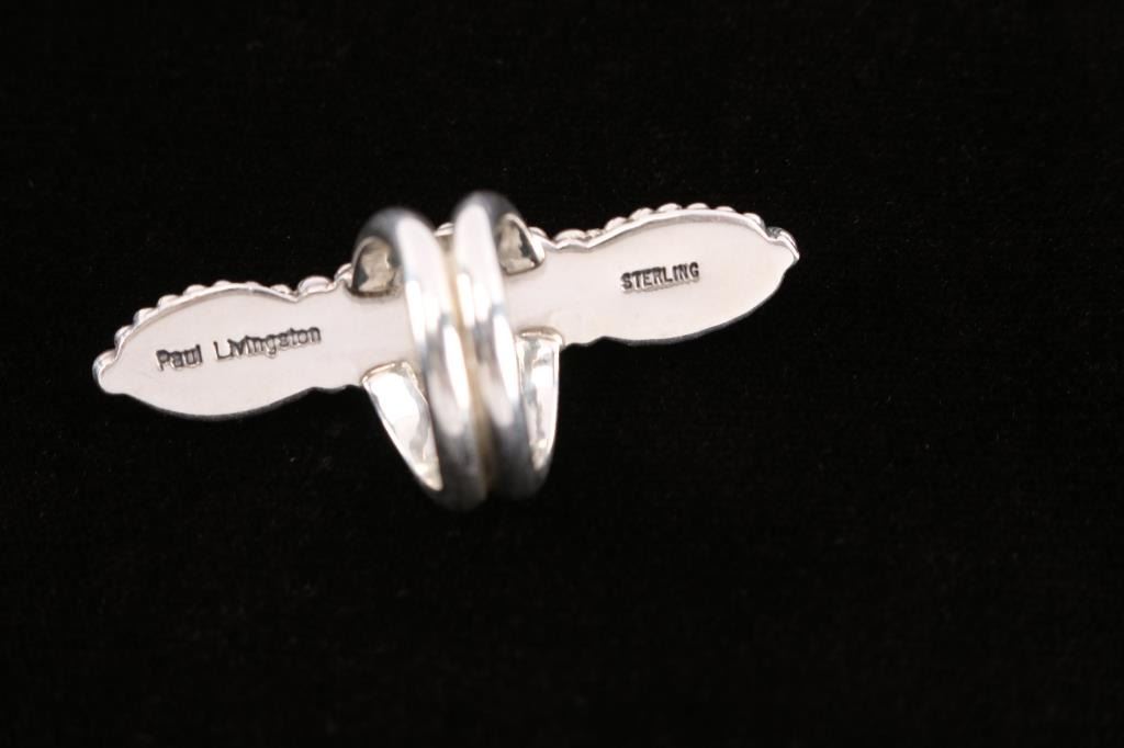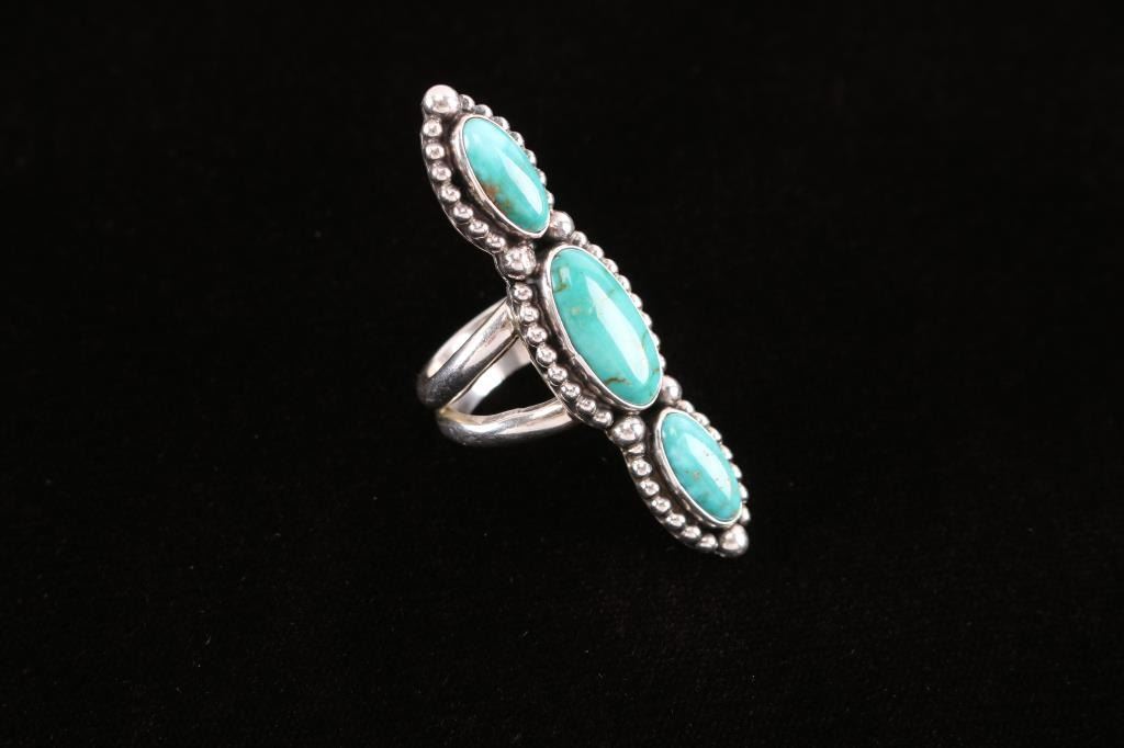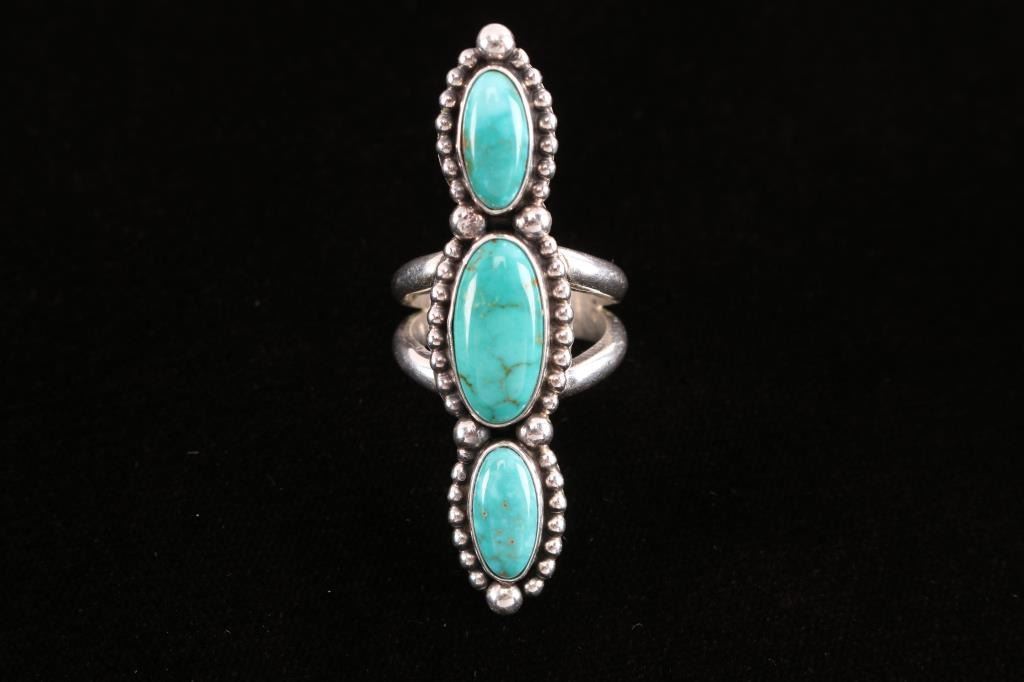 By Navajo Paul Livingston, signed. Three stacked oval blue green stones with sterling dot frame, size 6.