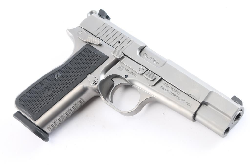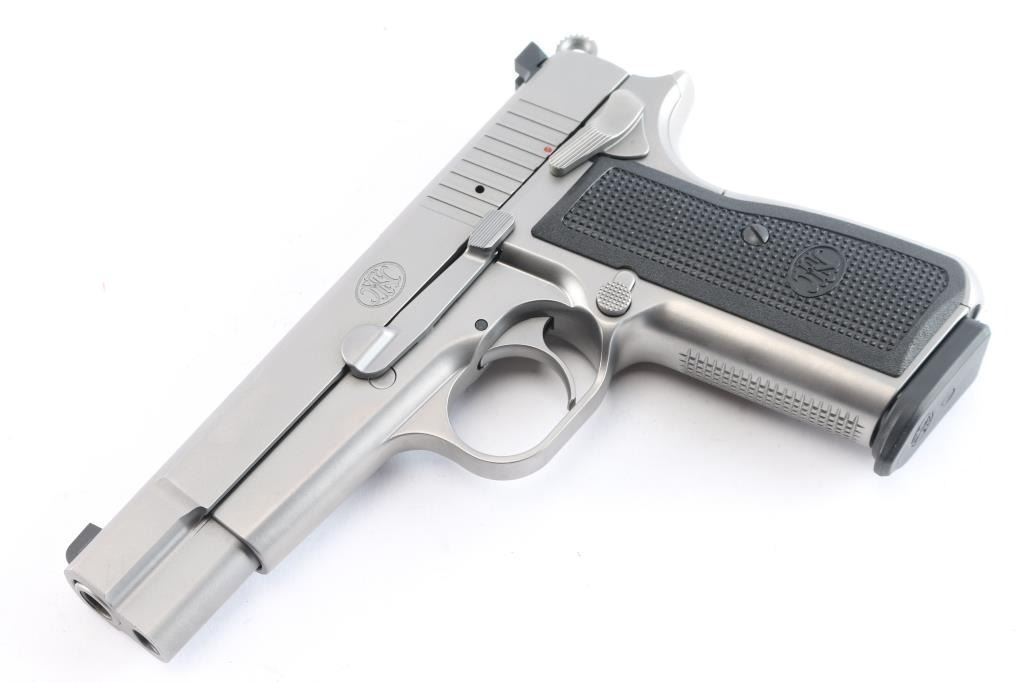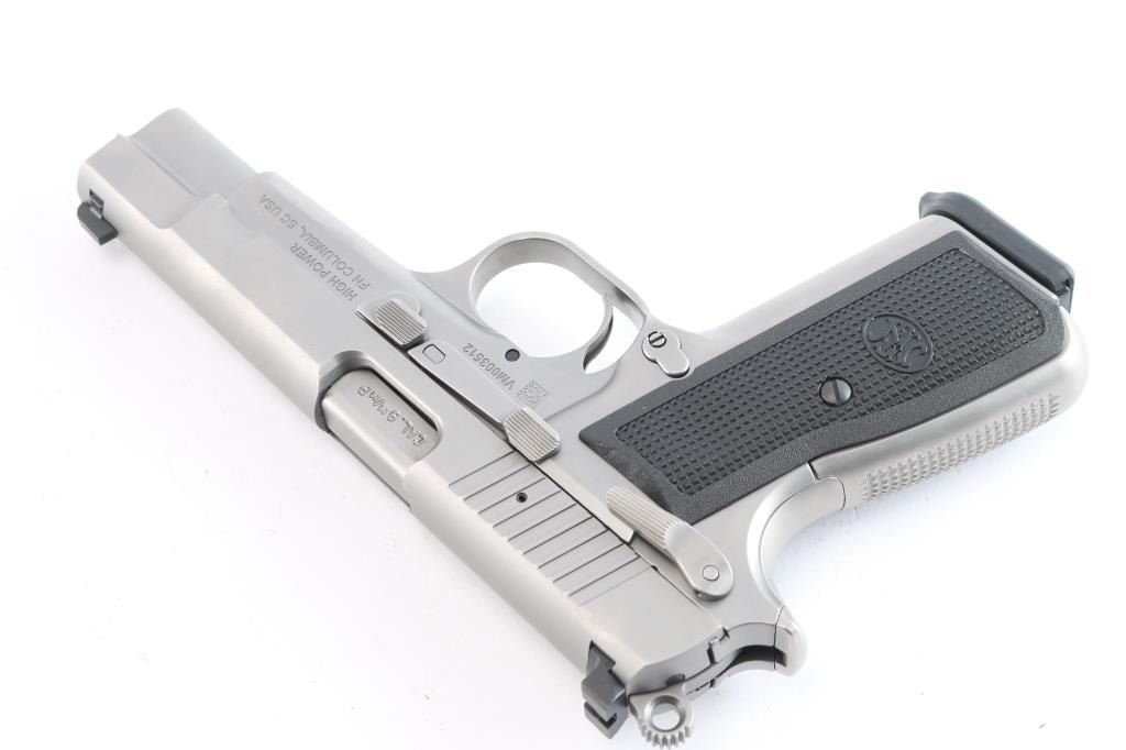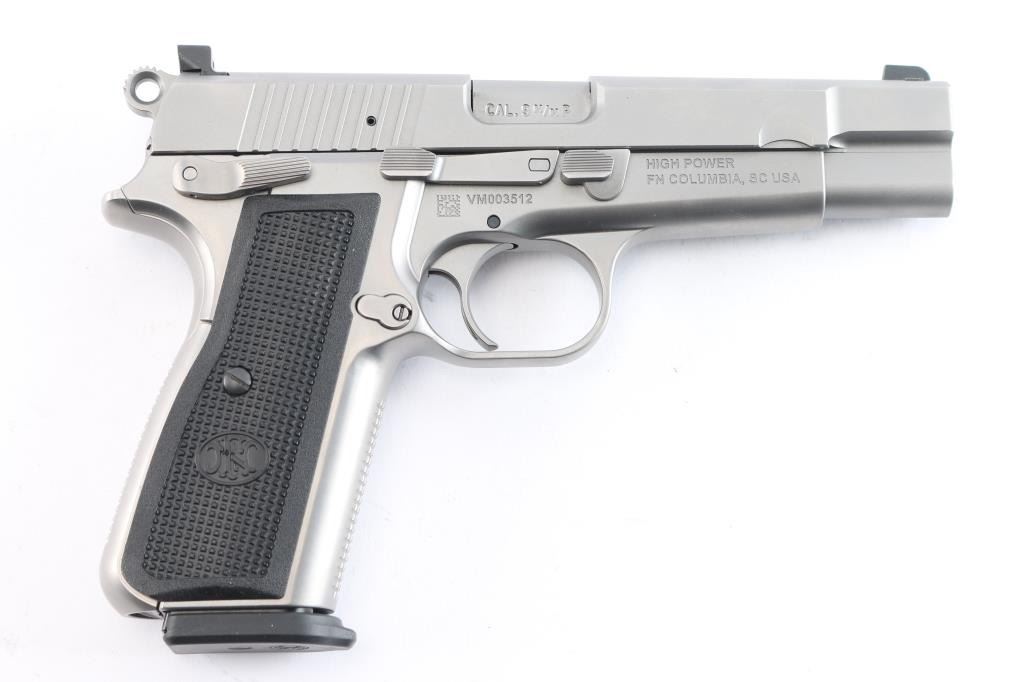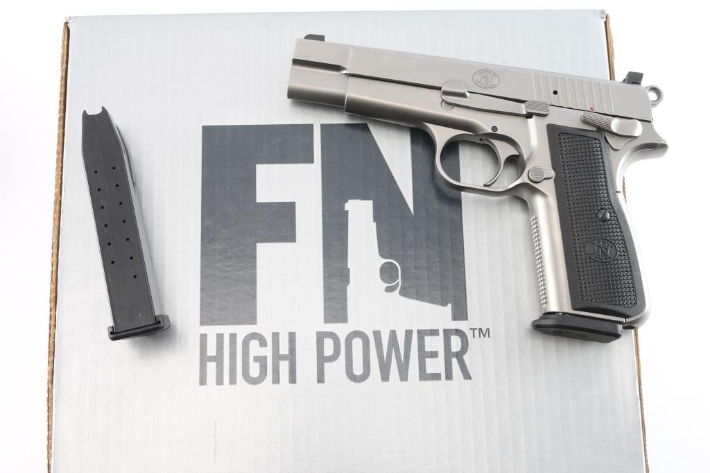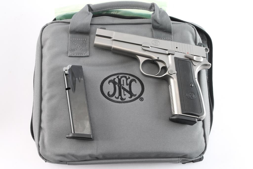 Semi-automatic pistol chambered for 9mm Luger. Modern version and styled after the 'Browning Hi-Power', made in Columbia, SC. Features stainless steel construction with a satin PVD coating that is highly corrosion-resistant. 4.7" cold hammer-forged barrel w/recessed target crown, polished chamber and feed ramp, serrated blade front and square notch rear sights in dovetails. Ambi-slide stop and safety, reversible magazine release button, smooth curved trigger and a serrated rounded hammer. Checkered grip front and backstraps on frame, two piece checkered black polymer grip panels with FN logos. Bore is pristine/bright. Retains 99% finish with no visible wear. Comes with two 17rd magazines, two gray colored and two black grip panels (installed), manual, lock, factory box and soft case. Condition is NRA excellent. ***Modern Firearm***.
