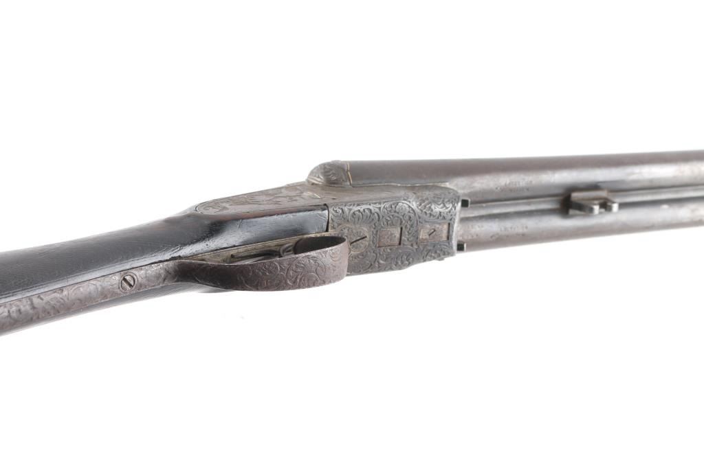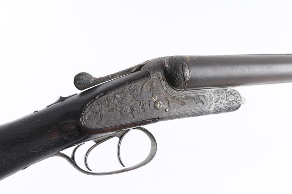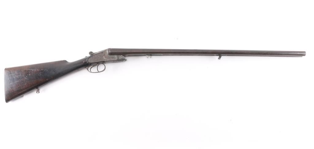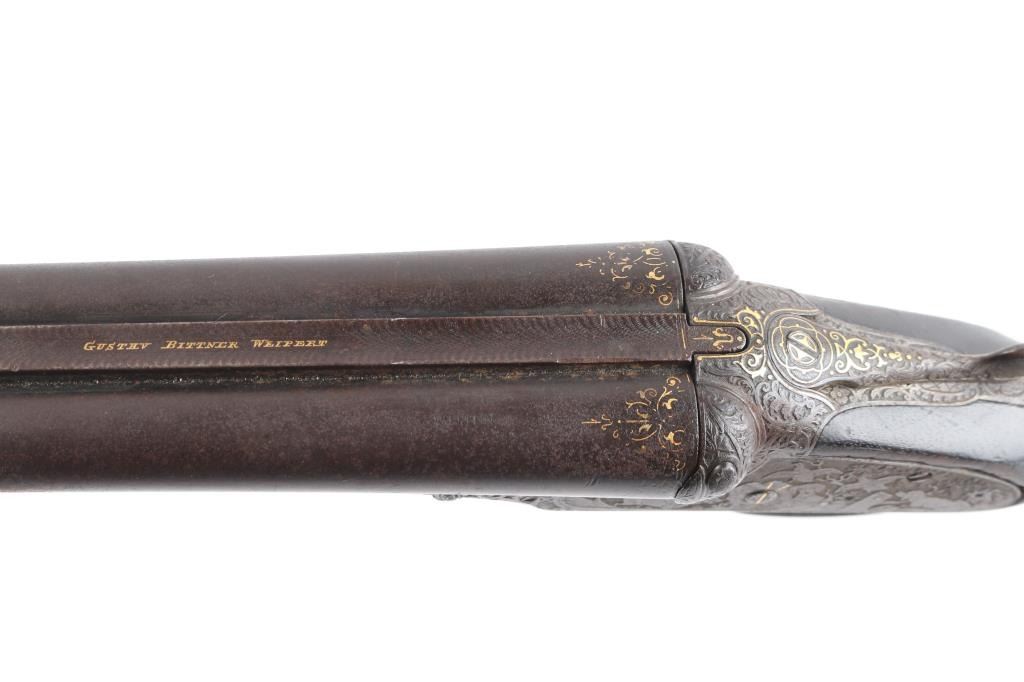 Gustav Bittner Jr. (Emil Gustav Rupert Bittner 1843-1906). High quality sidelock SxS shotgun. Greener style cross bolt, sliding tang safety, top lever, double triggers. 29" raised, solid rib barrels, straight checkered grip shoulder stock with sling swivel and floral engraved Niedner steel buttplate with checkered hard rubber insert. Lower barrel rib is marked "Gustav Bittner Wiepert" in gold inlay, the barrels are made with Excelsior Witten steel, marked on top and bottom of both barrels. Vienna proof marks. The side plates are high relief engraved with forest scenes depicting pheasants, foxes and dogs flushing grouse. The word 'Safe" in gold inlayed on the safety and there is gold inlayed scroll work on the lever, top front of action and lower barrels. The action does not work, missing the forearm and the front sling swivel has been soldered in place. The bores are dark/dirty and the barrels have turned a dark brown patina with full coverage of light pin-prick pitting. Fixed CYL chokes. This is a rare and at one time valuable shotgun. Worthy of restoration.