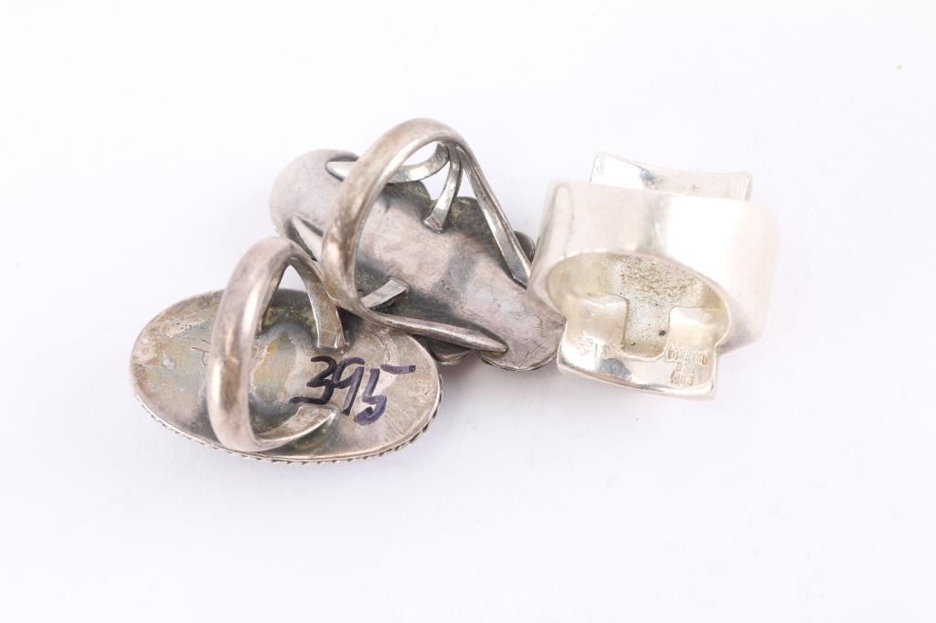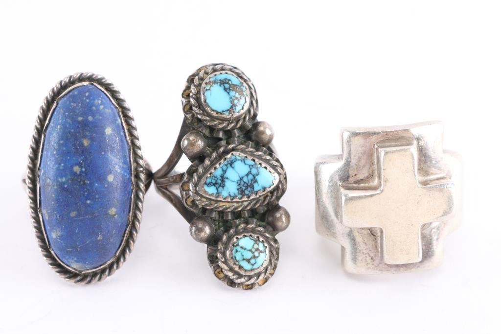 (1) Mexican Sterling Cross Ring, size 8; (1) Navajo 3 Stone Ring, size 8; (1) Lapis Oval cut ring, size 8.5.