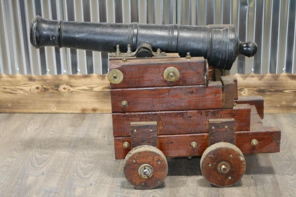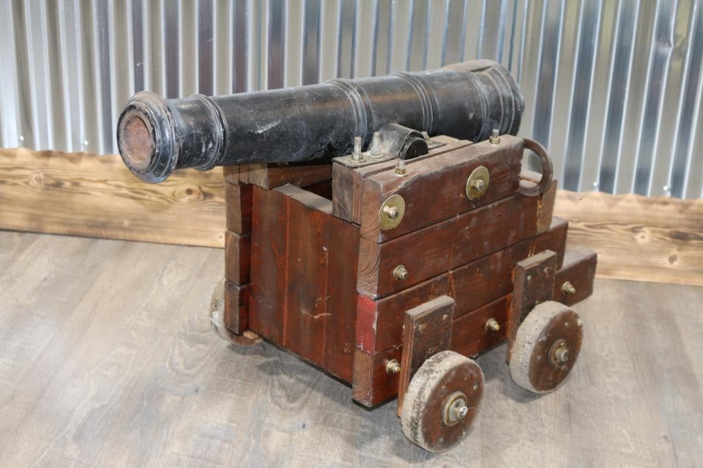 Unmarked 1//3 scale firing replica of the 24 Lbs naval deck guns of the U.S.S. Constitution. Measures: 27" barrel, 2 1/2" breech, 22" height, 20" width and 34" overall length. Comes with 11 billiard balls, brush and ram rod . Good condition. NOTE* Buyer must make arrangements for shipping.