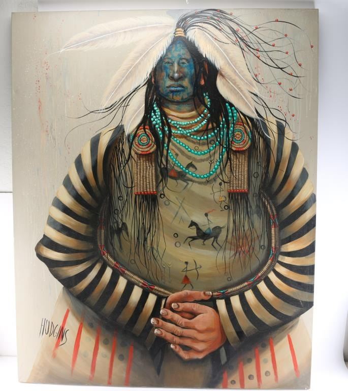 Titled "Blue Face and the 'War Shirt'", by Native American artist Mary Margaret Hudgins. Signed lower left corner. Measures 5' by 4'.
