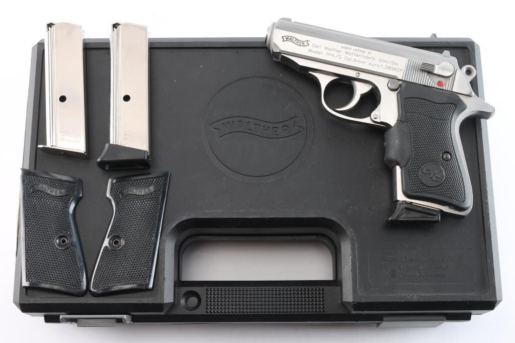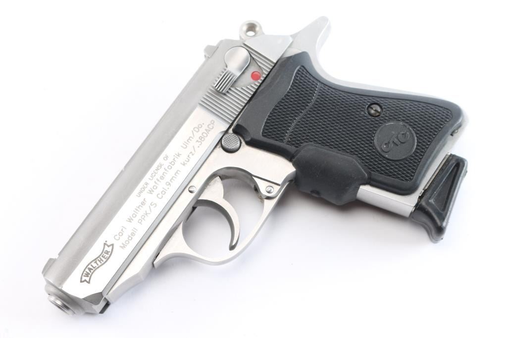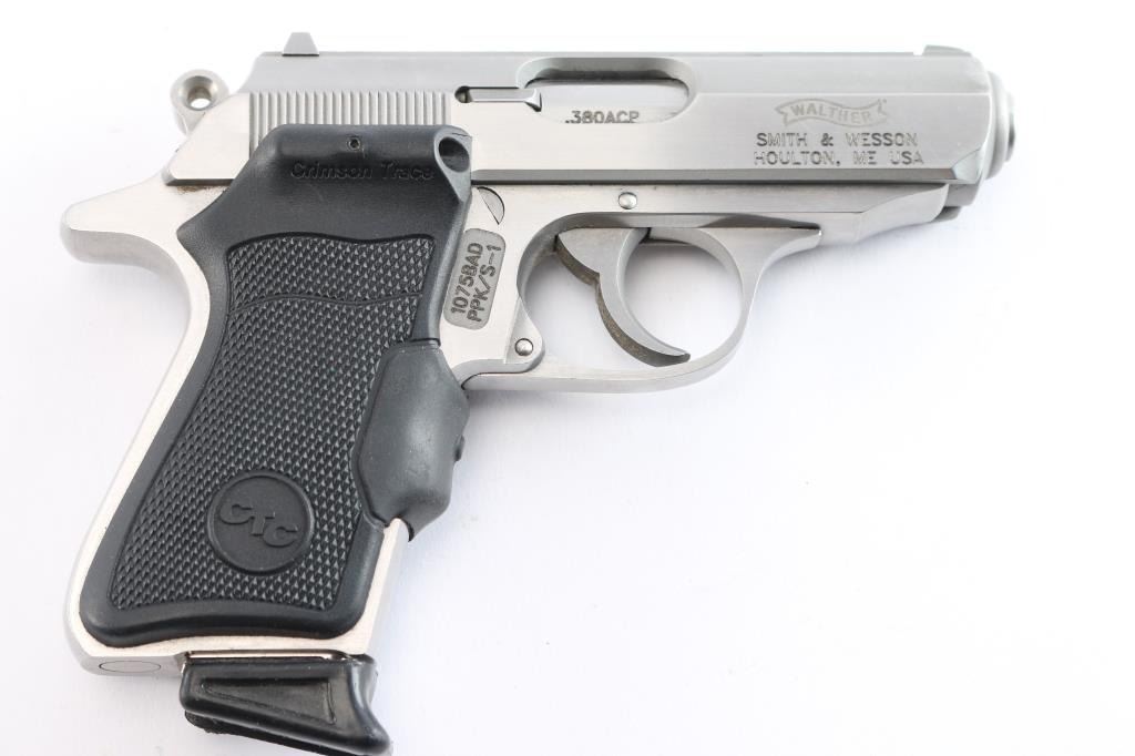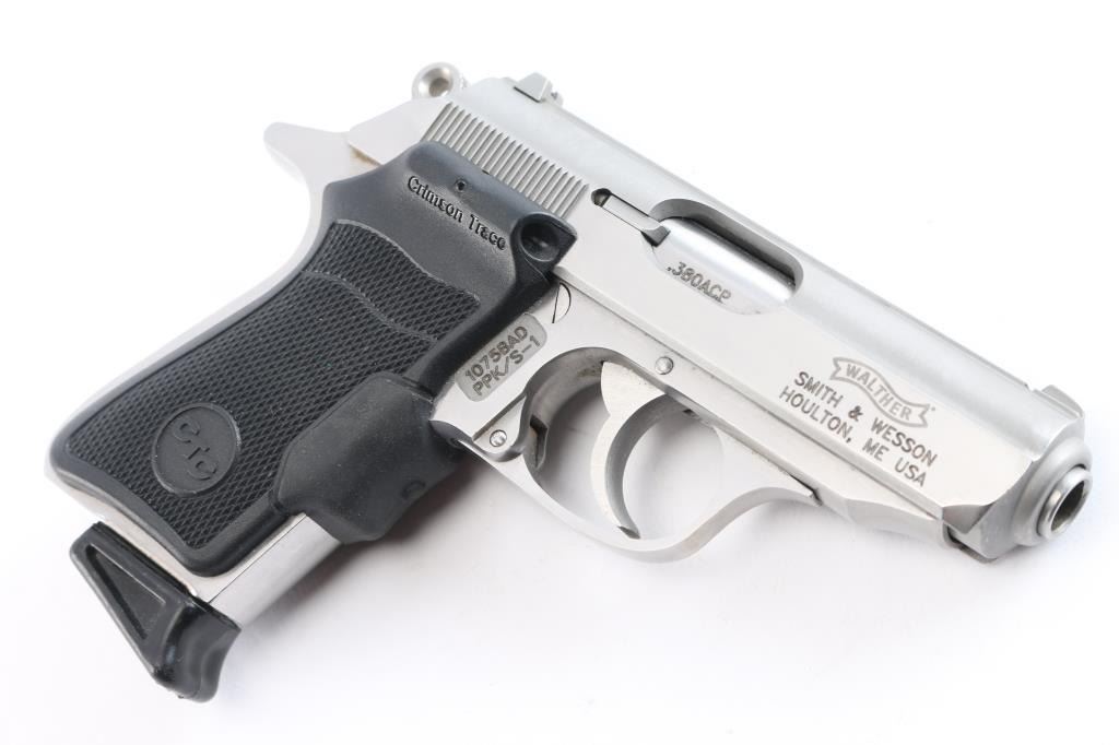 Semiautomatic compact pistol manufactured in the USA under Walther license by Smith & Wesson, Houlton, ME. Features stainless steel construction, double action trigger, 3.3" barrel, fixed front sight with orange dot, dovetailed rear sight with square notch & orange bar, smooth trigger, serrated round hammer spur, thumb safety on the left side of the slide, loaded chamber indicator on the rear of the slide, push button magazine release, Crimson Trace laser dot sight checkered black rubber grips, needs battery . Bore is excellent/bright. Metal surfaces are very good with some minor scratches Includes one 7 rd Walther magazine with finger rest, and a brown suede clip-on holster. Comes with Walther factory hard case with matching label, original Walther grips, cleaning gear, trigger lock, and two Walther 7 rd magazines, one flush and one finger rest.