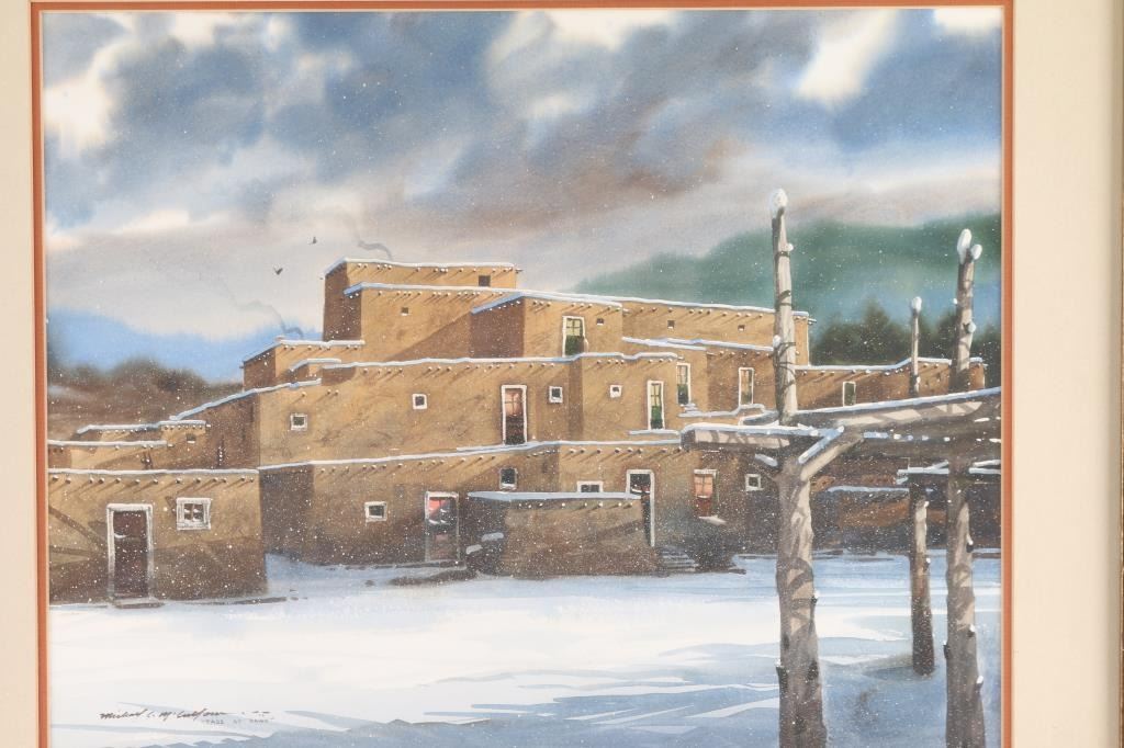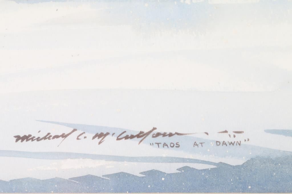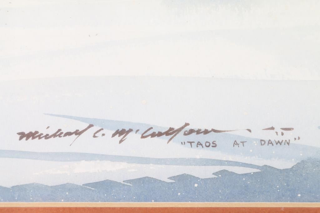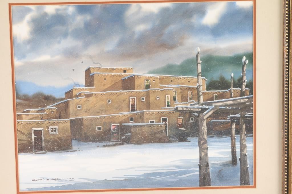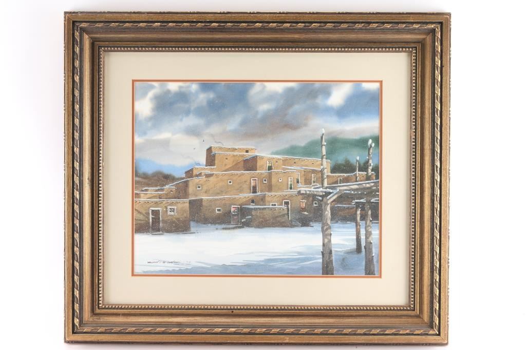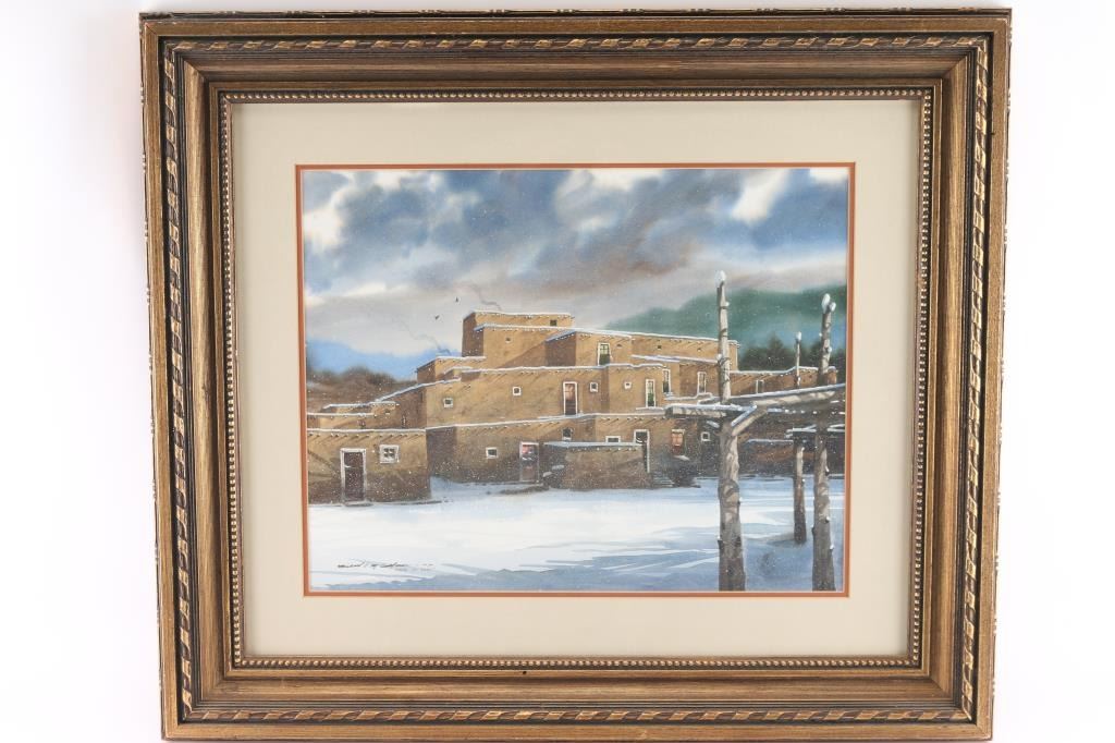Entitled Taos at Dawn. Signed lower left corner. Measures 30" x 26" in bronze color ornate wood frame. Print measures 19" x 15".