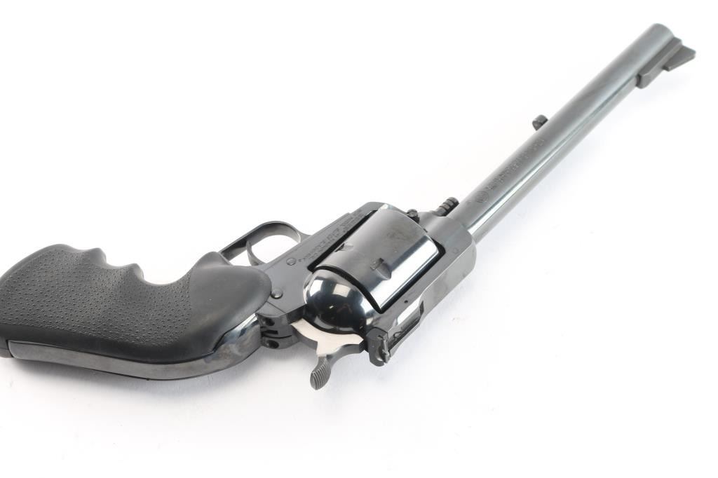 #81-56823. New model single action revolver chambered for .44 Magnum. Features a 7-1/2" blued barrel with a serrated, raised blade front sight and square notched adjustable rear sight, serrated wide hammer spur, serrated curved trigger. Hogue pebbled black rubber wrap-around grips with finger grooves, hammer has polished sides, non-fluted cylinder. Retains approximately 98% of it's finish with some minor scratches, slight drag line on cylinder. Grips are like new., bore is excellent/bright. Action is smooth with tight lock-up. Comes with original factory red cardboard box. manufactured 1976.