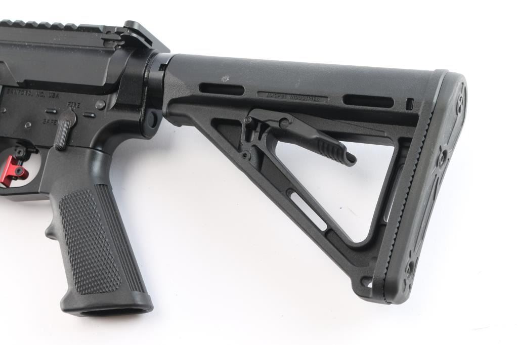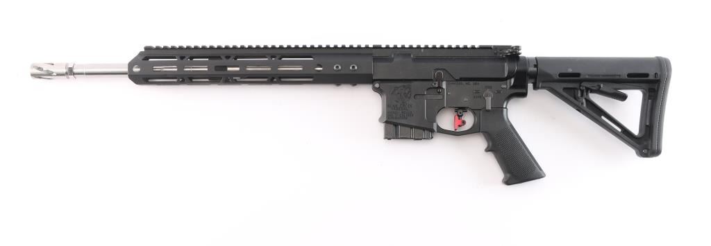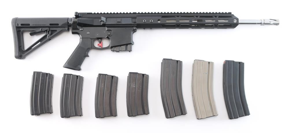 Semiautomatic rifle based on the AR15 platform. Features 16" stainless steel barrel with 1:8 twist, stainless flash hider with spiral fluting, matte black finish otherwise, with aluminum M-LOCK handguard, Picatinny rail from back of receiver to front of rail, forward assist, ejection port cover, manual safety, black polymer A2 grip and Magoul collapsing stock, Timney Calvin trigger. Overall like new condition, few handling marks. Includes one 10 round magazine, 3 30-rd and 4 20-rd mags.
