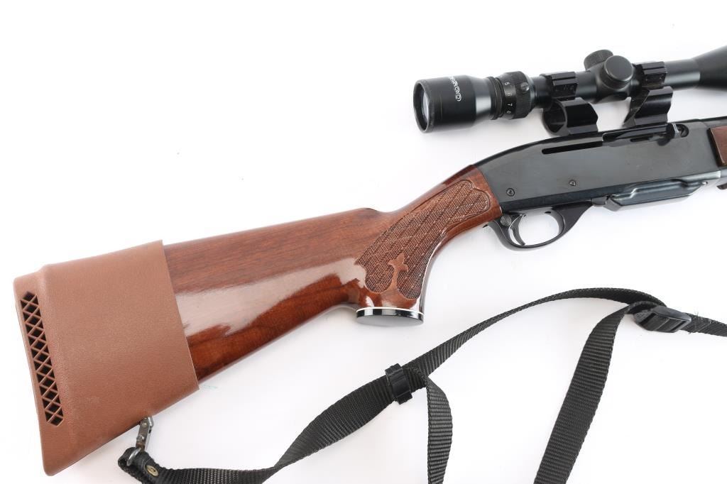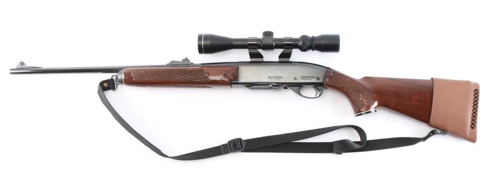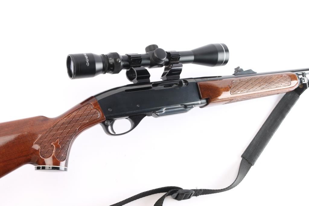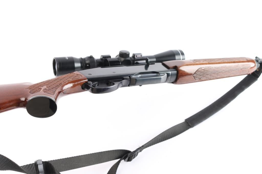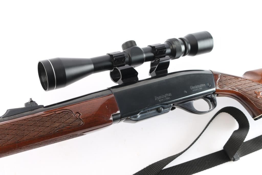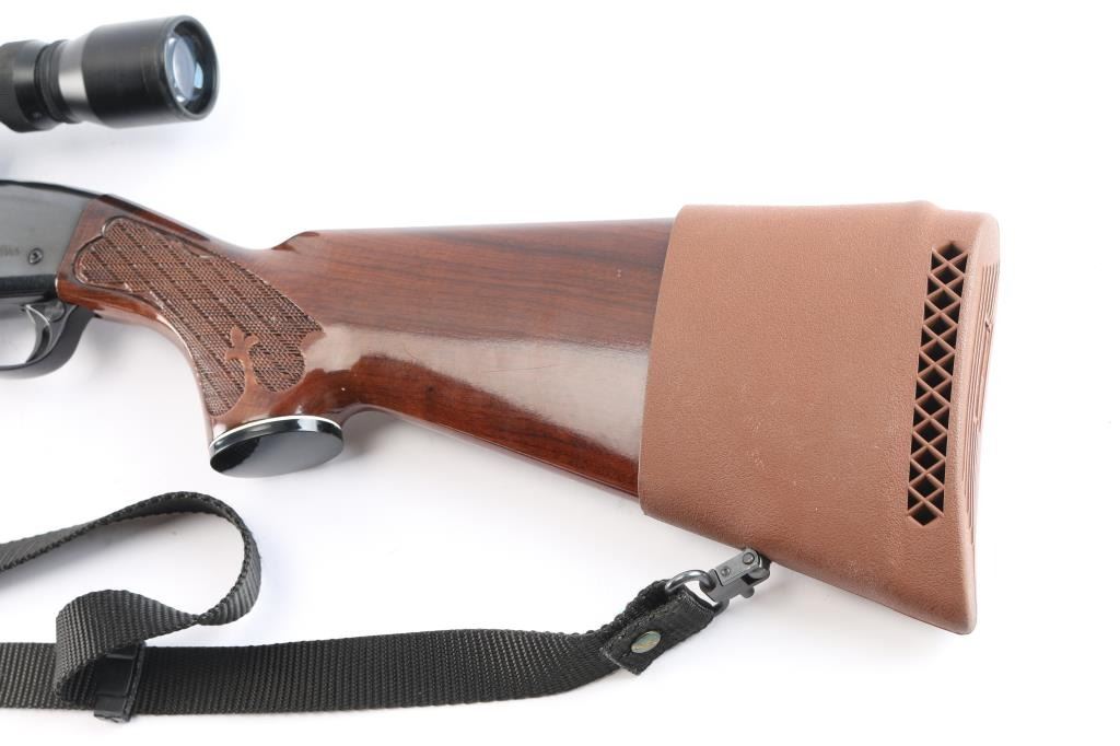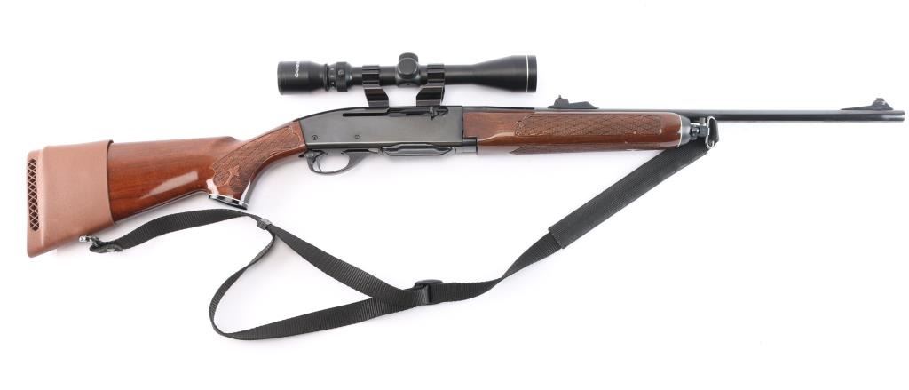 Semiautomatic rifle manufactured circa 1960-80, this one manufactured1980. Features 22" barrel, ramp front sight with beaded blade, adjustable rear sight,push button safety, blued finish, wood stock with impressed checkering at wrist & forend, slip-on brown rubber recoil pad and grip cap with white spacers. Mounts a good condition Tasco 3-9x49 Scope, duplex reticle, clear view. Kwik Site see-through rings. Bore is excellent/bright. Retains about 96% blued finish with minor scratches. Wood is nearly perfect with few minor scratches. One magazine. Black nylon sling attached.