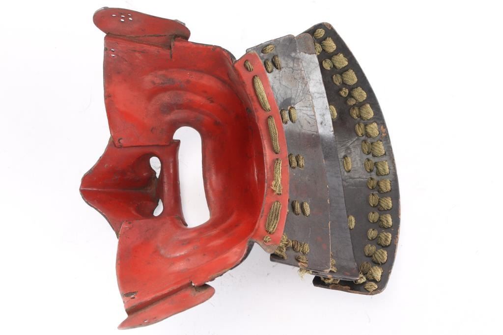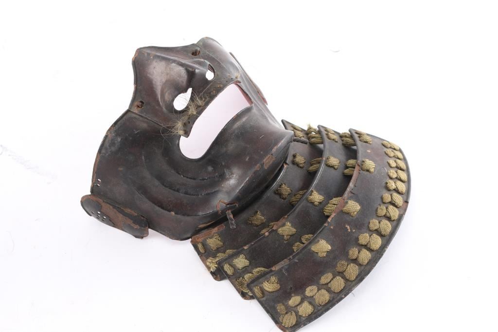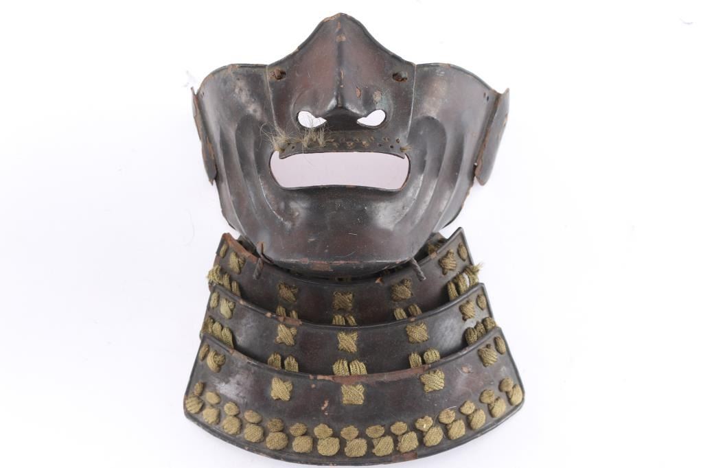 Menpo, short for “men no shita men” is an armored face mask used by samurai warriors to cover their face and nose, below their eyes. late Edo period brown lacquered exterior and red lacquered interior, detachable nose piece which once had a horse hair mustache, remnants of it below the nose, features a fierce expression with a prominent jaw, wrinkles and cheekbones, no teeth. 3 lame plate throat guard (Yodare-Gake). spaced lacing in white braid. Overall very good condition, intact with some scuffs, chips to the edges of the lacquer finish.
