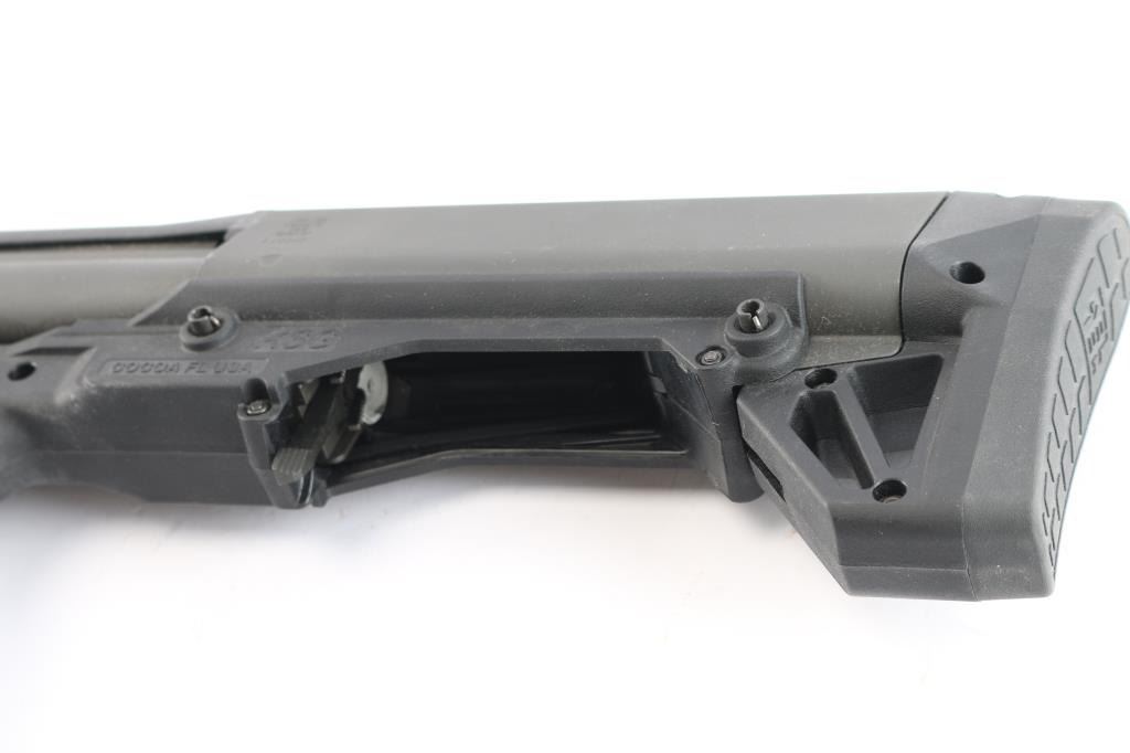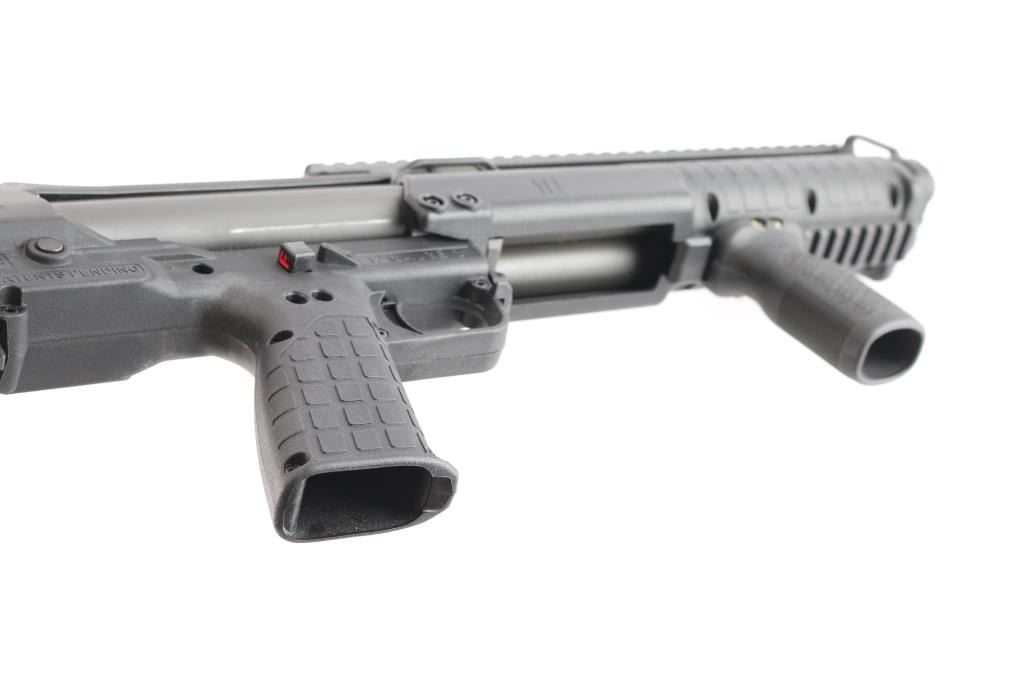 Bullpup configuration slide-action repeating shotgun chambered for 2 ¾” & 3” 12 gauge shells, manufactured in Cocoa, FL. Features parkerized/matte finish, 18.5" cylinder bore barrel, T-marked optics rail, dual magazine tubes with a combined 14 round capacity, three-position magazine feeding selector switch, polymer trigger, cross-bolt safety, ambidextrous slide release on triggerguard, integrated accessory rail on the slide handle at the 6 o’clock position with MOE/RUG vertical grip installed,m Integral sling points and synthetic FDE polymer stock with rubber recoil pad. Shotgun retains approximately 99+% of its original finish. Action is sound, the bore is very good and synthetic stocks are fine. 26" overall length. Comes in the original factory box with matching label and owners manual.