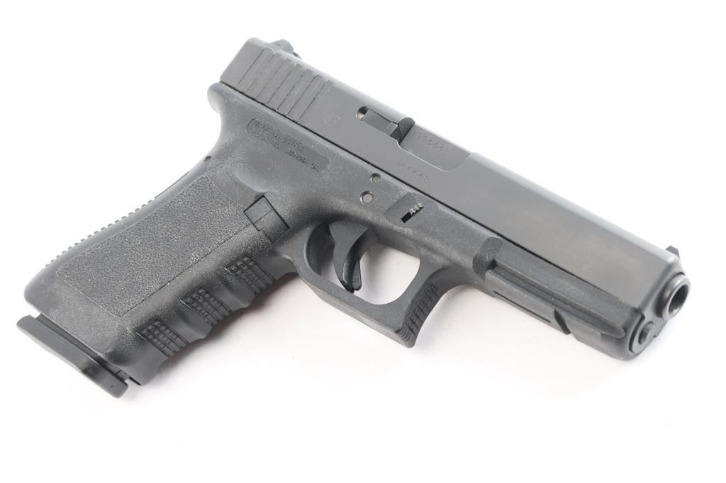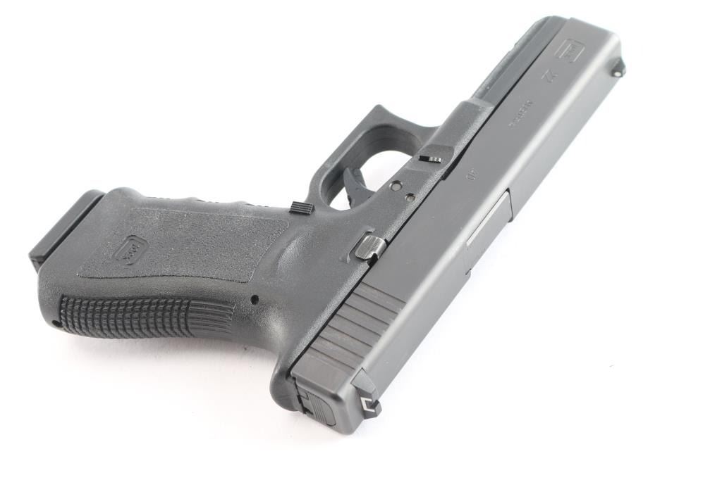 Austrian made full size safe-action semi-automatic pistol chambered in .40 Smith & Wesson. Features a satin black finish, 4.49" barrel, white dot front sight, dovetailed rear sight with white outlined square notch, integrated trigger safety, push button magazine release, factory 15 round magazine, and durable black polymer frame with integral accessory rail & finger groove grip. Pistol exhibits approximately 97% of its original finish showing minor handling wear and edge wear. The bore appears excellent but dirty. Includes a non-matching factory hard case with cleaning tools and two spare 15 round magazines (one is marked .357 Sig).