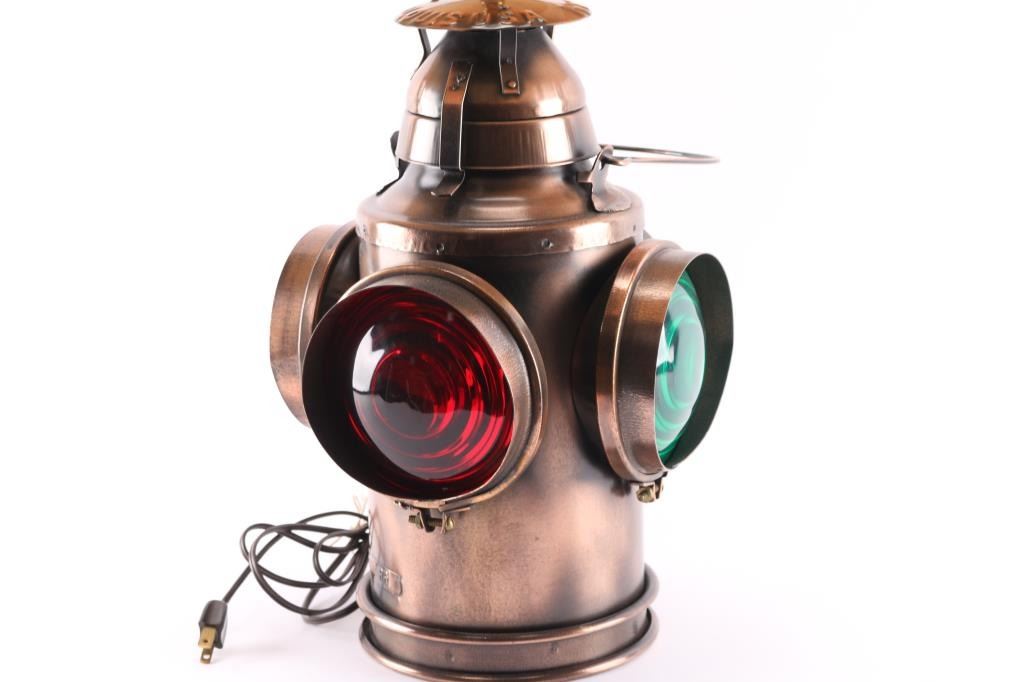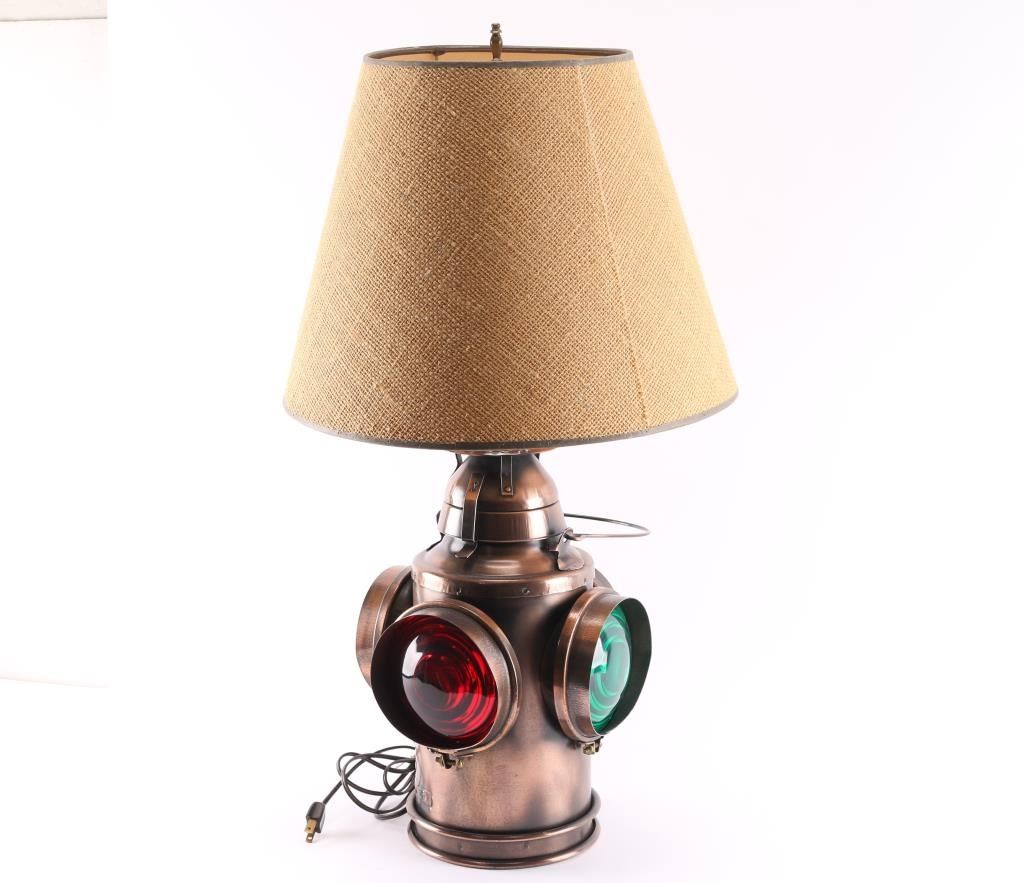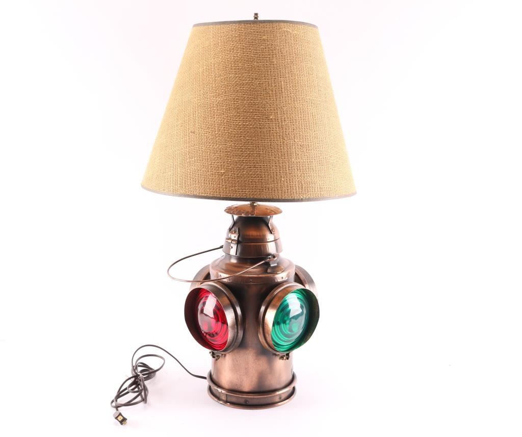 Unique table lamp made from a brass railroad light. Stamped "Handlan ... St. Louis U.S.A." on top and "B&M RR" toward bottom. Comes with lamp shade. In working condition. Measures 29" tall including shade and 33" circumference.