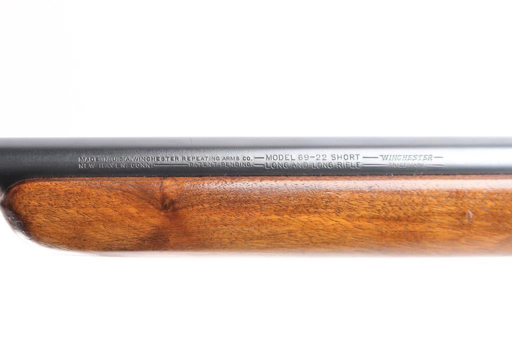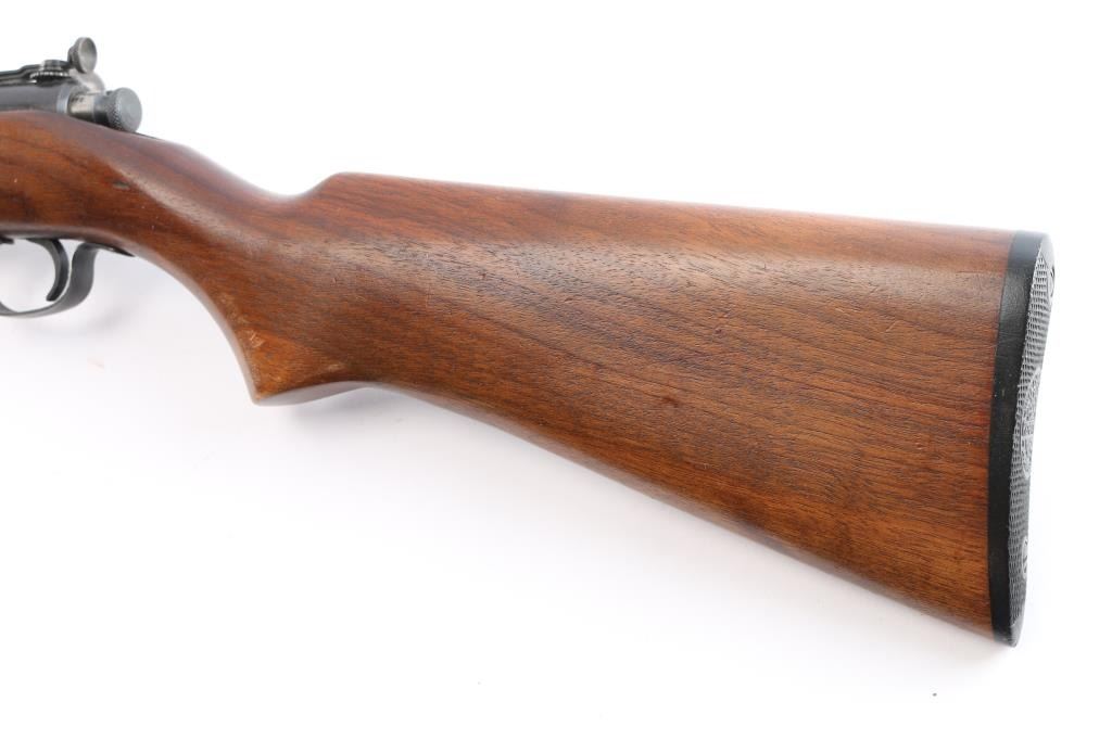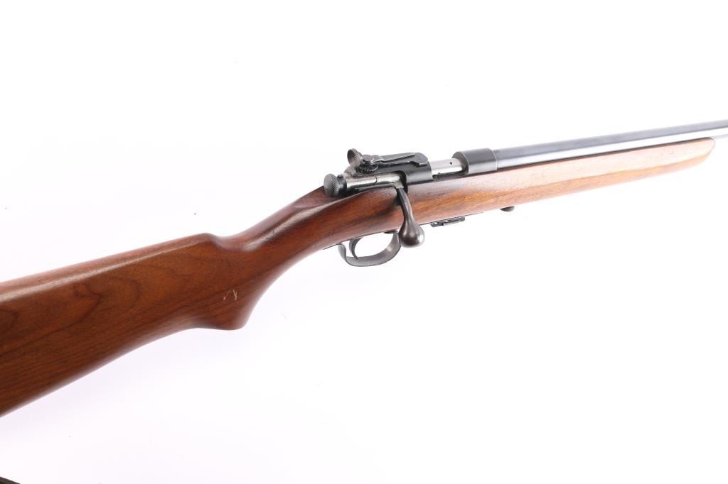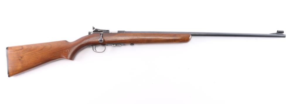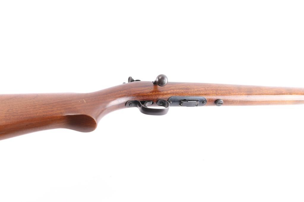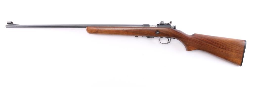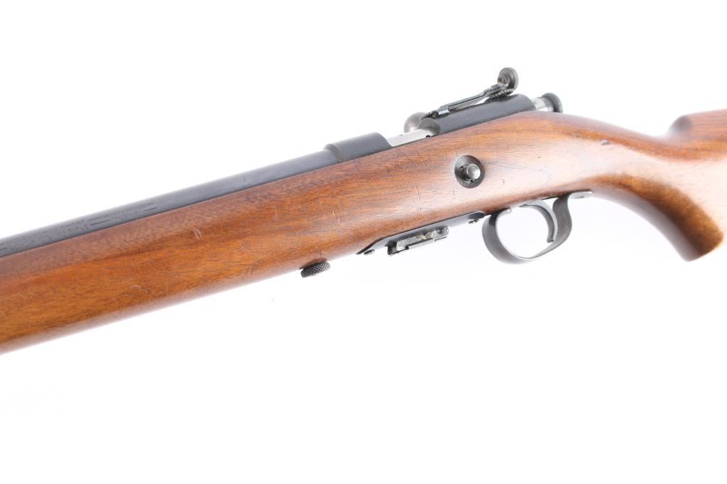 Vintage bolt action rimfire rifle features blued finish, smooth walnut stock, 25" barrel, hooded post front sight on ramp, receiver mounted adjustable peep rear sight, detachable magazine, bolt cocking piece serves as a manual safety. Bore is excellent. Retains 90% finish with minor fading and edge losses. Stock is very good to excellent with few handling marks.