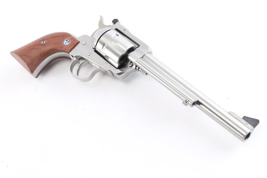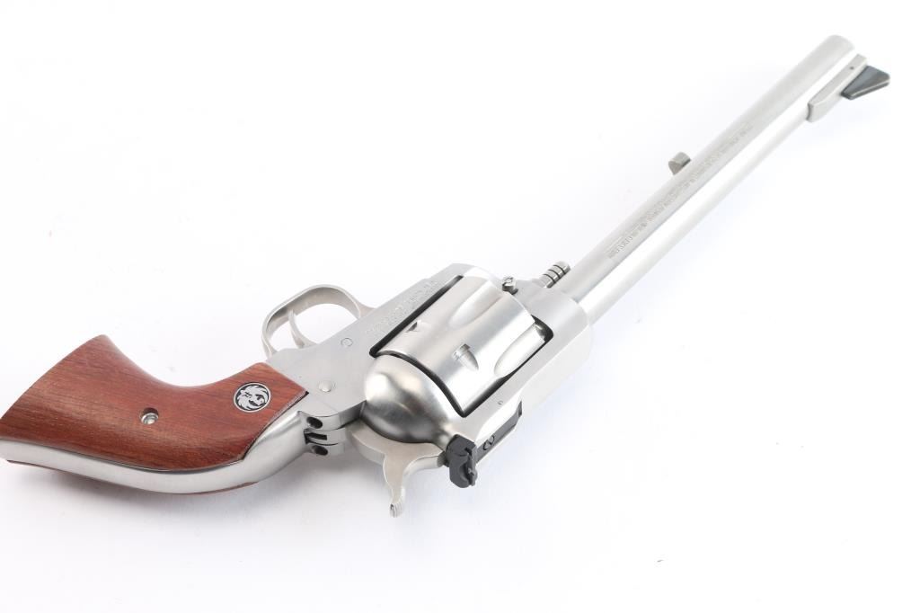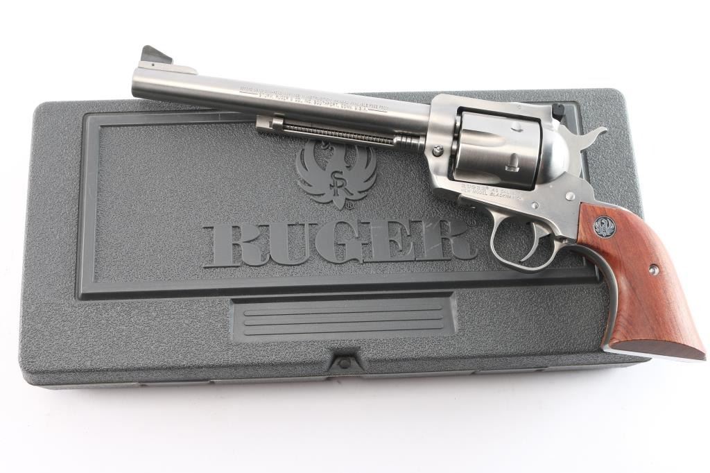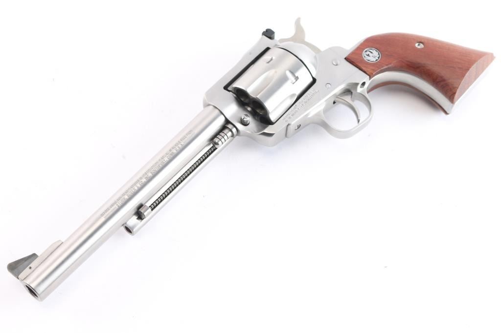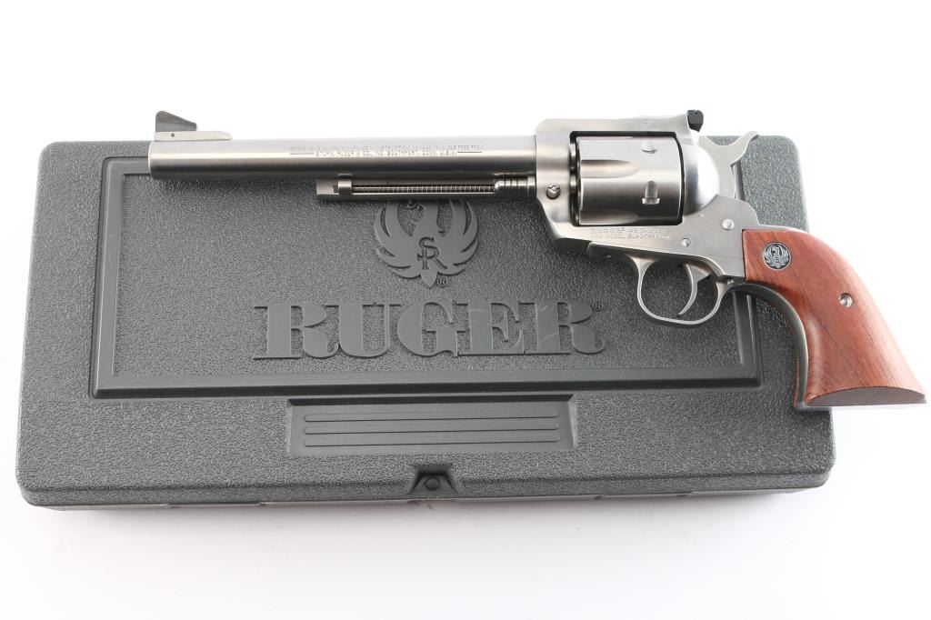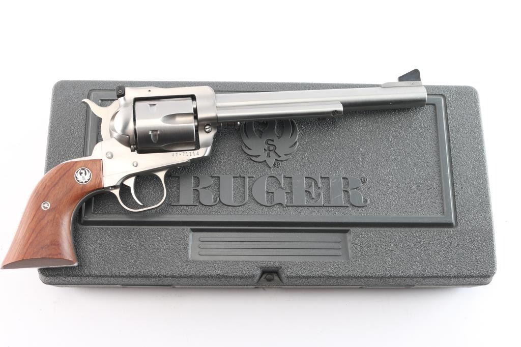 Stainless steel large frame single action revolver chambered in .45 Colt, manufactured circa 1996. Features a brushed finish, 7 1/2" barrel, raised ramp front sight, adjustable rear sight, ejector rod, fluted six-shot cylinder, smooth wide trigger, serrated hammer spur, transfer bar safety and two-piece smooth wood grips with Ruger medallions. Includes a factory hard case with cardboard sleeve with matching label, documents and lock. Revolver exhibits light wear and handling marks. Action is smooth with good lock-up, the bore is excellent/bright and wood grips are fine.
