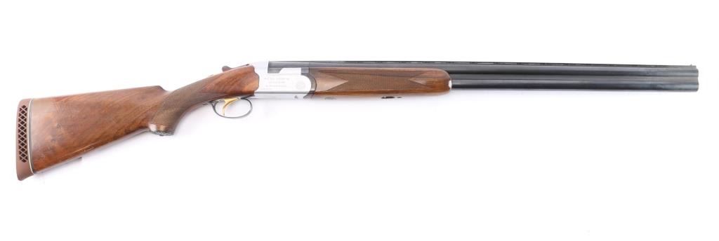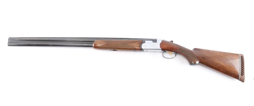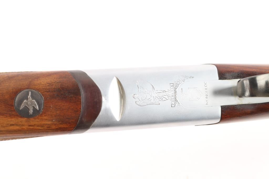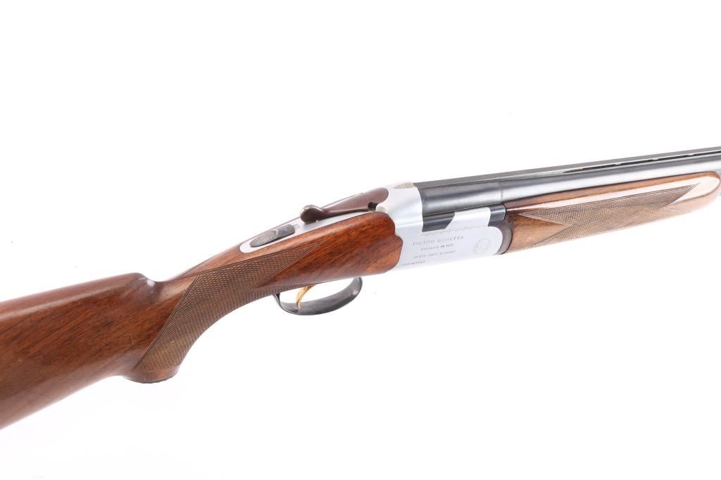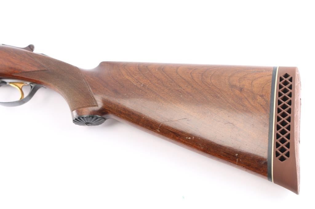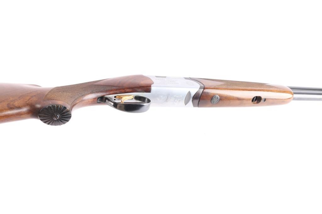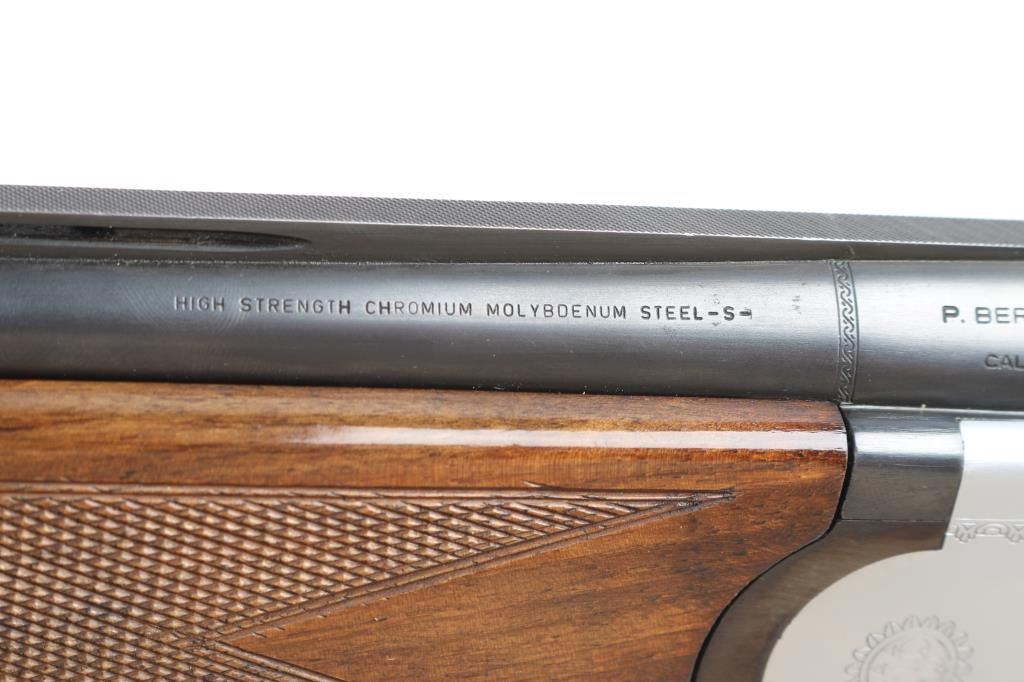 Over/Under shotgun made in Italy, imported by Beretta. Manufactured 1955-67, this one made in 1964. 28" blued, vent-rib steel sight bead, fixed Cyl over Full chokes, 2 3/4' chambers. Shotgun features coin finished receiver with Beretta logos, gold accent single trigger, plum colored top lever, one piece extractor, tang safety, inertial hammers, checkered wood forend, wood butt with checkered curved grip, vented rubber recoil pad, contrasting wood grip cap with shell design, inletted silver toned snipe in flight inletted on the underside of forearm. Retains about 97% blue finish with a little handling wear. Coin finish is excellent. Wood is overall very good condition, shows evidence of handling with some scratches and scuffs. Approx stock dimensions: 14-1/4" Length of Pull, 1 1/2" Drop at Comb, 2 3/8" Drop at Heel.