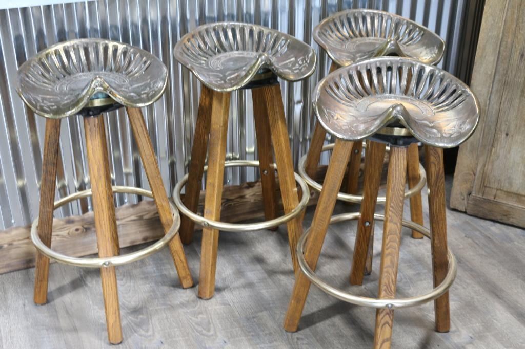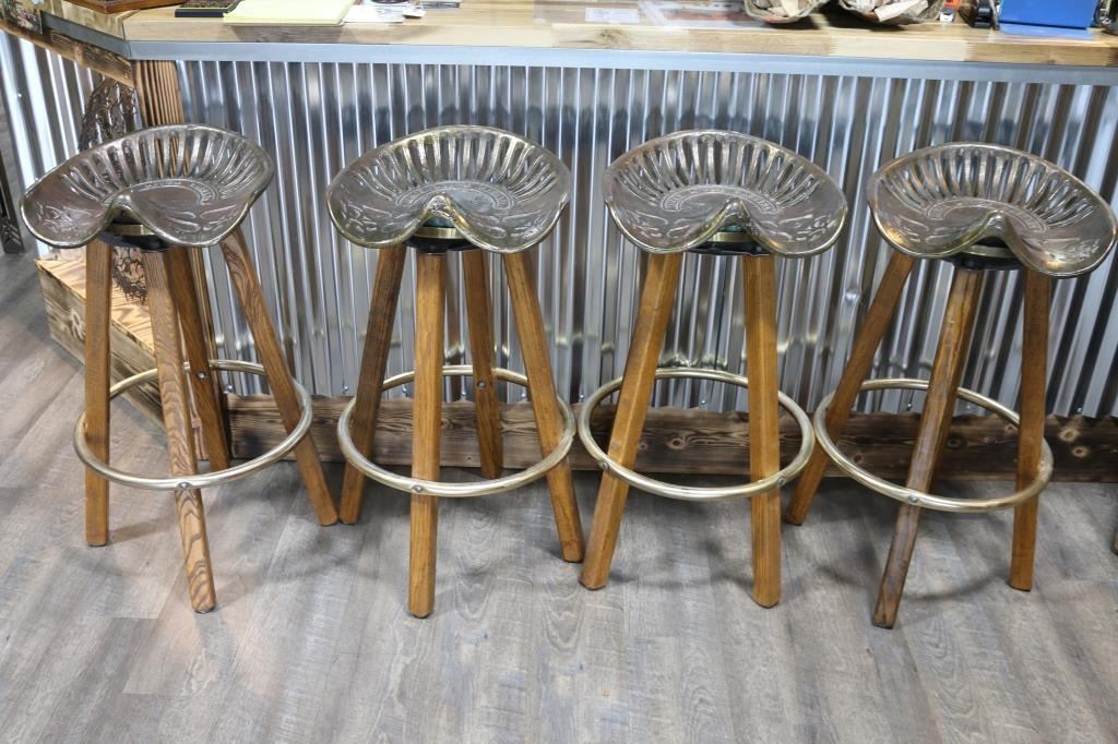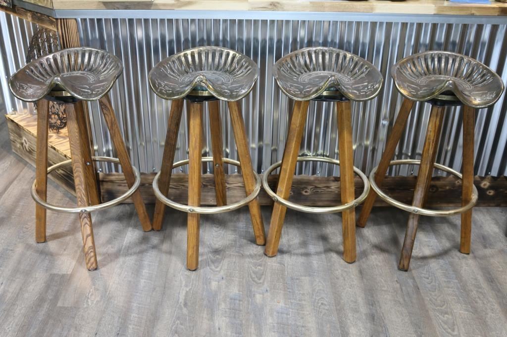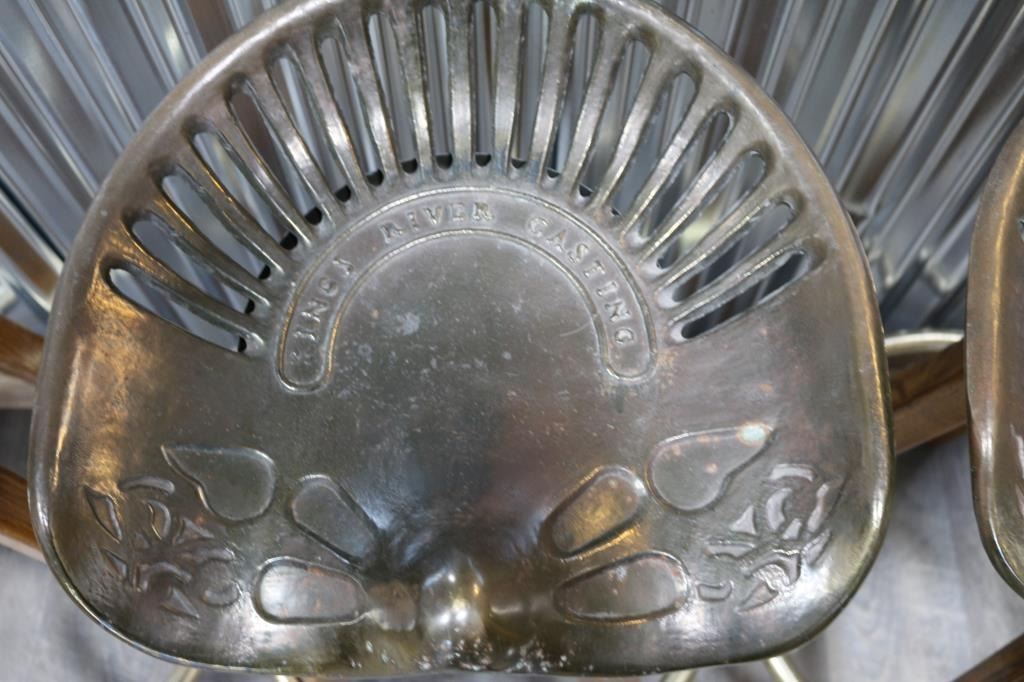 With cast metal tractor seats inscribed "Kings River Casting" and oak legs with metal ring for foot rest. Each measures 33 1/2" tall, seats are 16 1/2" wide and 15" deep. LOCAL PICKUP ONLY!