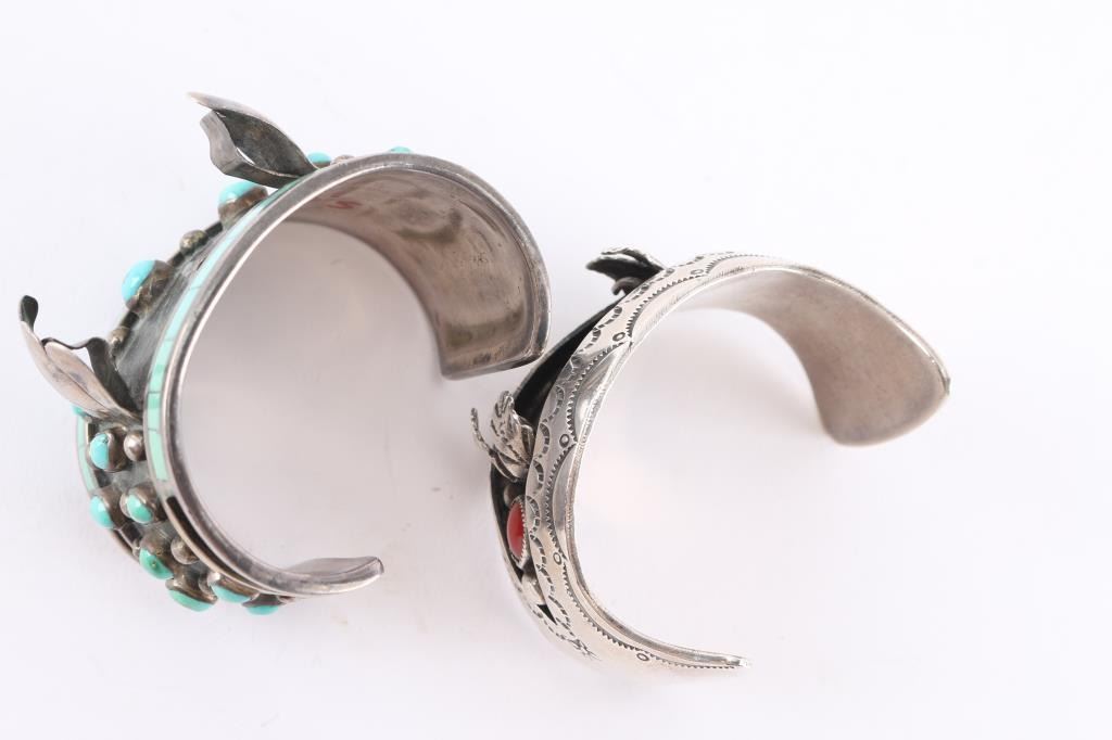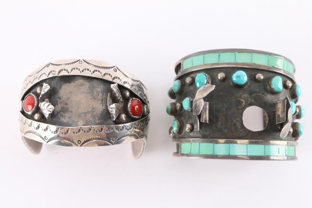 One is signed Jobeth Mayes, with maize hallmark, dated '78. The artist started producing jewelry in 1971. She is most famous for his this very design in her jewelry. As a noted Zuni artist, her work is featured in several high end galleries. This cuff measures 7" with gap and is missing a center stone. The other cuff measures 7 1/4" with gap, stamp design, two round coral stones, missing center stone.