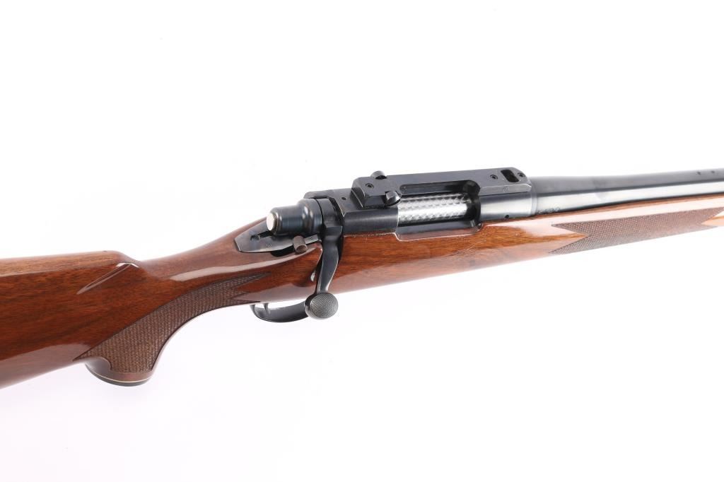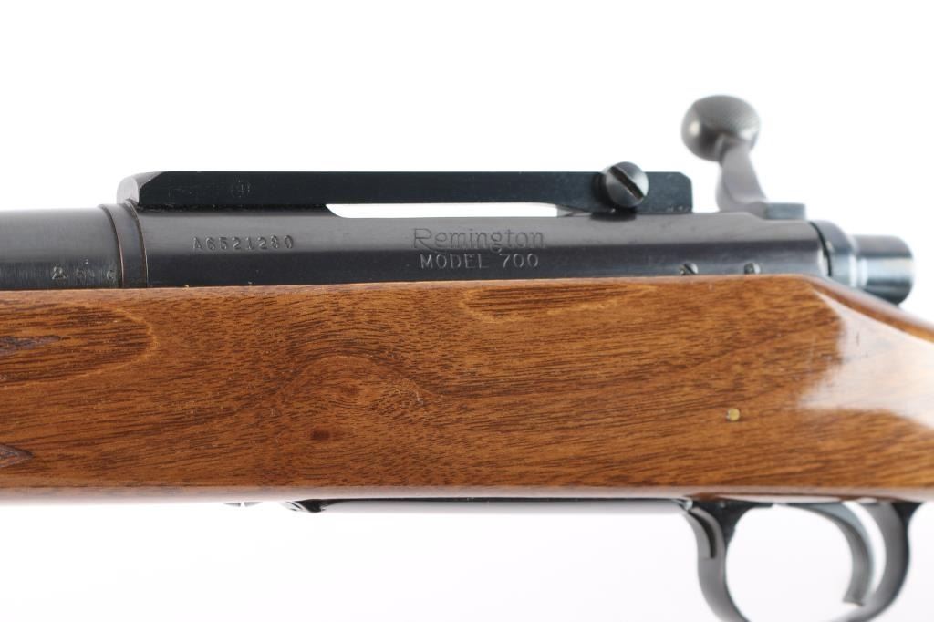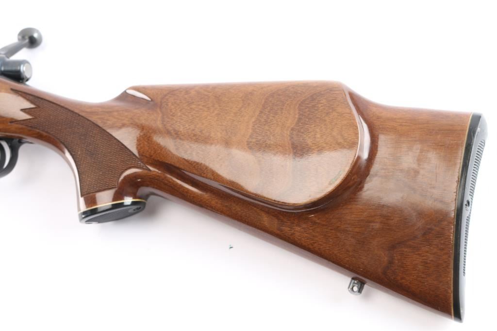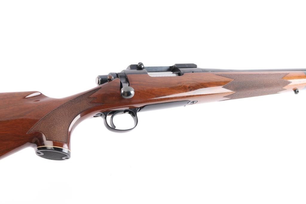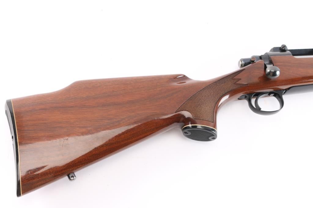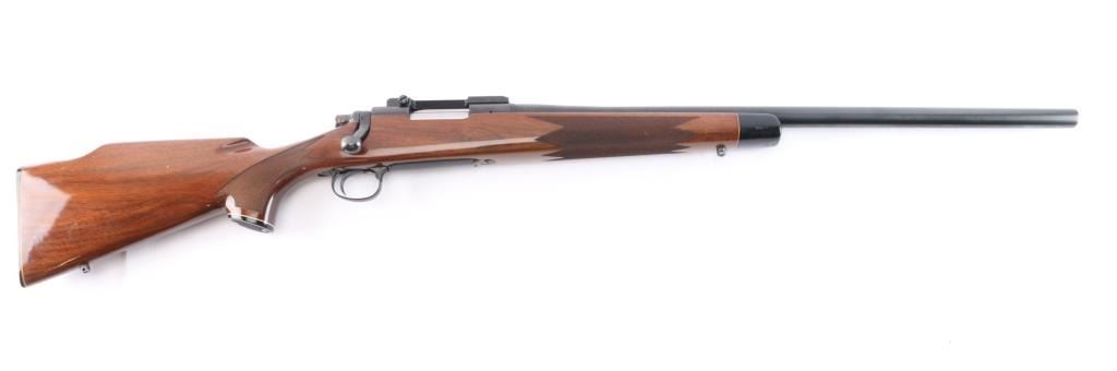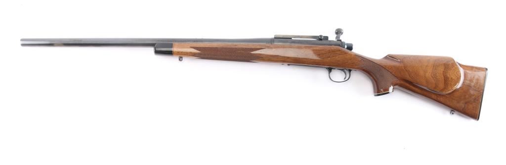 Remington BDL bolt action rifle features blued finish, Monte-Carlo walnut stock with checkering at forend & wrist, right handed cheekpiece, flat plastic buttplate and grip cap with white spacers, contrasting black fore cap, high comb and sling studs, 24" heavy barrel, no provisions for sights, one piece Redfield scope base installed on receiver, hinged floorplate, jeweled bolt, wide serrated trigger, manual thumb safety, cocking indicator. Bore is excellent/bright, retains about 90% blue, with a small patch of light pitting on the left barrel and two areas of finish loss on the barrel where pitting was cleaned. Wood is very good condition with minor scratches and scuffs, action is smooth.