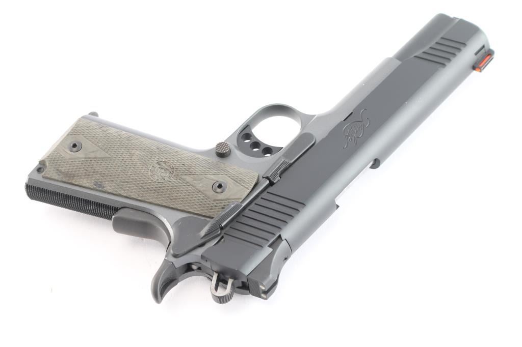 High quality semiautomatic pistol chambered for 45 ACP. Features two tone finish (black slide and controls over medium gray lightweight alloy frame), 5" barrel, extended manual safety, beavertail grip safety, adjustable overstop trigger, flat checkered mainspring housing, full length recoil spring guide, beveled magazine well, dovetail mounted 3 dot sights with orange fiber optic front insert, slide serrations front & back, double diamond checkered Hogue logo grips. Bore is excellent/bright. Finish is excellent with a couple of very minor scratches, action is smooth. Includes one blued factory magazine and a Warriorland clip holster. .