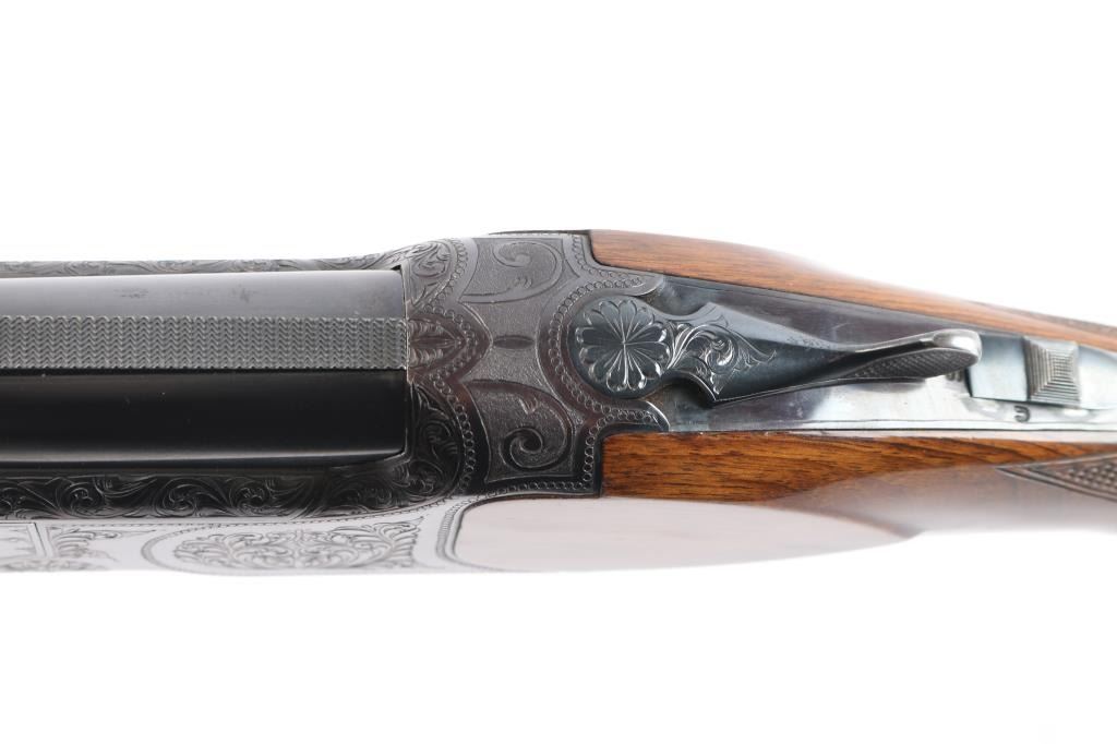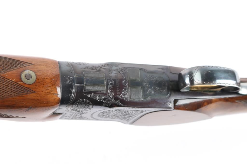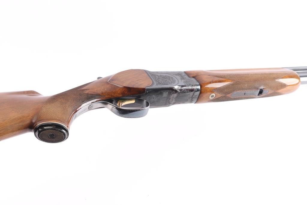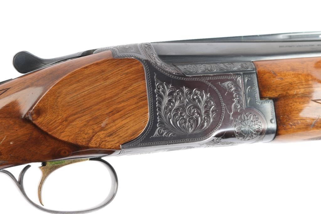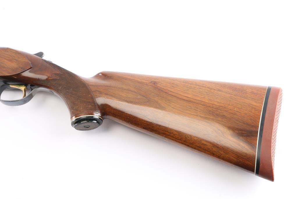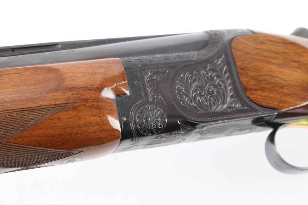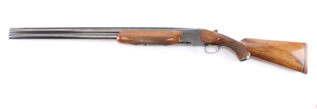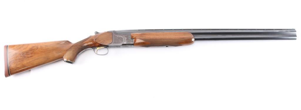 Quality 'Superior Grade' Japanese made over under shotgun with 28" vent rib barrels, steel bead with smaller mid bead. Blued finish, scroll engraved receiver, high gloss checkered Monte Carlo style walnut stock and forearm, single select gold toned trigger, sliding tang safety/selector, factory buttplate, steel grip cap. Choked CYL over IM. LOP is 14 3/4". Bores are excellent/bright, blue is about 98% with minor scratches & wood is very good/sound with minor scratches/dings, barrels lock-up tight.