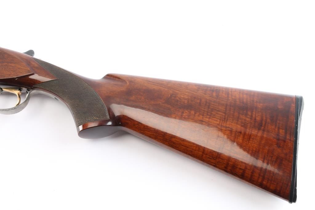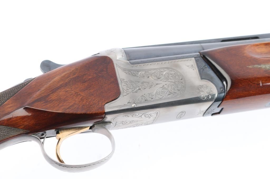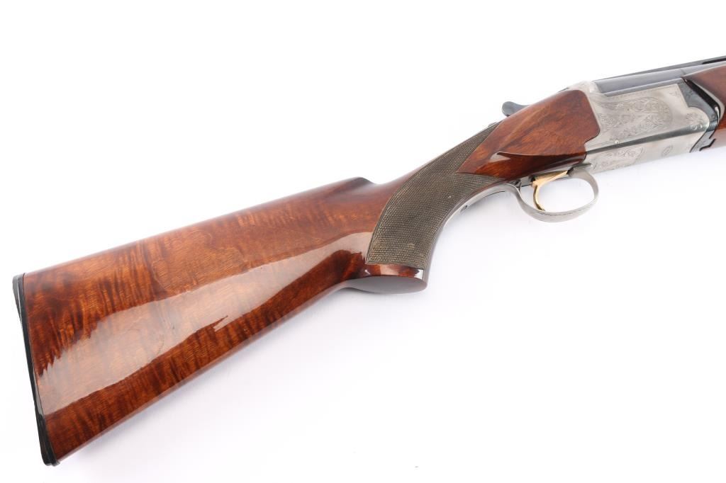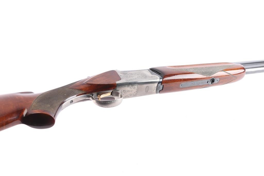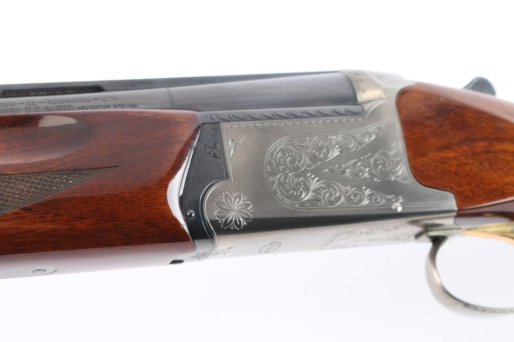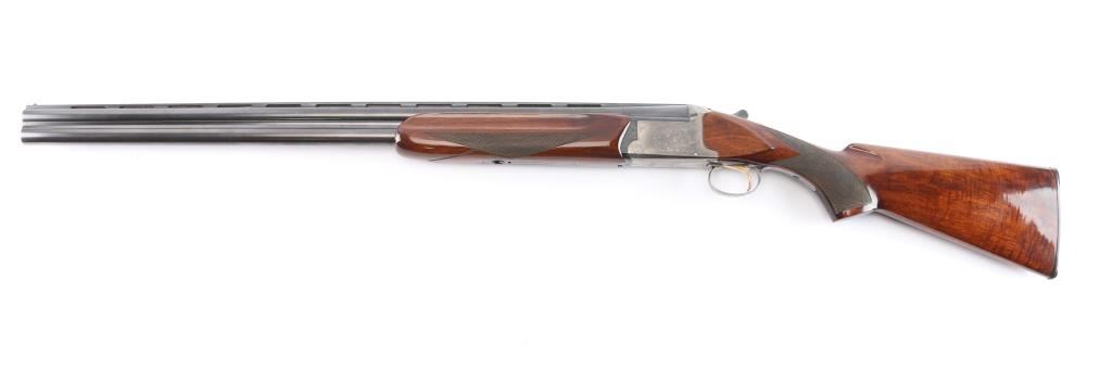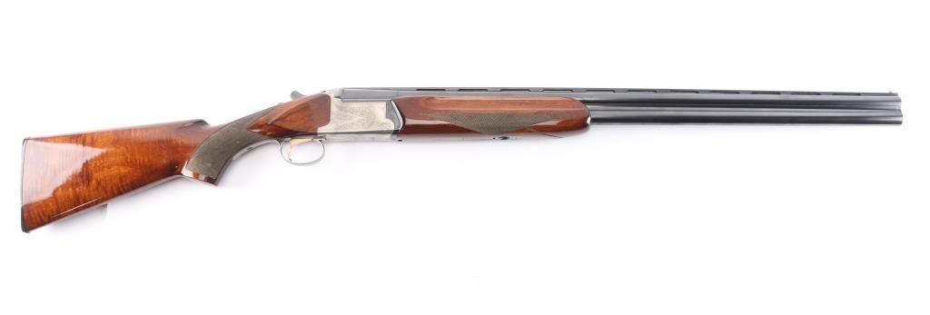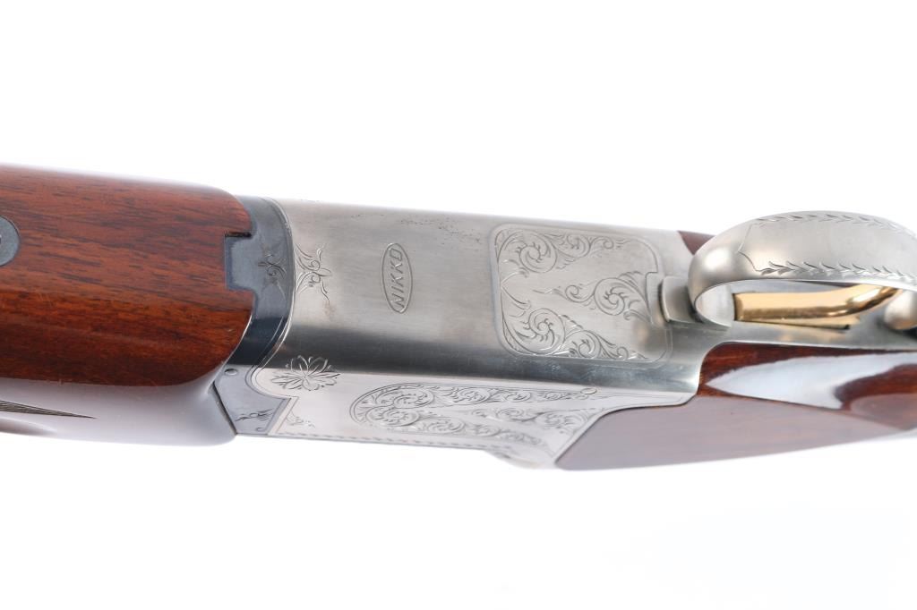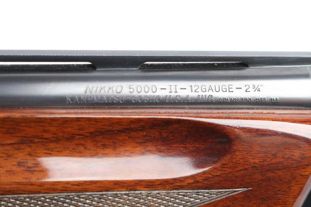 #k307641.Japanese made over and Under 12 Ga. Imported by Kanematsu-Gosh USA of Arlington, IL. Shotgun. 28" vent rib barrels, brass sighting bead, 2 ¾ shells, tang safety/barrel selector, high gloss checkered forend and stock, factory buttplate, receiver and trigger guard are engraved, trigger is gold plated. bores are mirror bright, high polish blue is excellent, stock and forend are near excellent with very small Japanese characters on the top right buttstock, hard to notice.