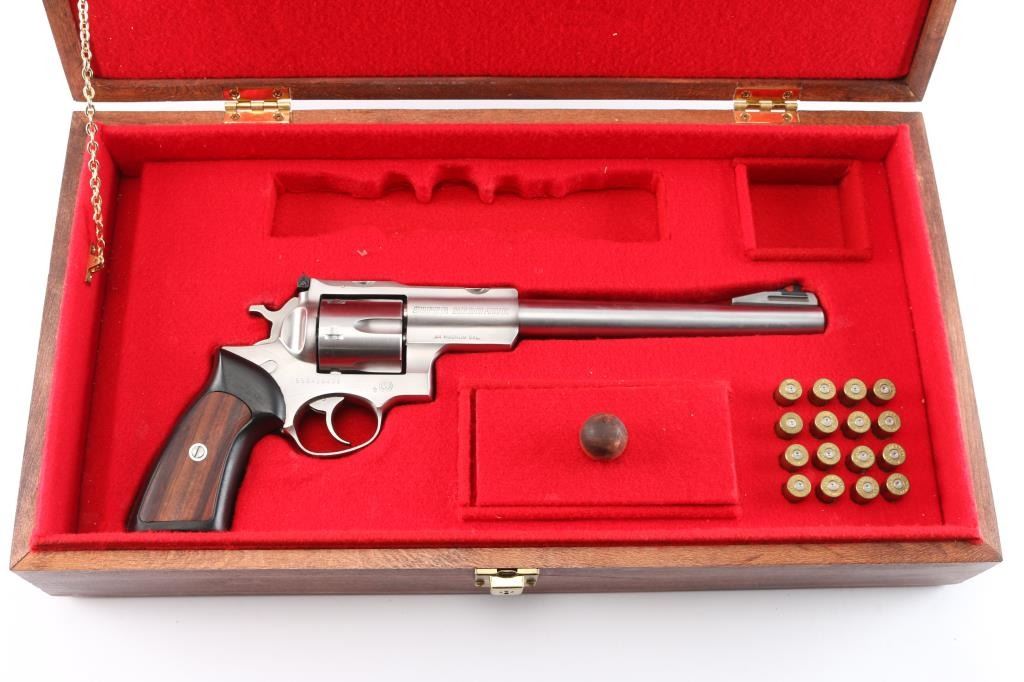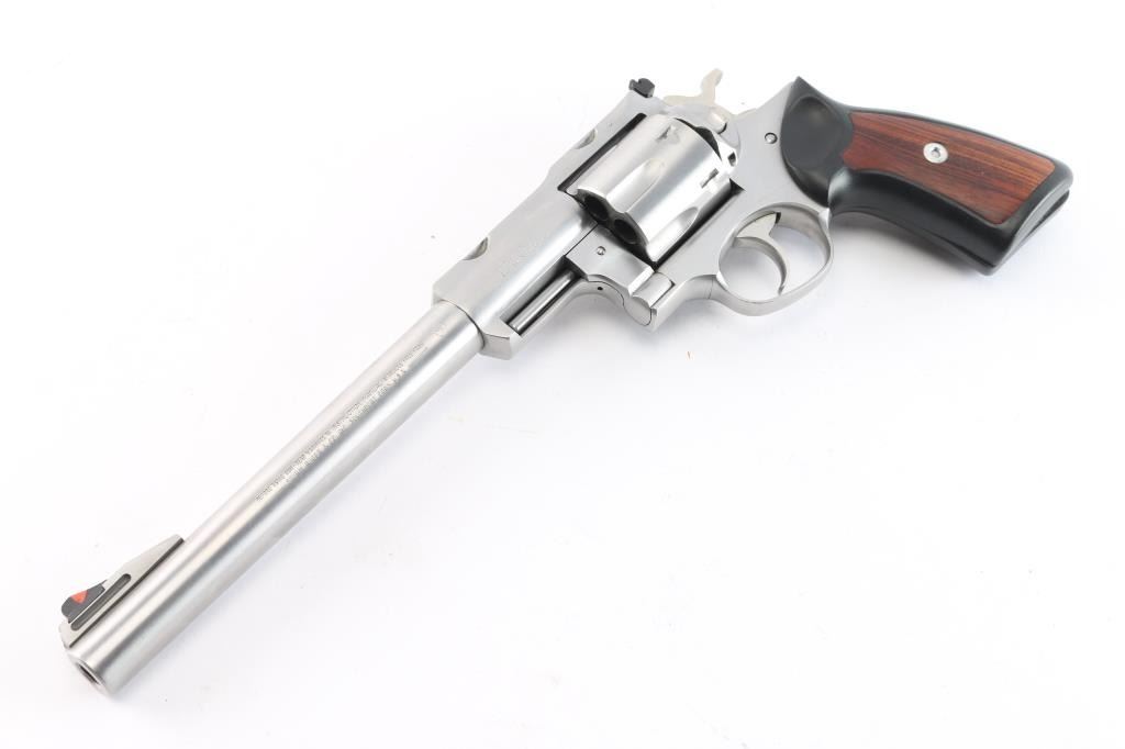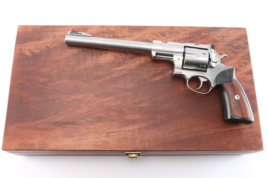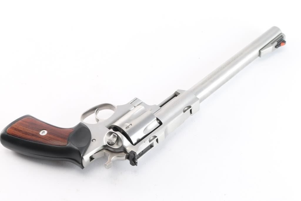 Large frame stainless steel double-action revolver chambered in .44 Magnum. Manufactured 1988. Features a stainless finish, 9.5" barrel with serrated ramp front sight and orange insert, pinned adjustable white square notch rear sight, shrouded ejector rod, fluted six shot cylinder, smooth trigger, checkered hammer spur, transfer bar safety, extended frame with integral scope base cuts in the top strap, two piece black rubber grips with wood inserts. Bore is excellent/bright with strong rifling. Retains approx. 96% metal finish with faint drag line and minor scratches. Grip is very good. Action is smooth with tight lockup. Comes with a nice wooden display case with form fitted red felt lining for pistol and scope, has kay and some .44 Magnum brass and bullets.