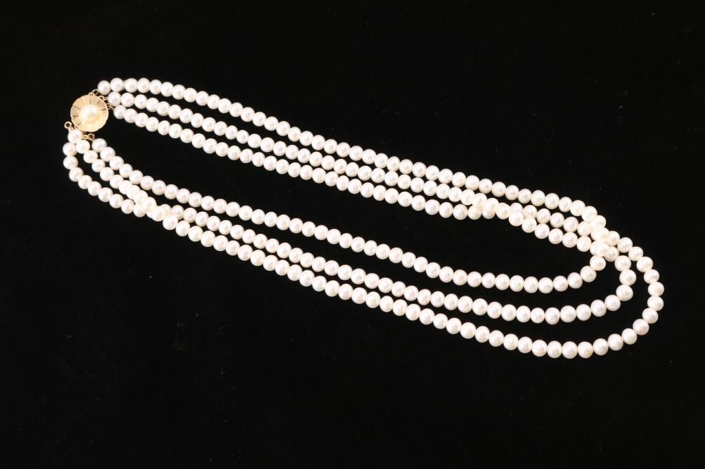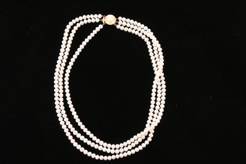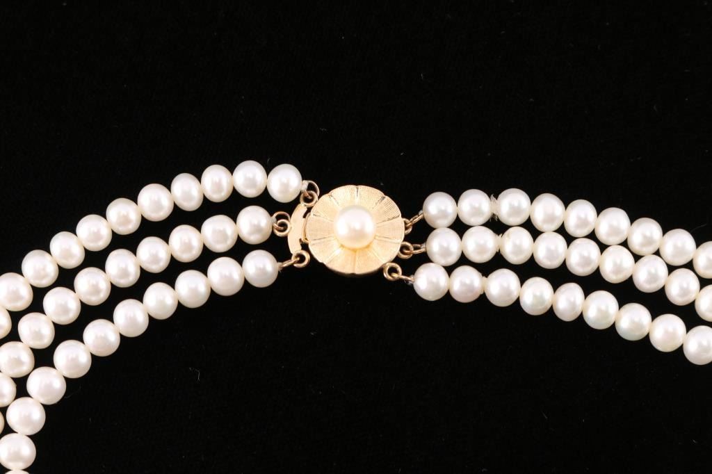 With 14k yellow gold flower clasp with pearl center. Measures 8 1/2" from drop.