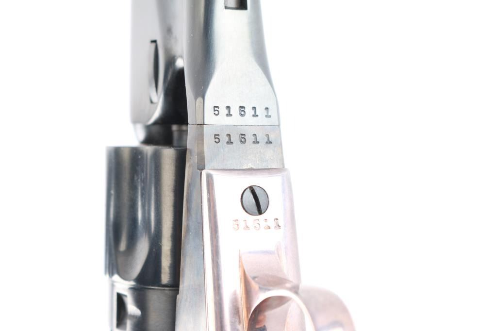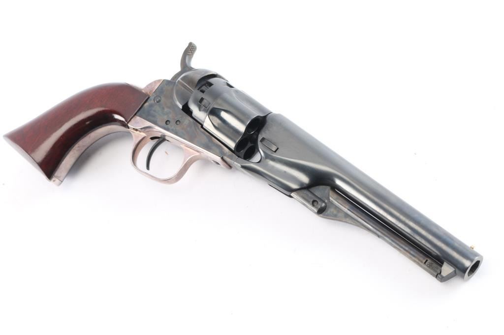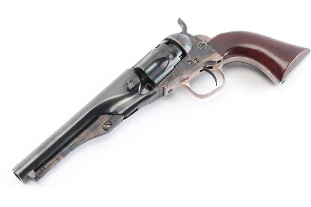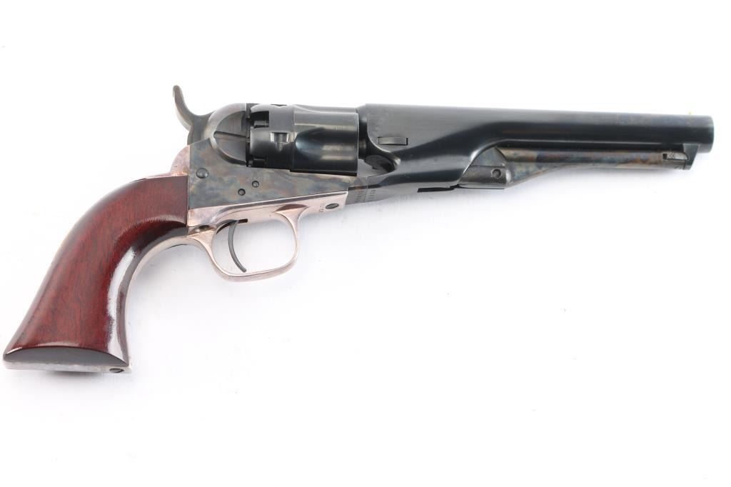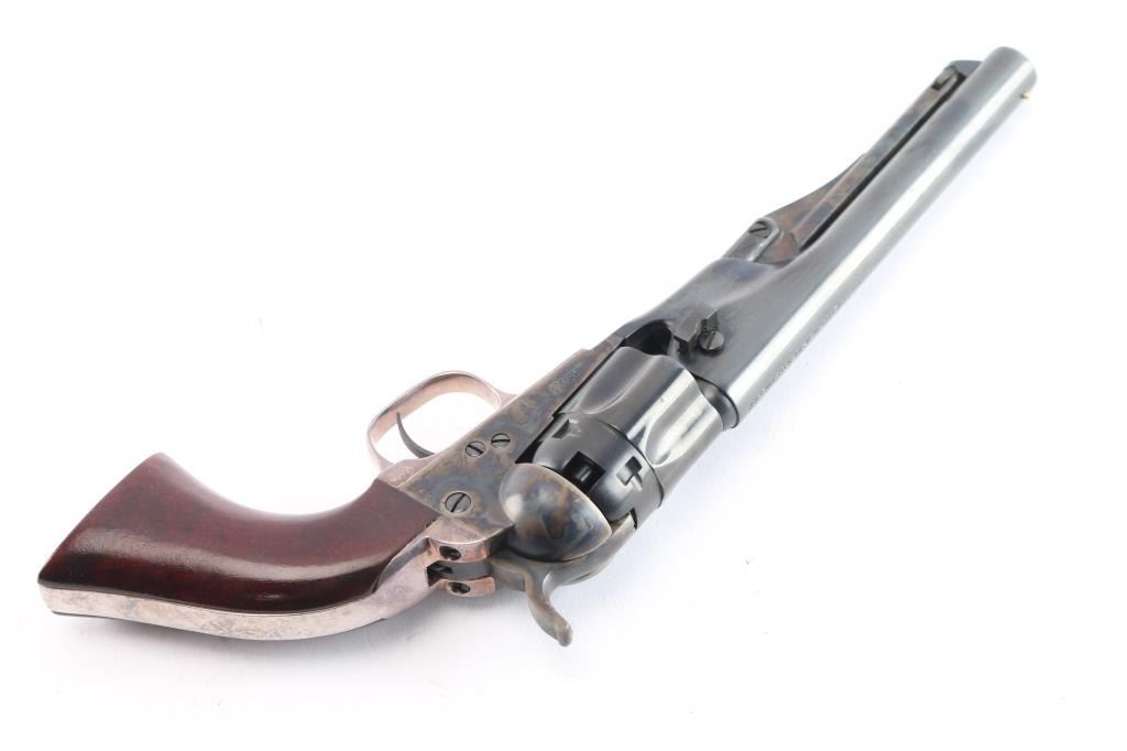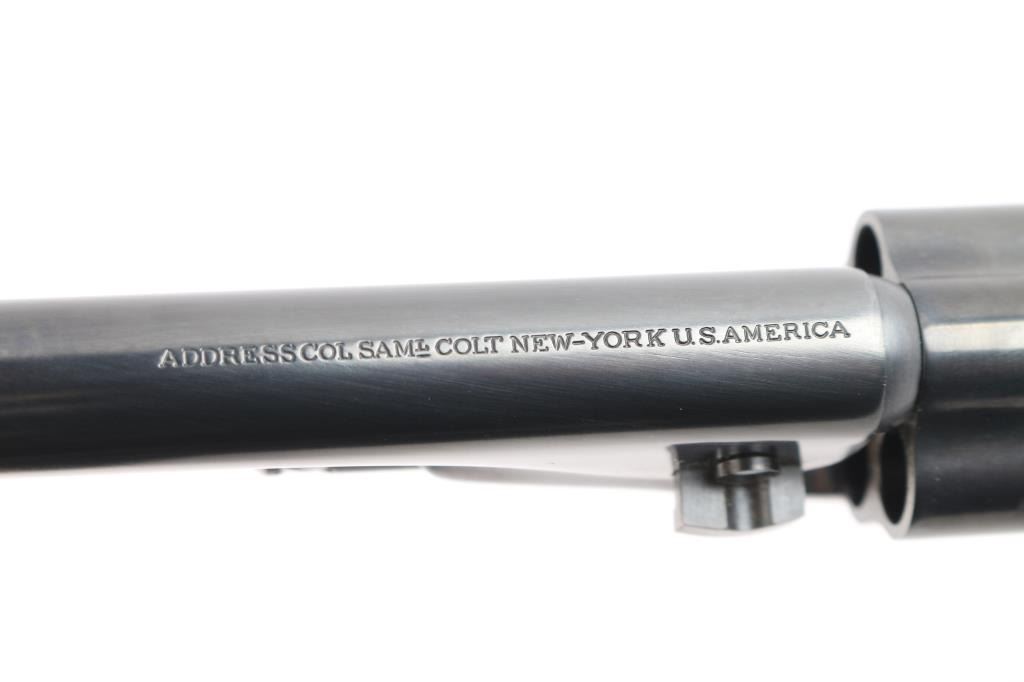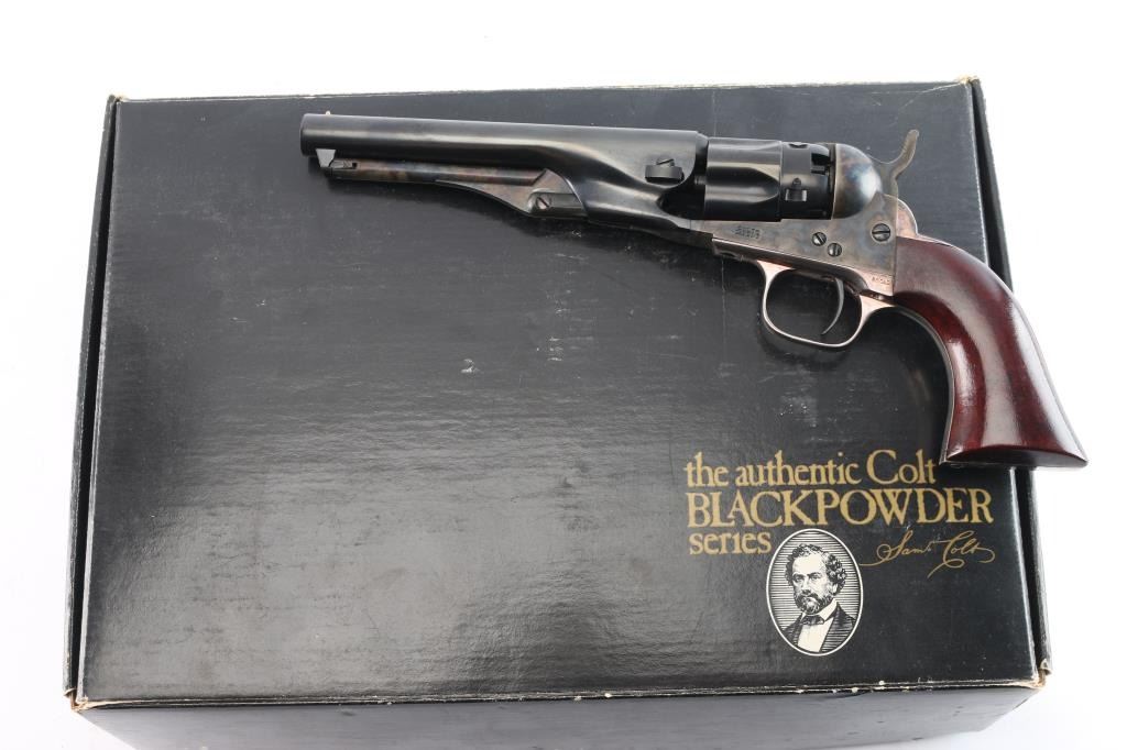 Second Generation' Finely crafted single action percussion revolver chambered for .36 caliber ammunition, manufactured circa 1979-1984. 'The Authentic Colt Blackpowder Series' Black powder percussion revolver with 5 1/2" barrel, bead front sight, rear sight is a “V” notch at the front of the hammer, visible when cocked, checkered hammer spur, three screw side plate, smooth trigger, silver-colored grip module, blue finish with case colored frame, hammer and loading lever, one-piece wood grips. Barrel is marked "Address COL SamL Colt New York U.S.America," left side plate is marked "Colts Patent" and left flat of trigger guard is marked "36 cal". Revolver is in like new condition. Includes the original box with matching label, form fitted foam lining, instruction manual/paperwork.