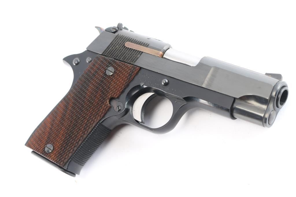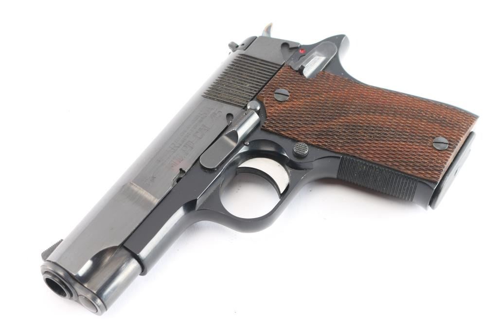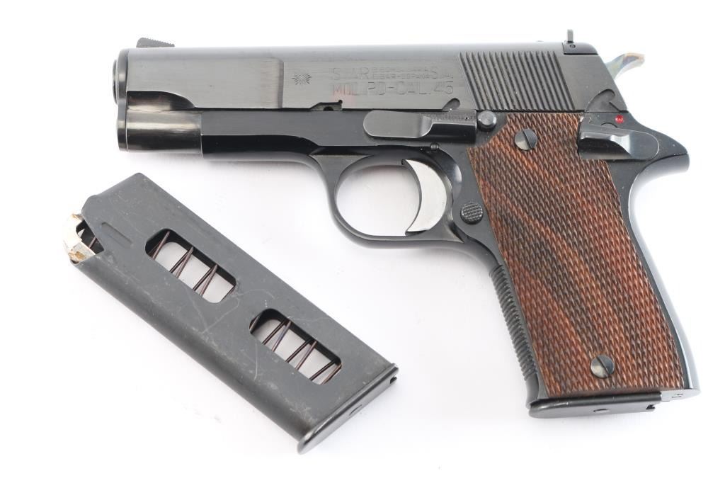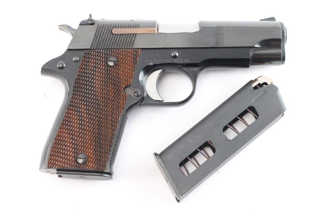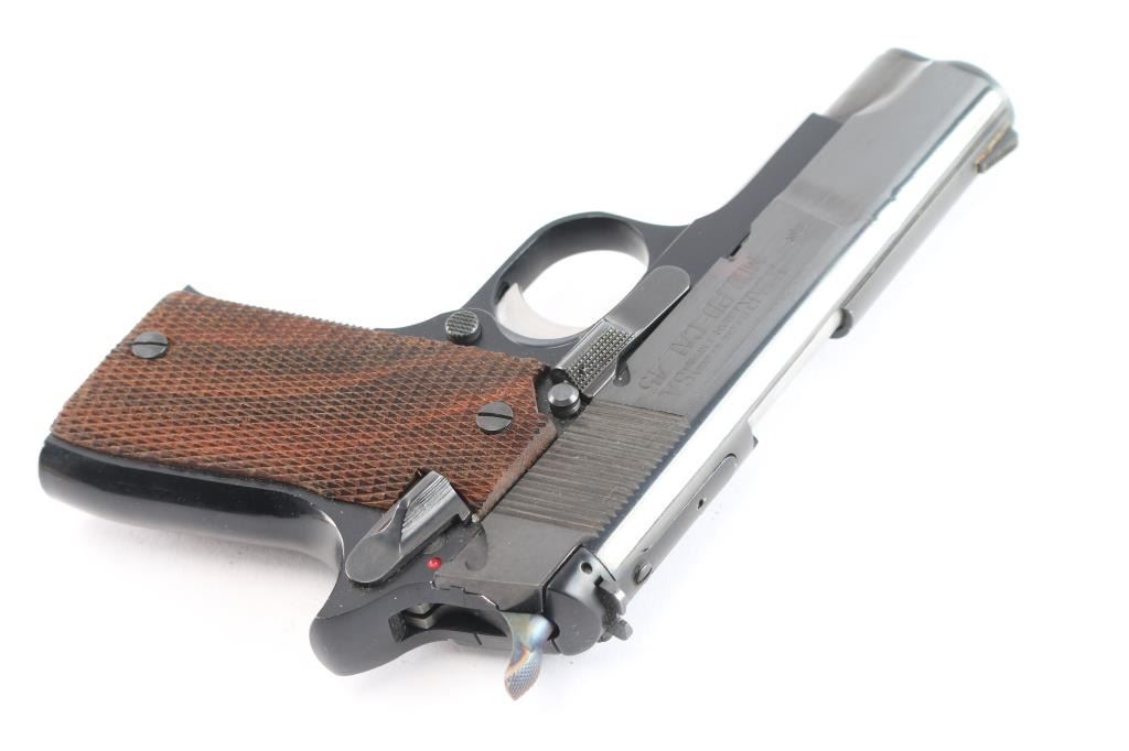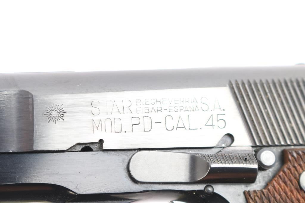 Spanish made Semi-Automatic pistol manufactured from 1975-1990. Imported by Garcia Corp. Compact/lightweight. Blue finish with checkered wood grips 3.9" barrel. 6+1 capacity. Serrated blade front and adjustable square-notch rear sights. Serrated chrome trigger, grooved fore strap. "PD" (for "Pete Dickey", the Interarms employee who convinced Star to design & manufacture this model) stamped on heel. Left frame mounted manual safety. Action is smooth/tight. Bore is excellent/bright. Grips are excellent. Blue finish is about 98% with minor scratches. Comes with two 6-rd magazines. The magazine sticks in the well a little, needs cleaning, oil.