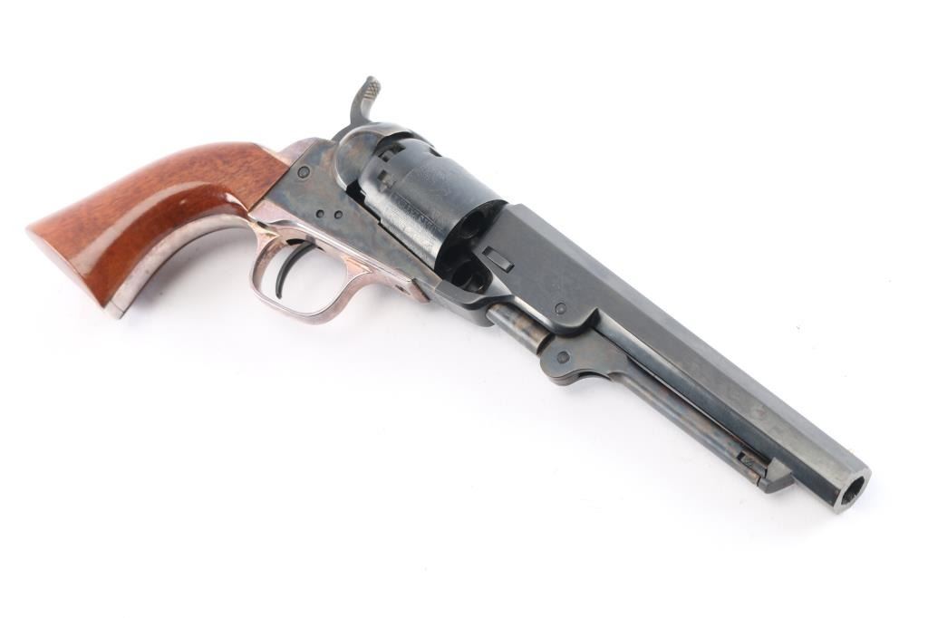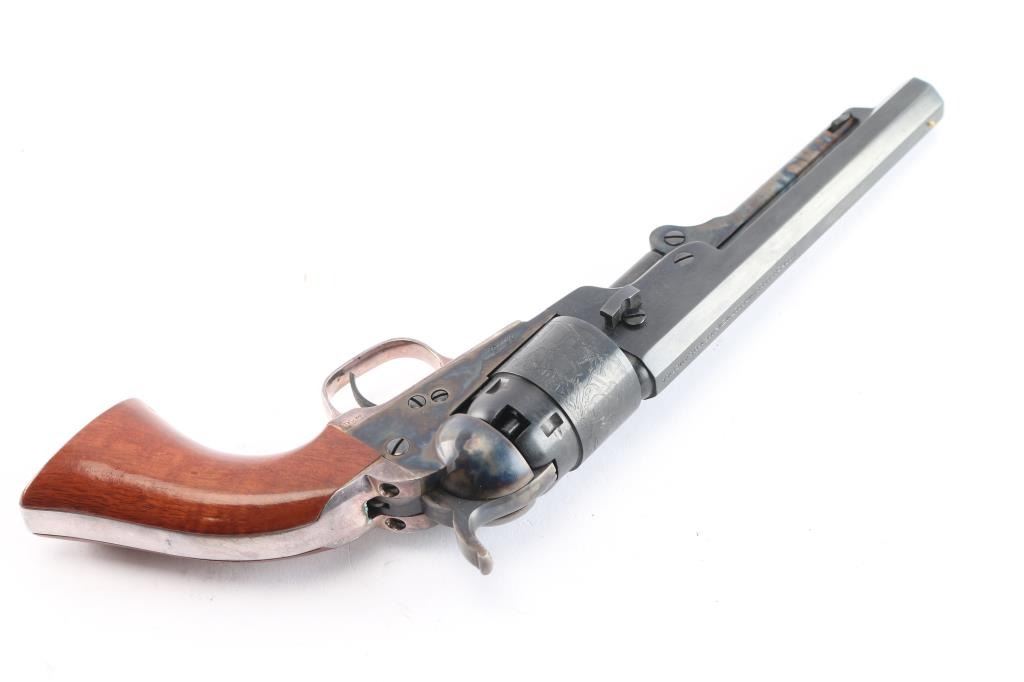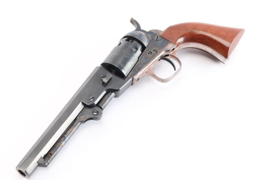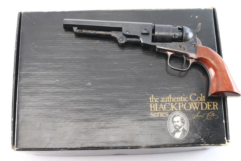 Second Generation' Finely crafted single action percussion revolver chambered for .36 caliber ammunition, manufactured circa 1979-1984. Features a blued & case hardened finish, 5.5" octagonal barrel, brass cone front sight, 'v' notch rear sight cut in the hammer lip, smooth thin trigger, knurled hammer spur, non-fluted five shot cylinder with roll stamped stage coach hold-up scene, silver wash backstrap & triggerguard, blue finish, case colored frame, hammer, loading lever and one-piece varnished walnut grip. Includes the original factory black cardboard with foam inserts and documents. Revolver is in like new condition.