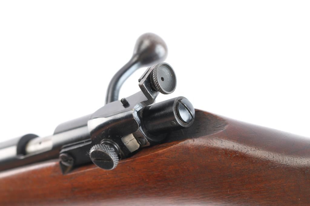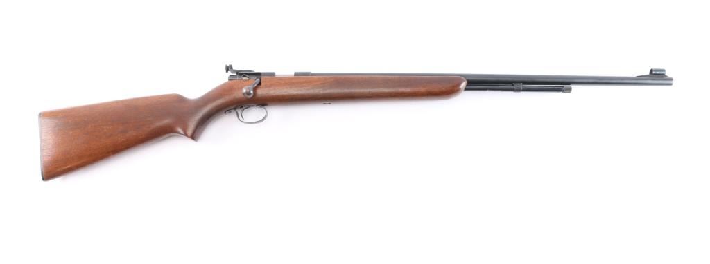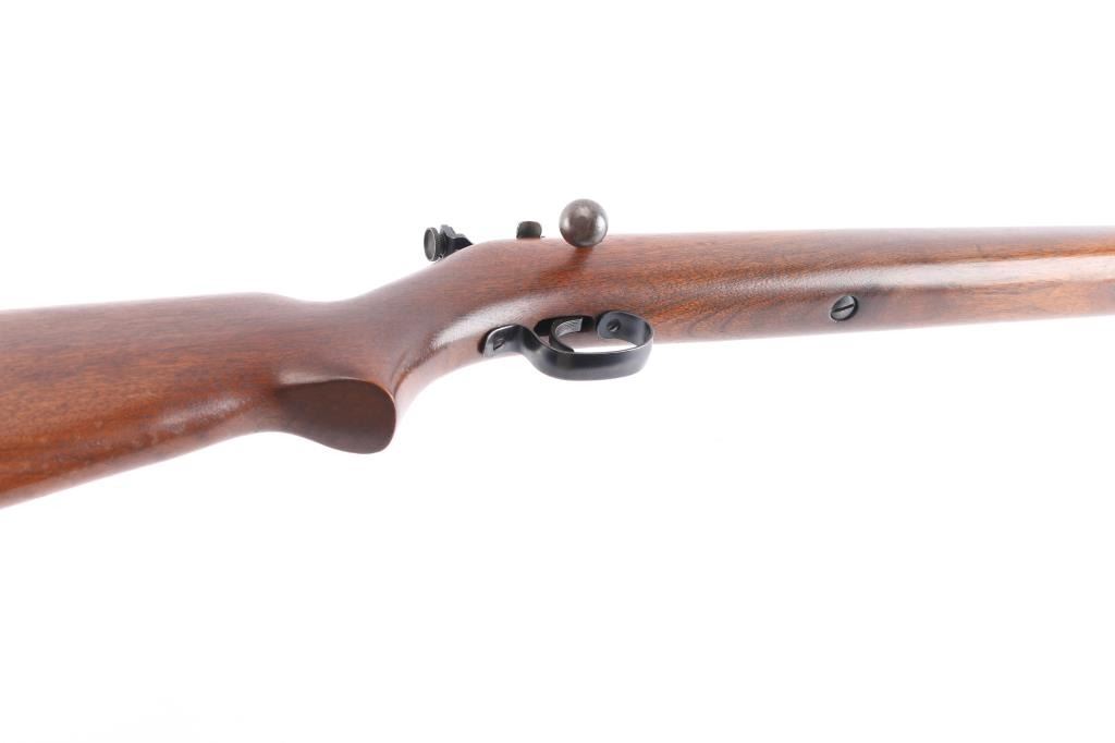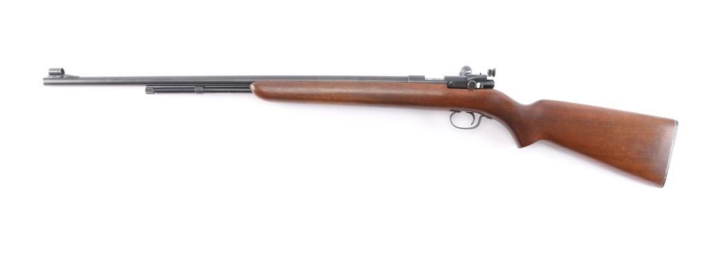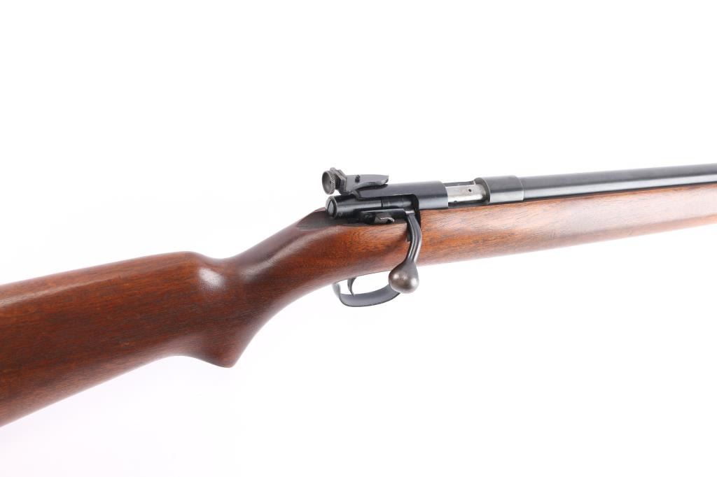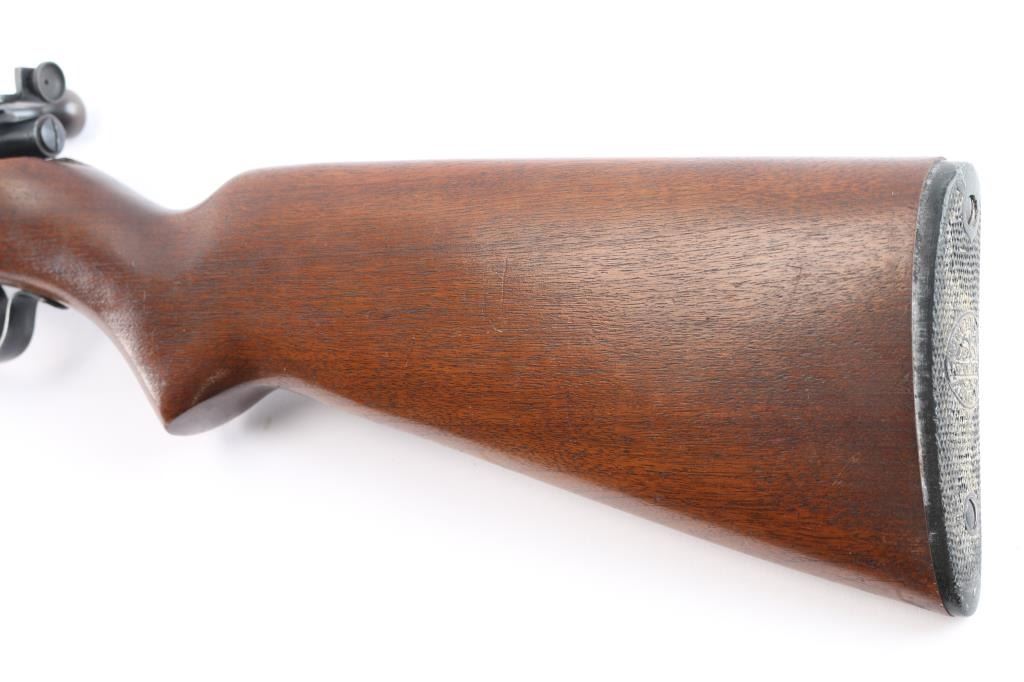 Bolt action rimfire repeating rifle manufactured circa 1938-1949. Features 25" barrel, 2/3 length tube magazine,hooded blade/bead front, 80A peep sight installed on the left receiver, manual safety, blued finish, metal trigger guard, smooth wood semi-pistol grip stock, factory composition buttplate. Bore is excellent/bright. Retains 99% blue finish. Stock is very good with a few minor dings.