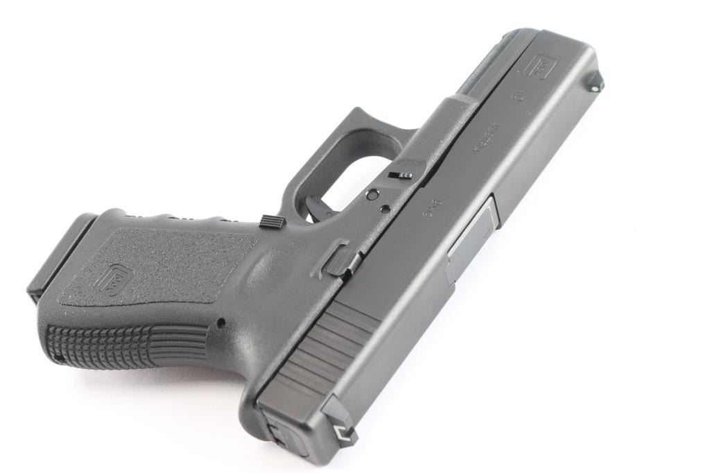 Austrian semiautomatic pistol, imported by Glock Inc, Smyrna GA. Features approx 4" barrel, fixed front sight with white dot, dovetailed adjustable rear sight with white outline, striker fired, manual safety in trigger, extended mag release button. Factory 10-rd magazine. All black finish. Numbers match on frame, slide, barrel. Bore is pristine. Pistol is like new. Includes original factory hard case with cleaning brush, cable lock, magazine loader and three spare factory 10 rd magazines. (4) Total. Matching label.