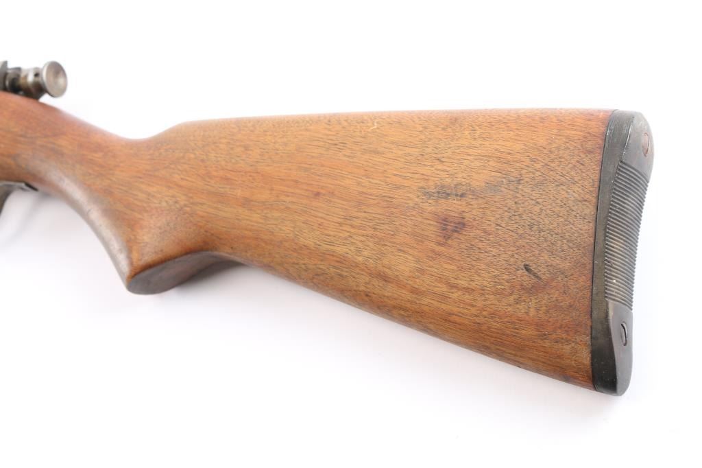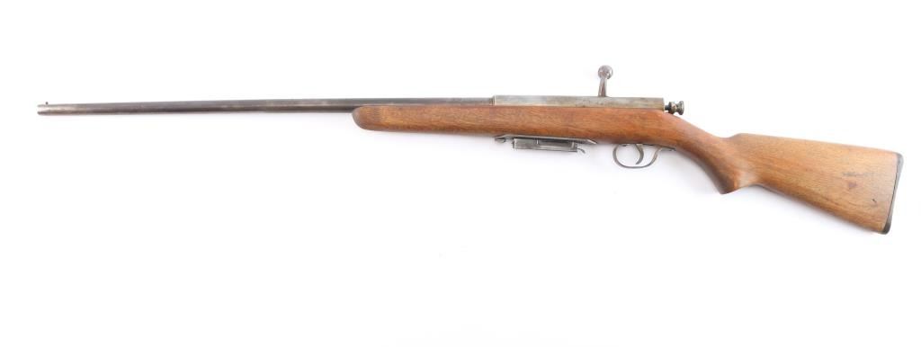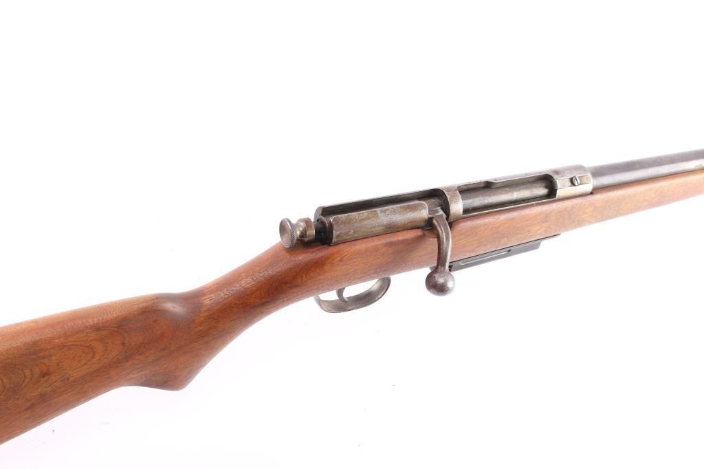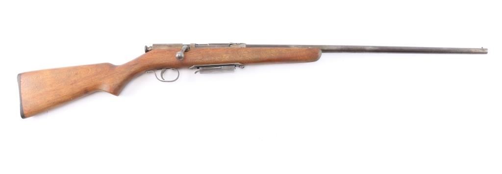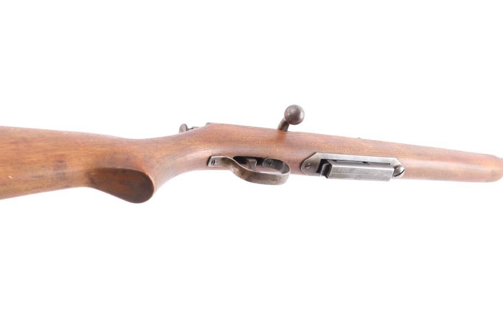 Bolt action, magazine fed, .410 shotgun for both 3" & 2 1/2" shells. Manufactured between 1937 and 1945. 24" barrel with brass sighting bead, cocked indicator. Action works well, needs oil, wood is very good sound, blue is about 40%, mostly on the barrel, some scattered brown patina and the bore is very good/bright.