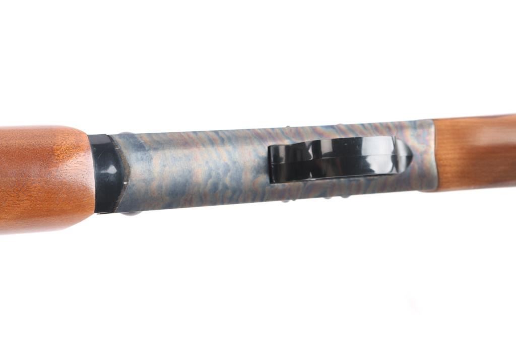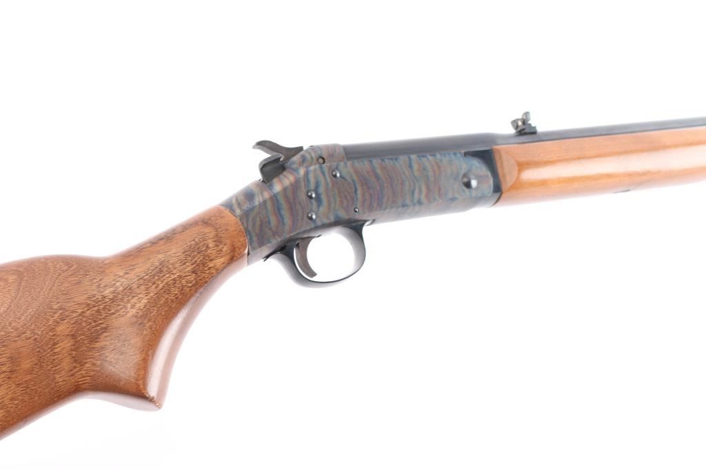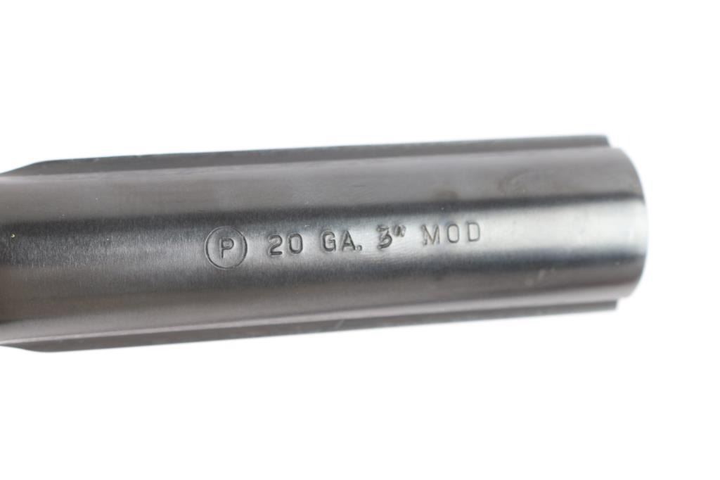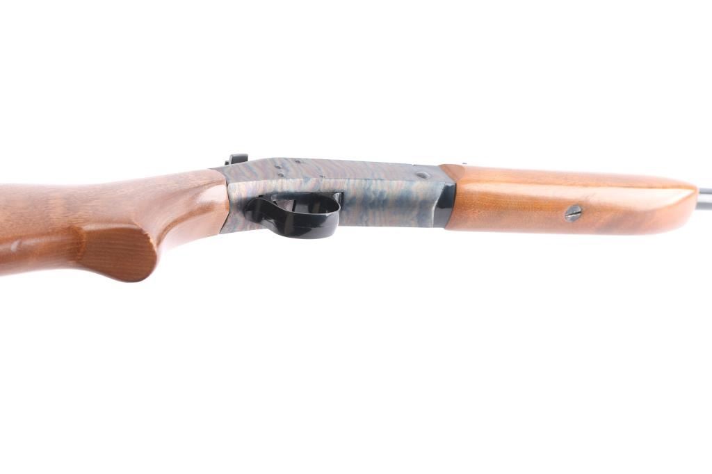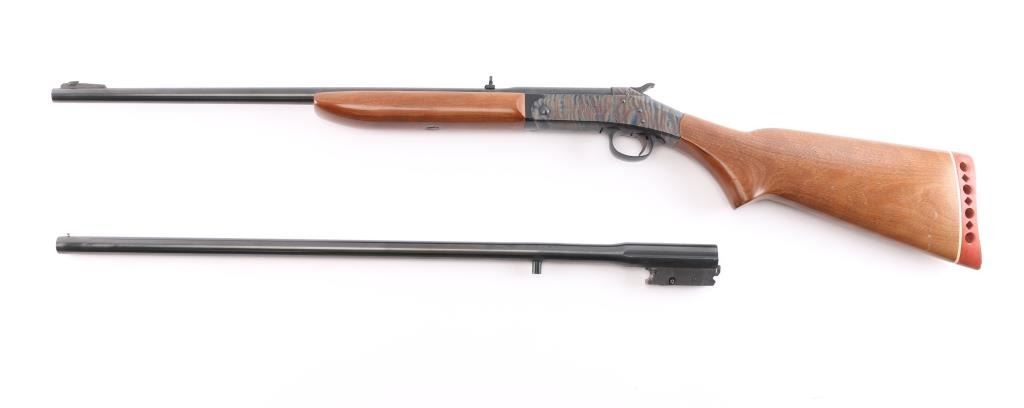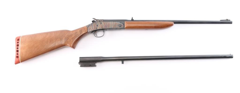 Two barrel set. Single shot break action shotgun/rifle with installed 22" blued barrel chambered in 30-30, raised blade front and flip, adjustable u-notch rear sights. Barrel drilled/tapped for optics. Case colored receiver, plain semi pistol grip wood stock and forearm, factory rubber recoil pad. Bore is excellent/bright, case color is vivid, blue and wood are near excellent with some minor scratches. Comes with a excellent condition 26" 20 gauge barrel, 3" chamber, fixed Modified choke, brass sighting bead.