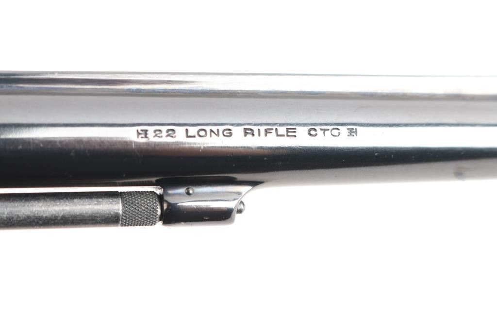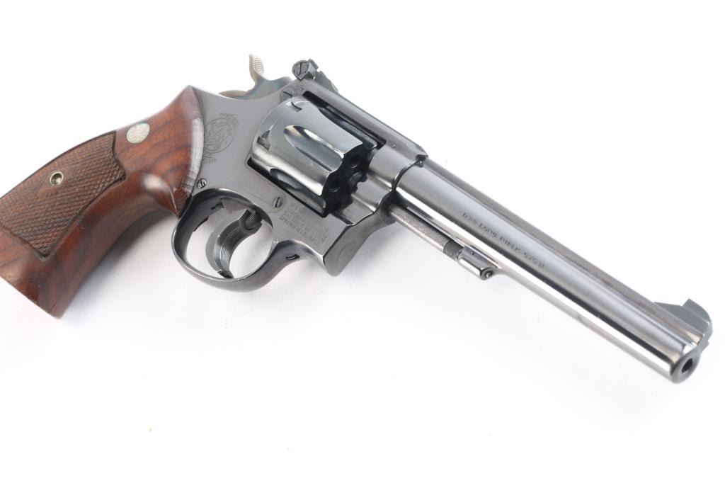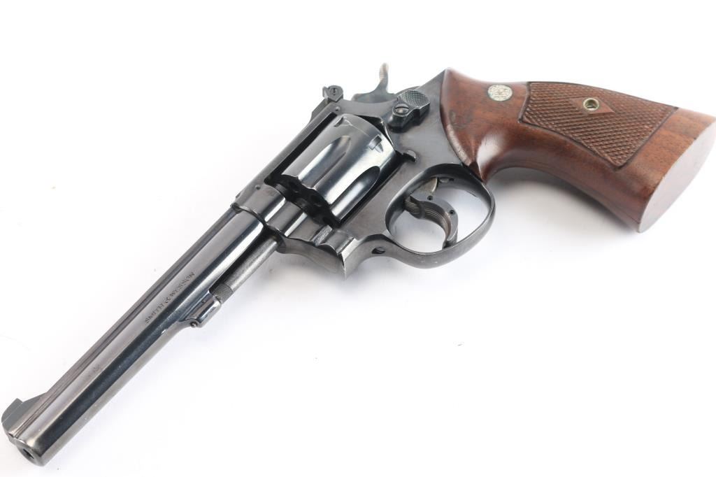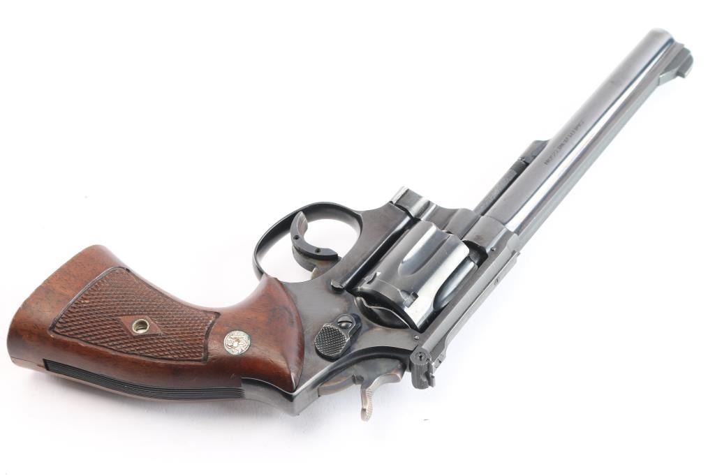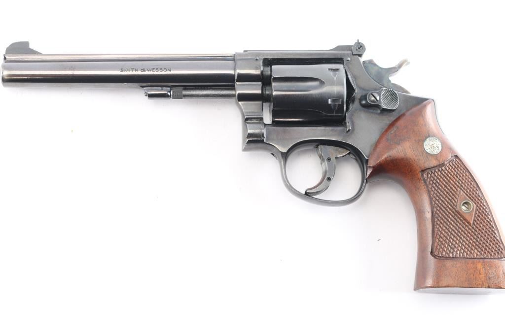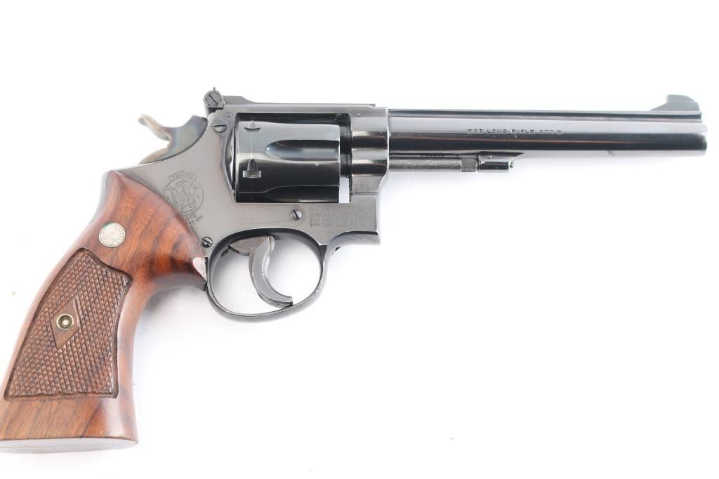 'Pre-Model 17’ Medium frame double-action revolver chambered in .22 Long Rifle. Mfg. circa 1955. Features a blued finish, pinned 6" barrel with partially serrated wide sighting rib, raised patridge front sight, fully adjustable micrometer click rear sight, non-shrouded ejector rod, fluted six-shot cylinder with counterbored chambers, case hardened & serrated .265" trigger with adjustable travel stop & aftermarket wide trigger shoe installed, case hardened .375" semi-target hammer, five screw square butt K target frame with six groove grip straps, and diamond checkered target grips with silver Smith & Wesson medallions. Matching serial numbers found on the frame, barrel, cylinder, and extractor star. Revolver retains approximately 95% of its blued finish, which appears to be a high quality refinish, showing edge wear, small scattered scratches, and a drag line on the cylinder. The action is smooth with tight lock-up, the bore is excellent, and the wood grips are good with wear, blemishes & small losses.