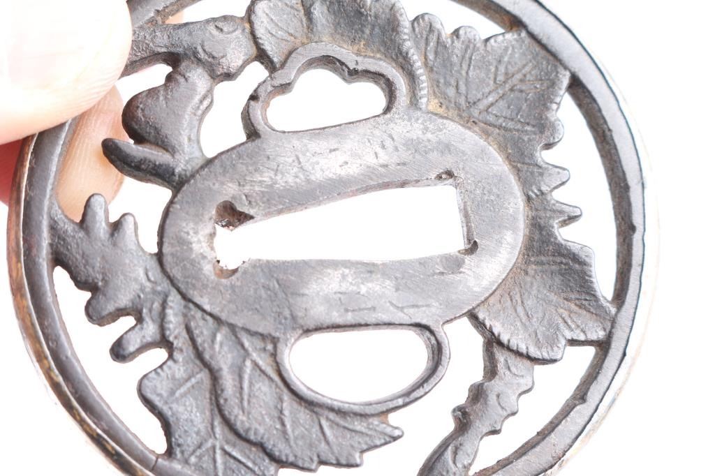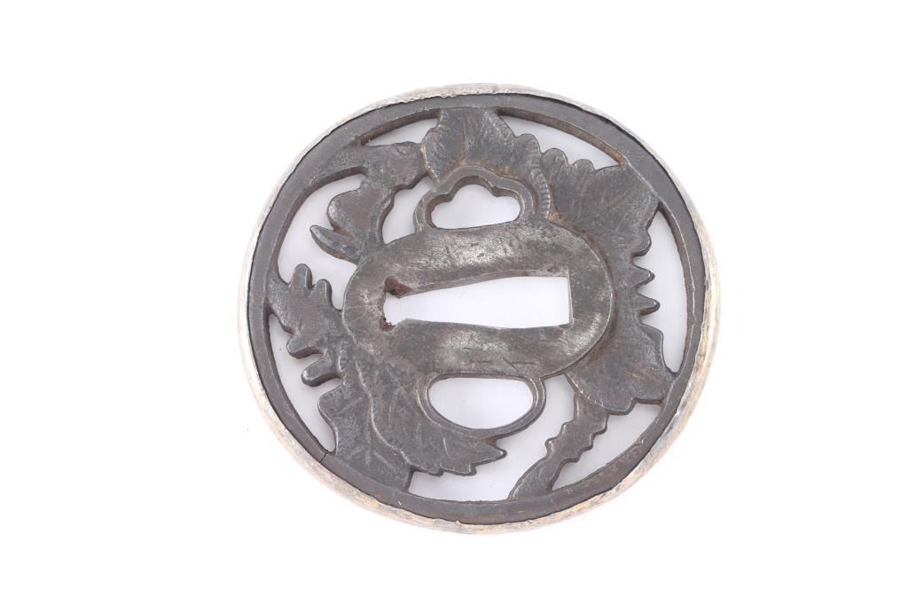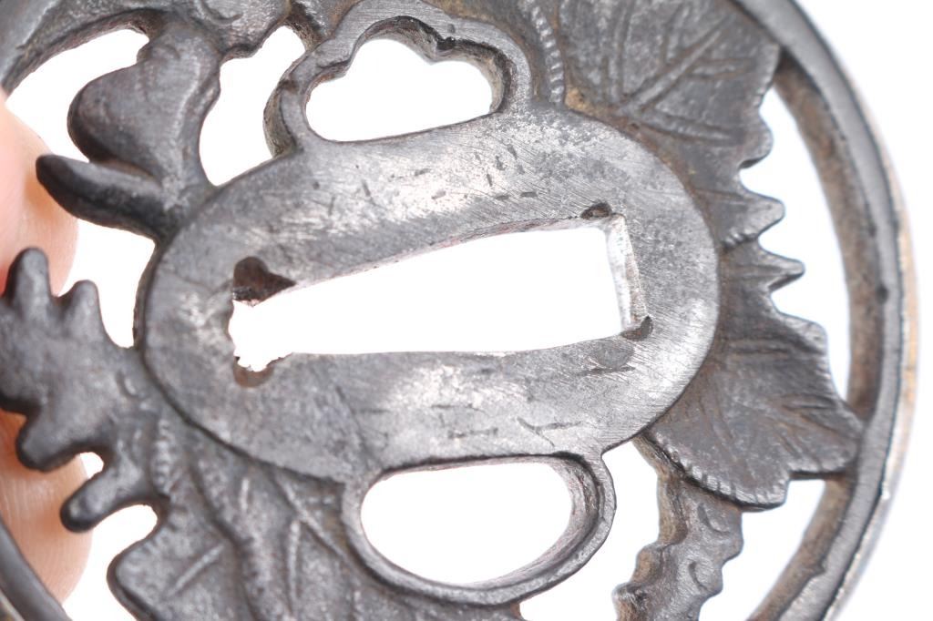 Edo era iron Maru-Gata katana Tsuba Signed "Echizen Kinai". (Feint) With an openwork maple leaf design with soft brass alloy rim. Diameter 2½". Kinai school of Echizen (17th to 19th century). Possibly a branch of the Miochin (Group IV), this family was founded by Ishikawa Kinai, who moved from Kioto to Echizen province [Japanese text] and died in 1680. The succeeding masters, however, bore the surname of Takahashi. All sign only Kinai [Japanese text], with differences in the characters used and in the manner of writing them. Signed Echizen no ju Kinai saku (“made by Kinai, residing in Echizen province”),