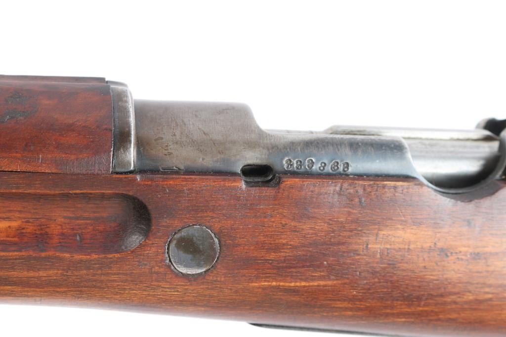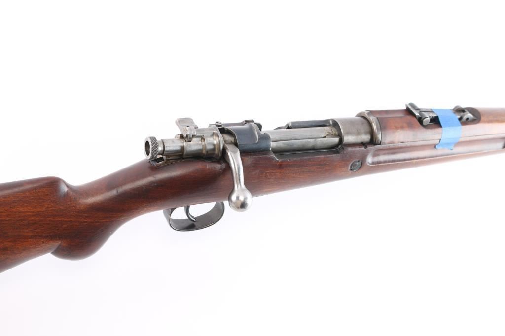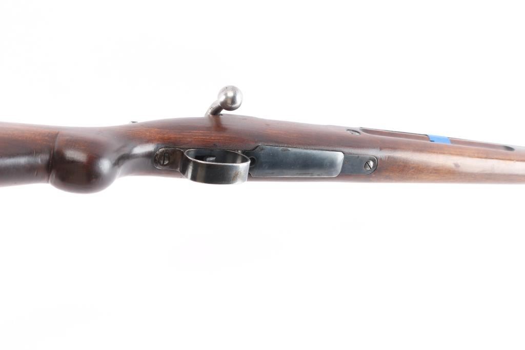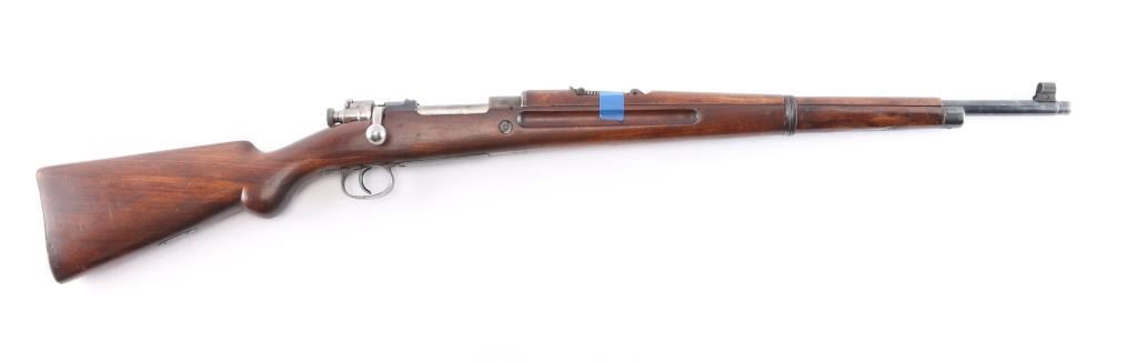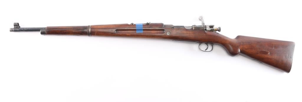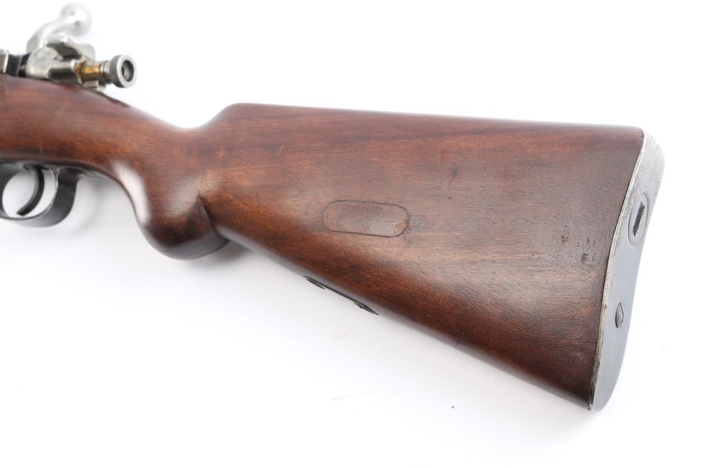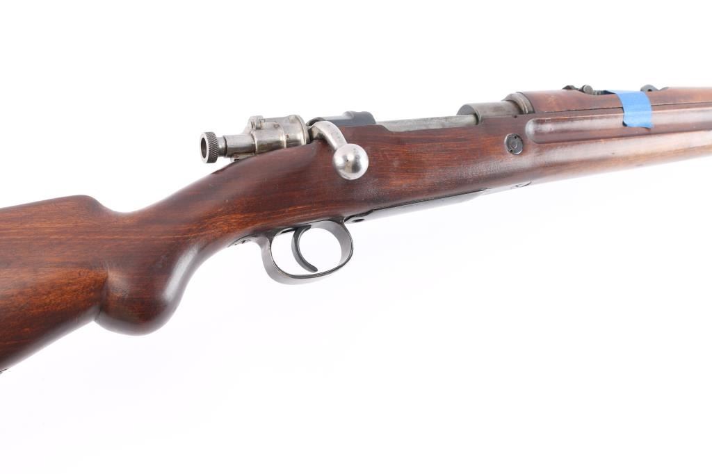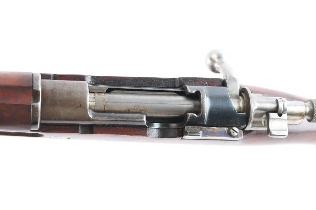 Military bolt action rifle based on the 98 Mauser, with a small ring and a cocking piece similar to the 1903 Springfield. The light weight of these actions have made them desirable for sporting conversions. Features 23.5" barrel, hooded post front & tangent rear sight, manual safety. Stock ends with a simple nose cap, and the single barrel band lacks a swivel. Rear swivel slot in butt is filled with a flat steel filler piece. Bore is bright. Retains 70% finish with color fading and losses. Bare metal bolt is clean and smooth. No crest on receiver. Rear sight missing the spring. Wood is mostly very good condition, with some wear or erosion forward of the band. The lower portion of the grip has been re-shaped to offer a more pronounced knob.