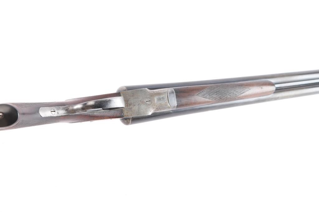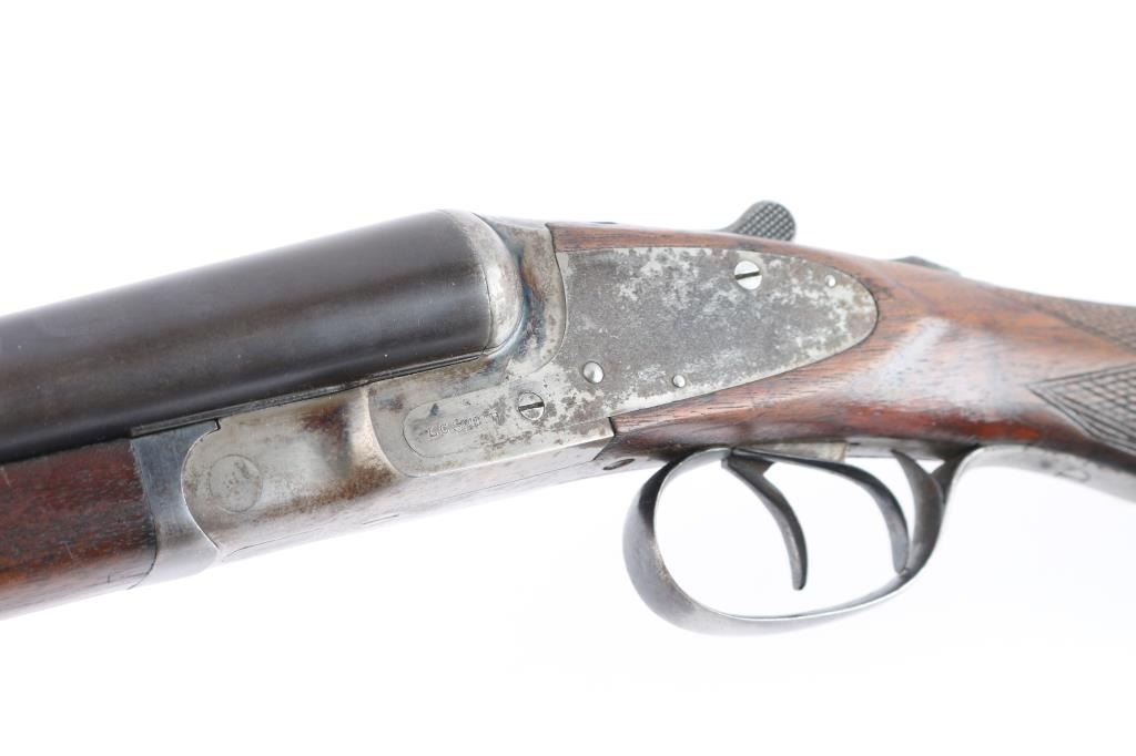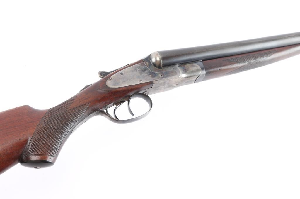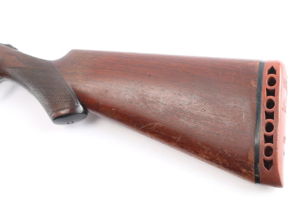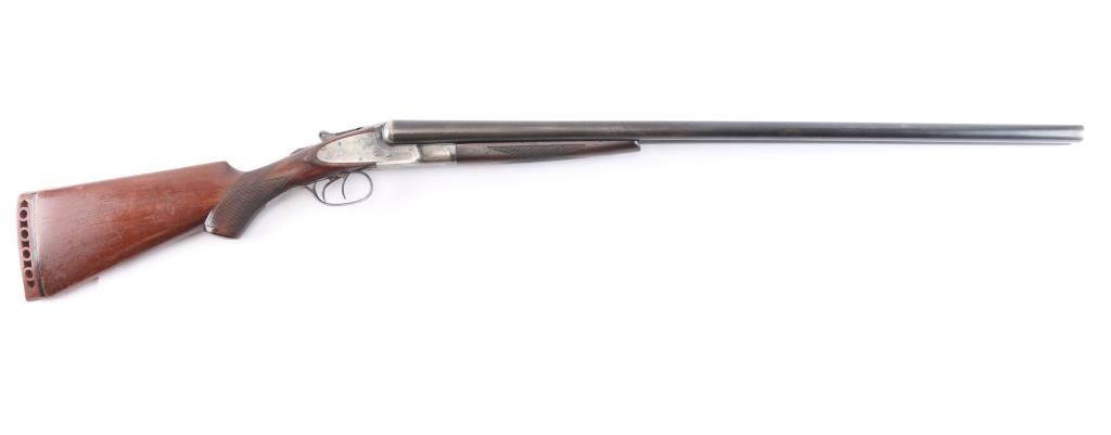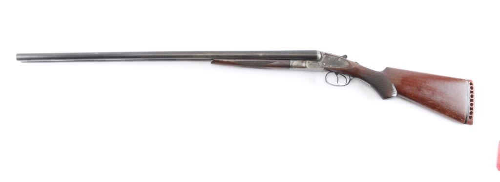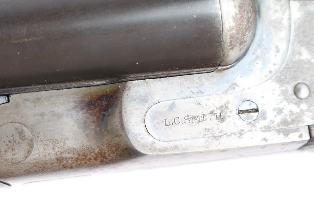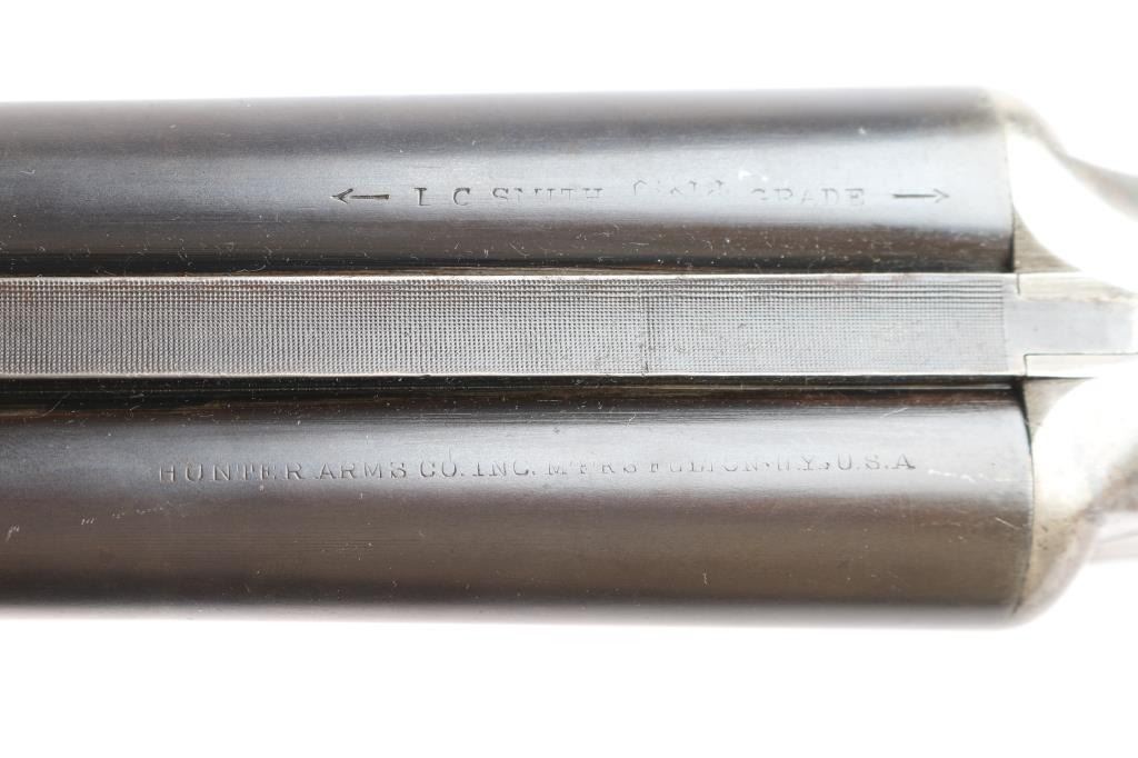 Double barrel side lock shotgun. Left barrel marked "Hunter Arms" (Fulton NY address), right "L.C. Smith Field Grade" manufactured circa 1912-1950. Features 30" blue barrels (choked IM/CYL), low matted rib with brass bead front sight, case color action with removable side plates, double triggers, tang safety, top lever, single extractor, walnut stocks with smooth splinter forend & semi-pistol gripped shoulder stock, smooth black plastic or composition grip cap, Red Head vented rubber recoil pad. Bores are very good/bright. Dull blued finish on barrels, starting to turn a gray patina ,case colors are about 20% with handling loss on the receiver and bottom metal,, the left receiver and bottom metal have scattered patches of pitting, wood is very good/sound with minor scratches/dings. LOP is 14 3/4"' to front trigger.