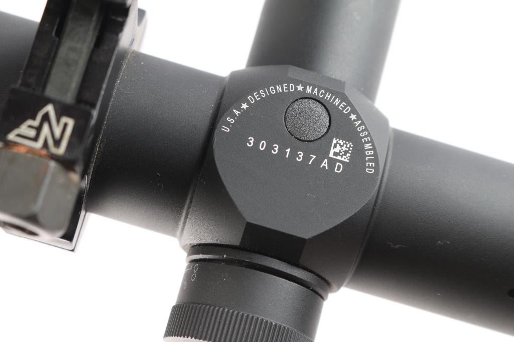 High quality second focal plane rifle scope with matte black finish, fine duplex reticle, variable 8.5-25x magnification, 50mm objective lens, side focus parallax adjustment, capped turrets with ¼ MOA adjustment, 30mm tube, 2.5” sun shade, front Alumina flip-back lens cover and Nightforce aluminum 1.25” rings. Optics are clear/sharp and the scope body shows minor scuffs/wear. Condition is Very Good to Excellent.