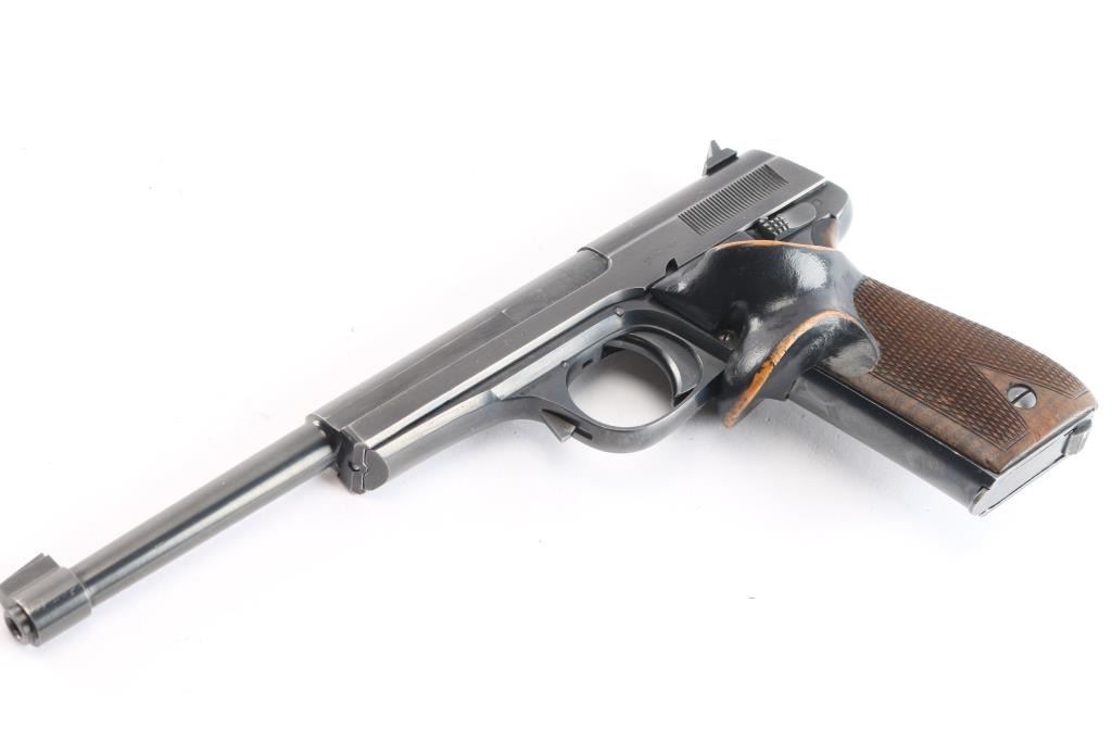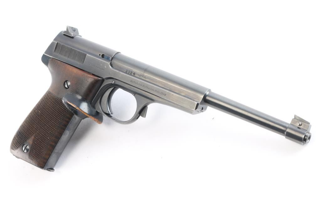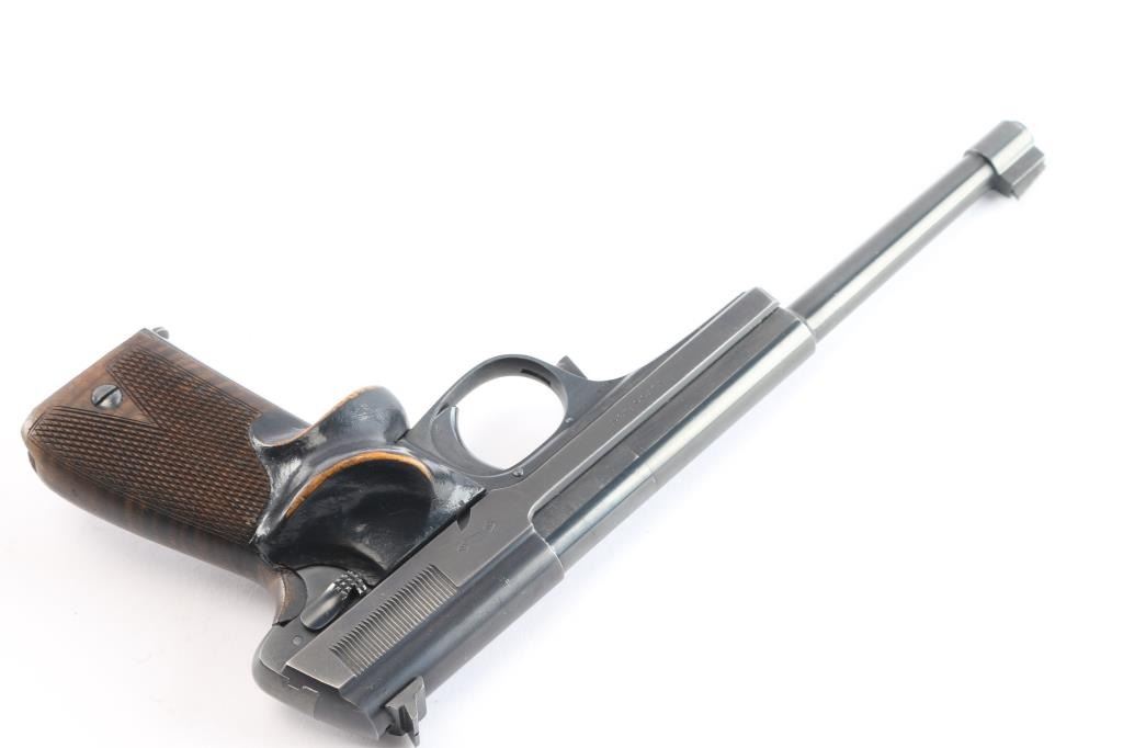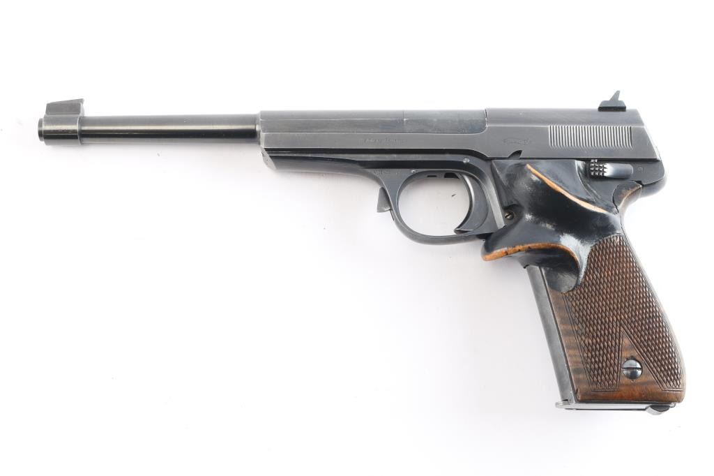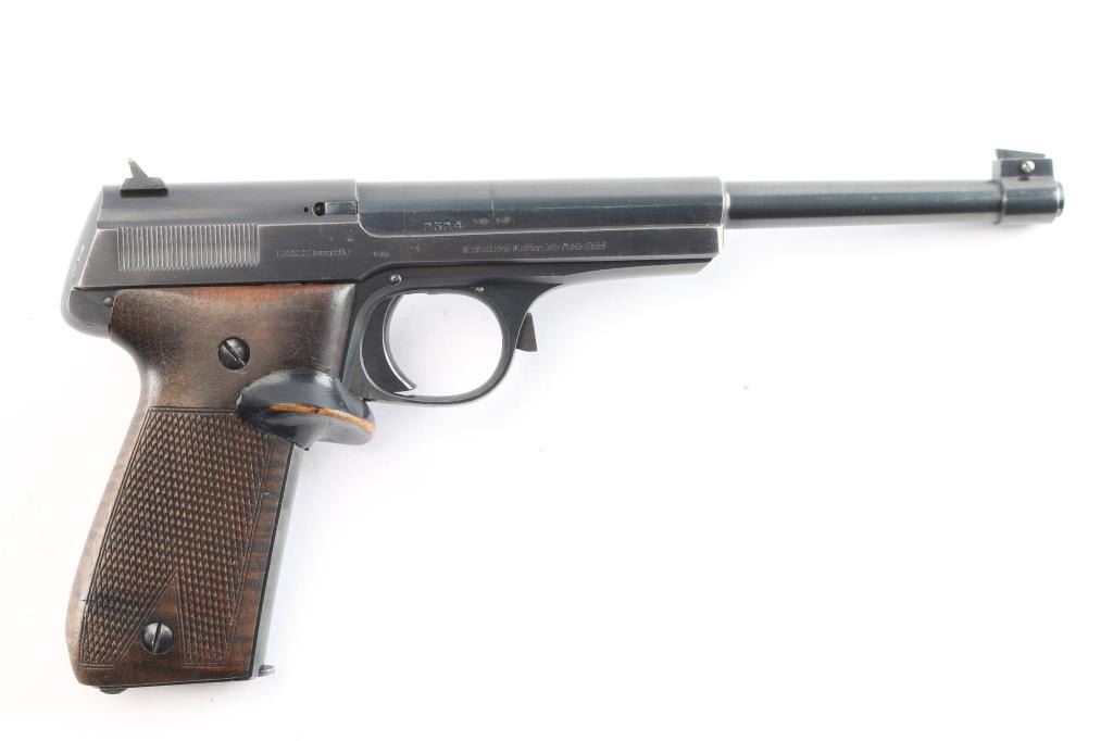 Standard configuration Walther 1925 Olympia with adjustable front and drift rear sight having 7.5 barrel with open slide. Usual Walther markings on left and right sides of slide. Triple set of Crown/N proofs on right side of slide, barrel and frame. Checkered wood grips with custom made additional target thumb rest, black paint has worn on edges. Mag is marked “28”. Bore is excellent. Retains 95% with edge wear. Condition is NRA Very Good. C & R Firearm