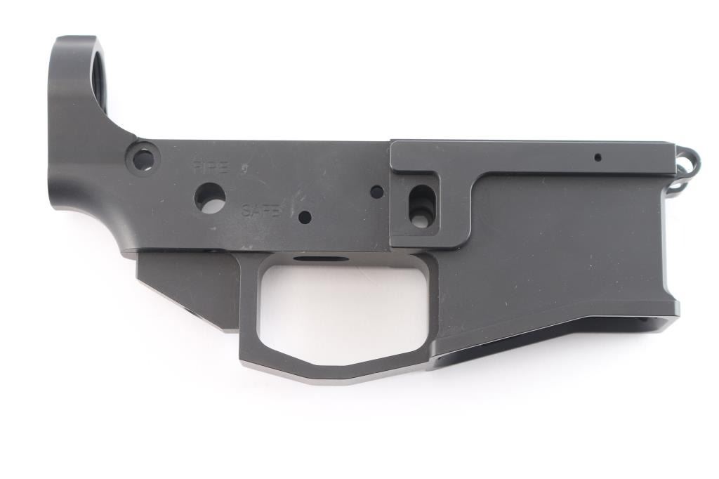 #10000 AR-15 pattern stripped lower receiver. Precision CNC-machined from aerospace T6 heat-treated 6061 billet aluminum with integral ‘winter’ triggerguard, flared magazine well and black anodized finish. Receiver retains nearly all of its original finish and shows no signs of use.