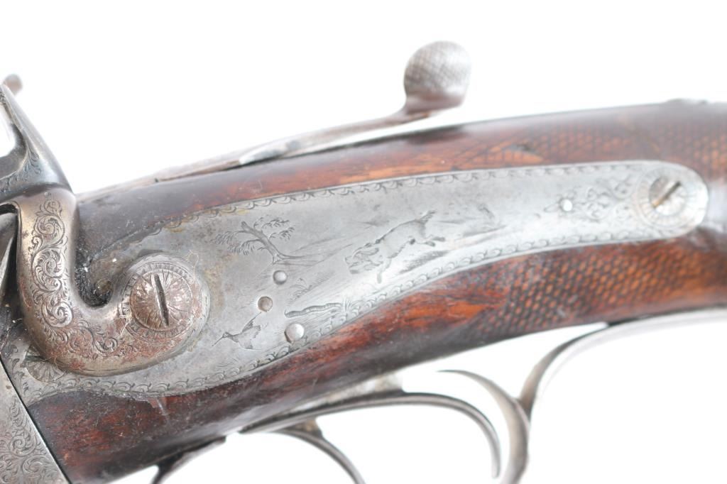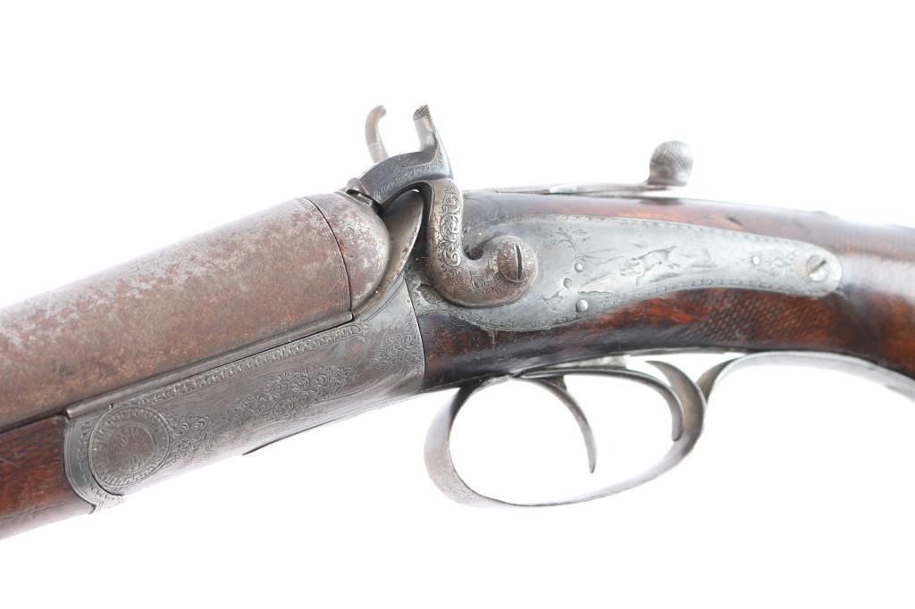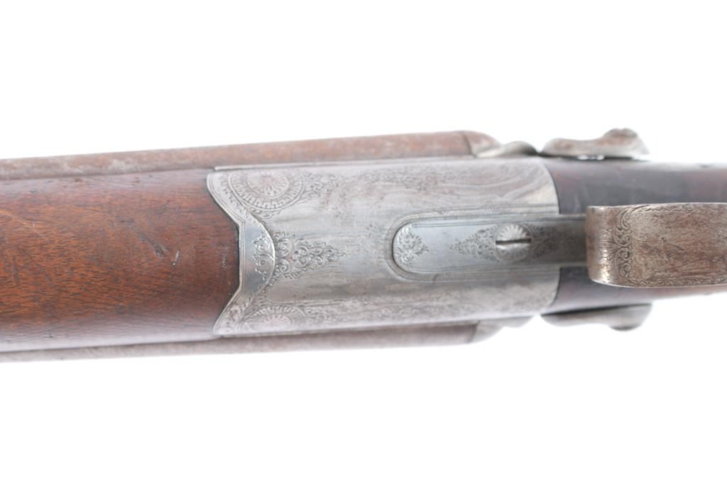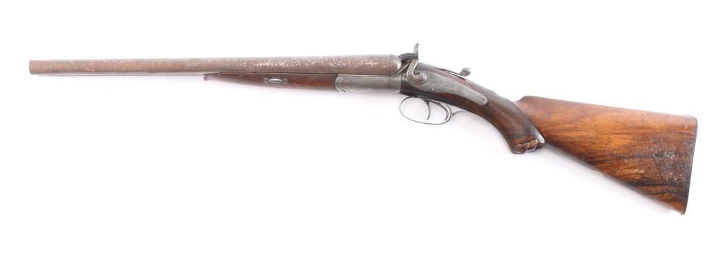 W & C Scott were one of the major English gun makers dating back to 1834. the company merged with P. Webley & Son in 1897 to form Webley & Scott Revolver and Arms Co Ltd, but continued to market high-end shotguns under the W&C Scott brand. Damascus barrels with sighting bead have been shortened to 18 3/8", to coach configuration, looks period done. Top lever, single extractor, double triggers, company name on conclave rib, action, hammers and tangs have very nice floral/scroll engraving, the locks and triggerguard have engraved scenes of dogs chasing game birds. the stock and forearm are checkered, smooth steel buttplate, German silver round initial plate inletted in underside of stock and the grip cap has a " grotesque face" craved into it. Underside of barrels stamped "13" (.710" bore) with Birmingham proof marks. Chokes measure IC and M. Bores are good, bright , some scattered light pitting, barrels lock-up tight, the left hammer spur is broken off, the wood is overall good/sound witha small crack and chip on the forearm, the engraving is crisp/clear and the barrel have surface rust/light pitting, mostly on the left barrel. May improve with cleaning.